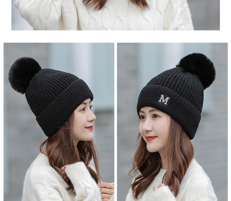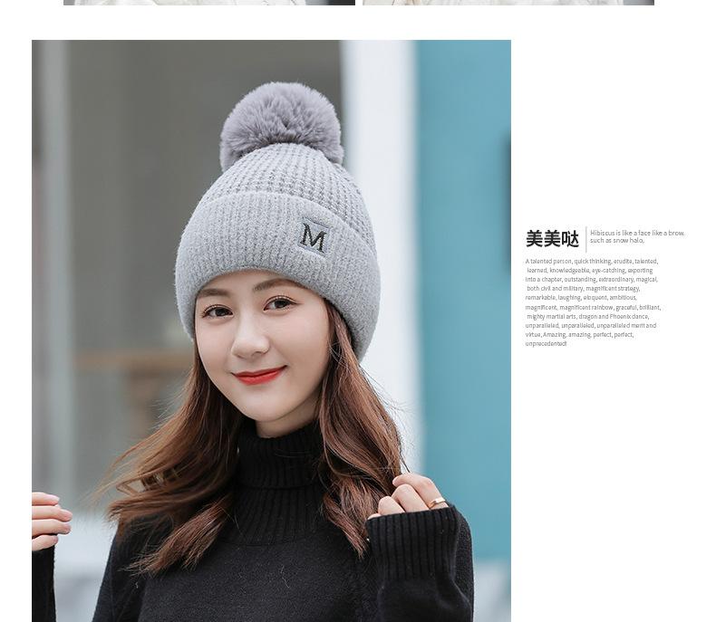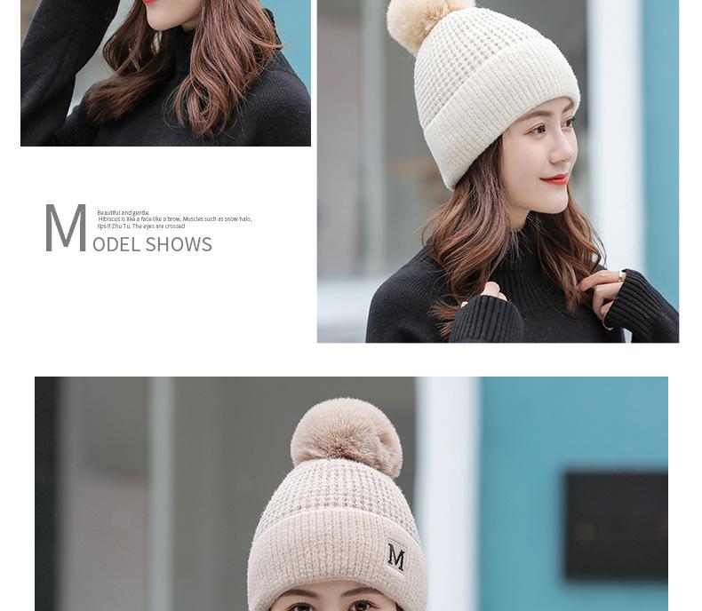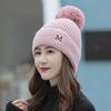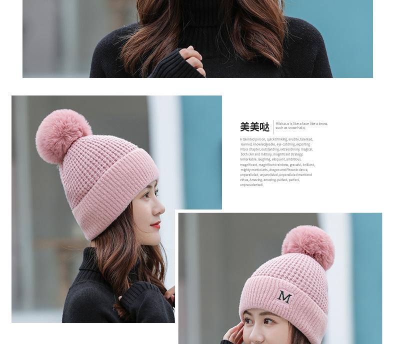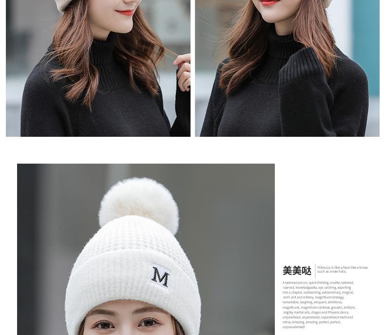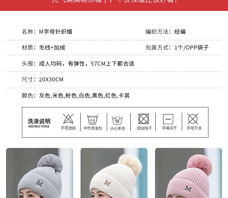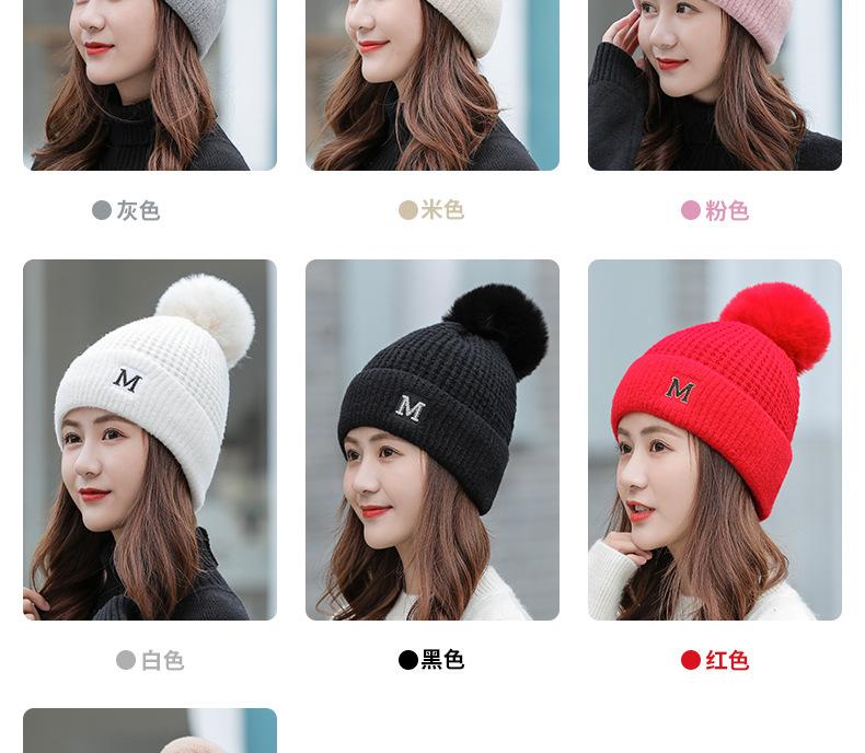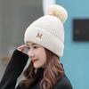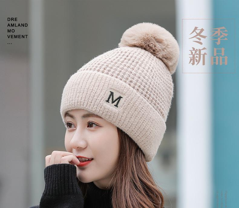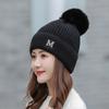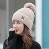 Gorro japonés con la letra M, gorro de punto a la moda para mujer, estilo coreano, cálido gorro de terciopelo de invierno, gorro de lana con bola de pelo.