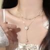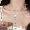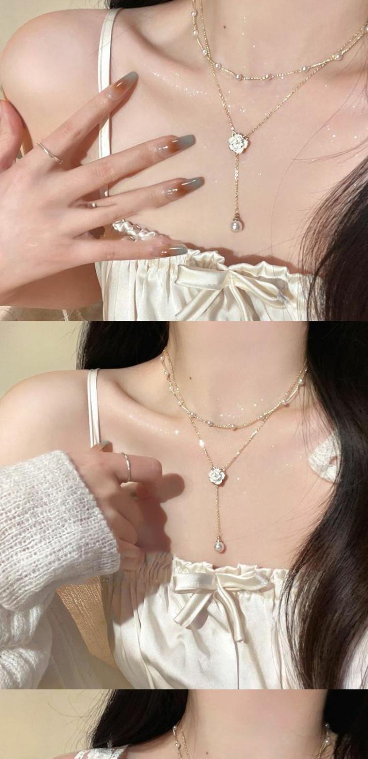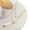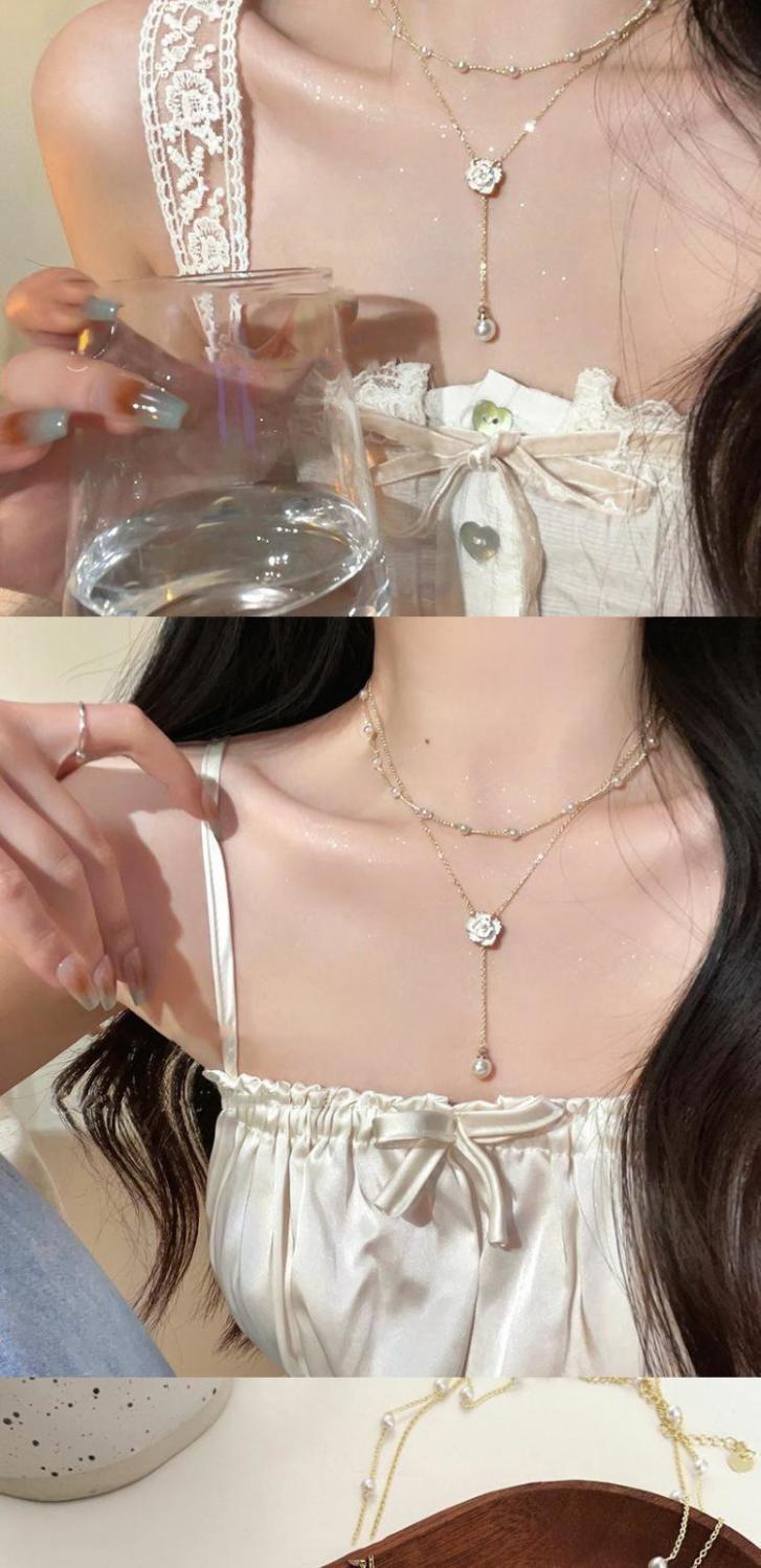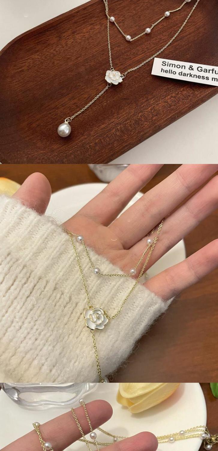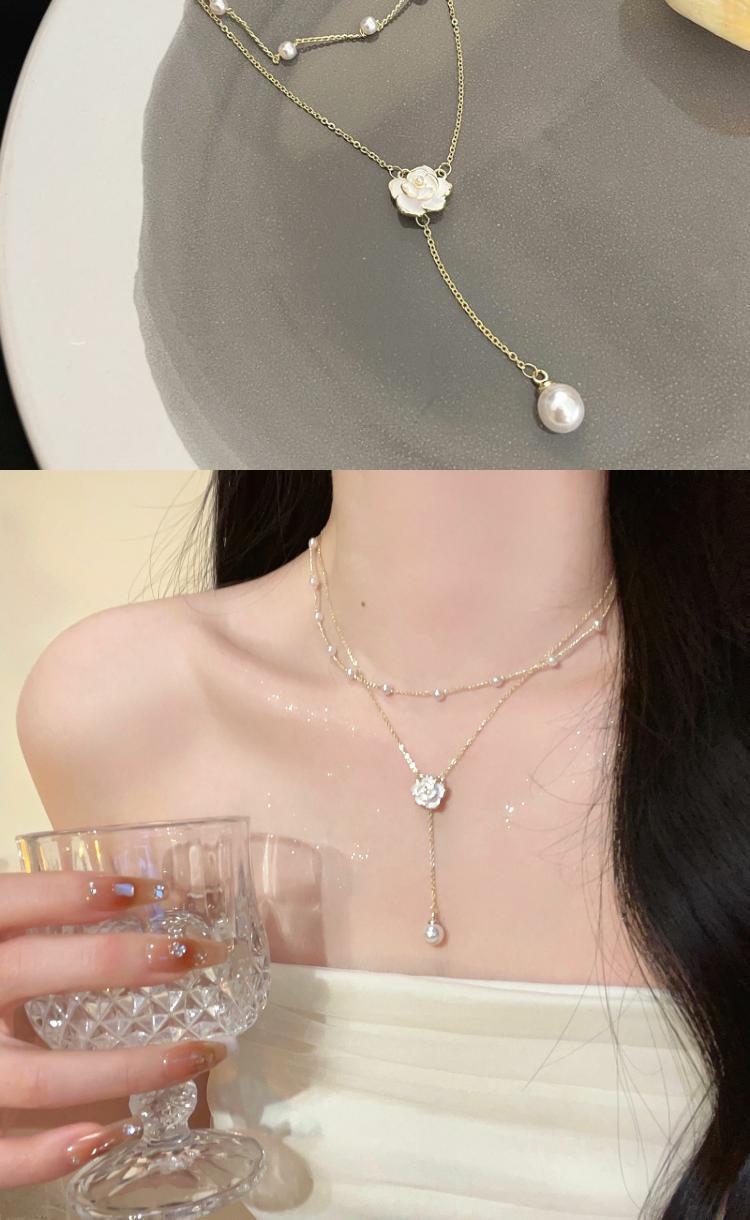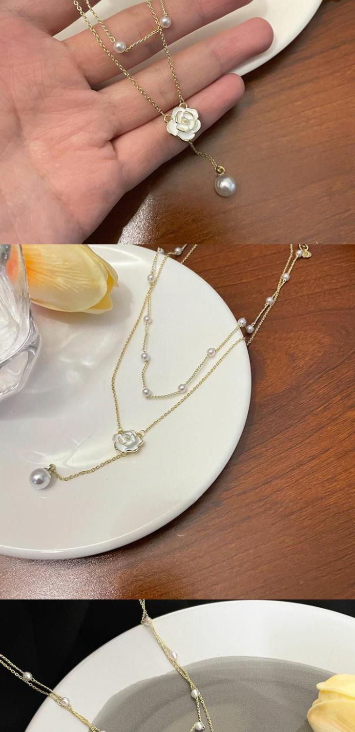 Collar de perlas con borlas de doble capa, diseño de nicho femenino, cadena de clavícula de camelia, cadena de cuello de temperamento de lujo ligero