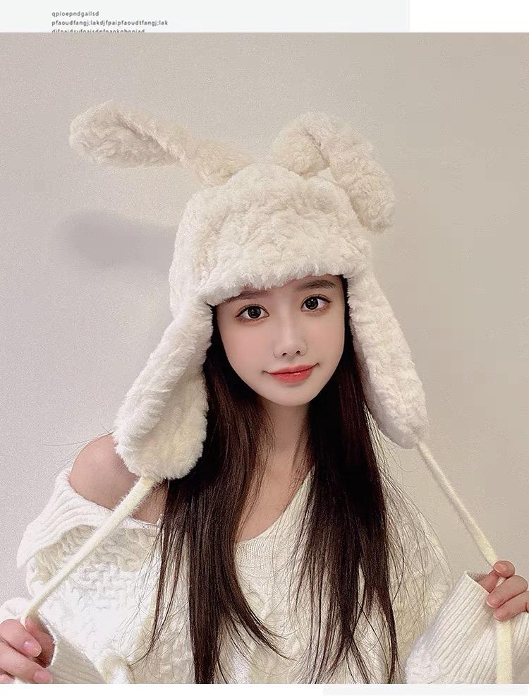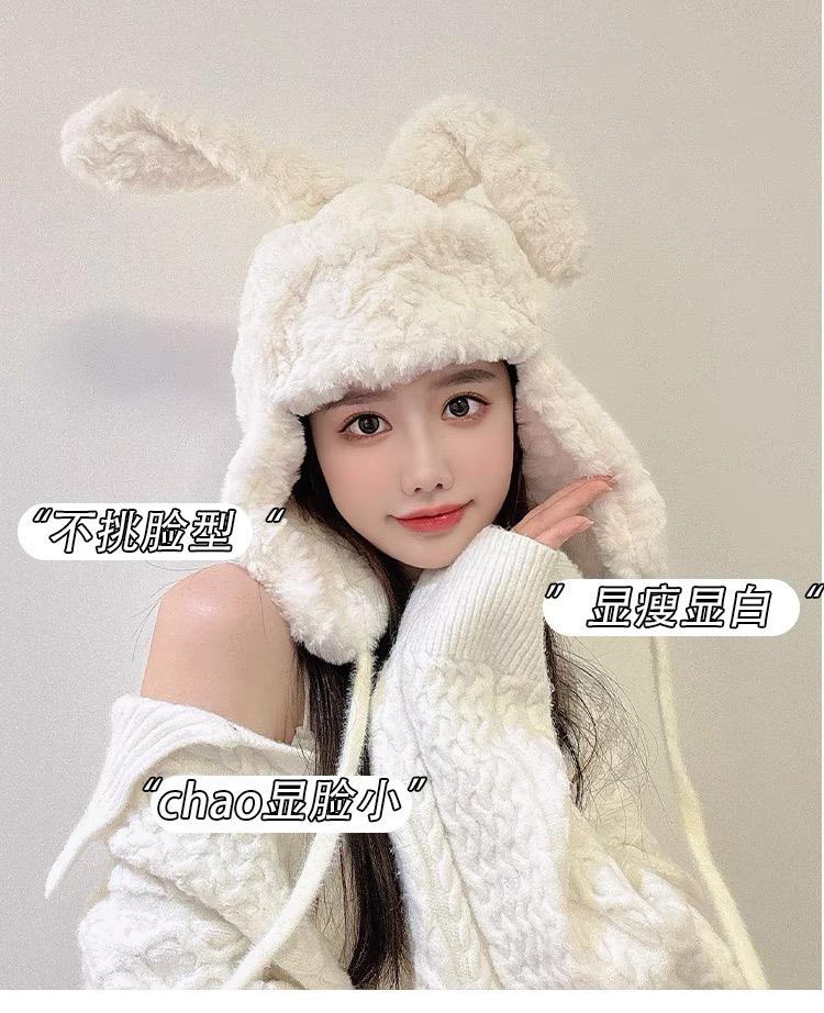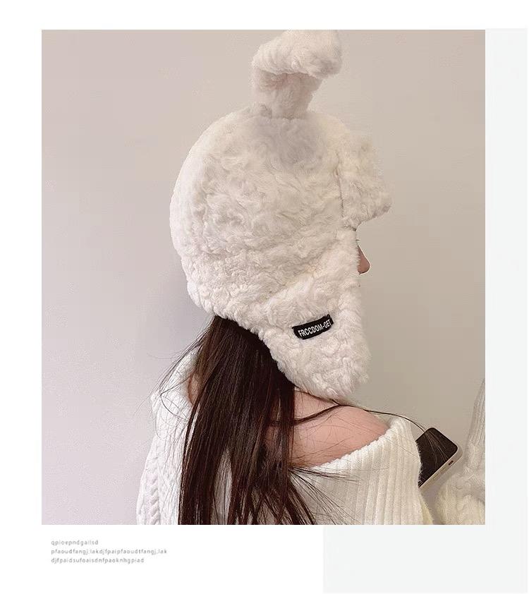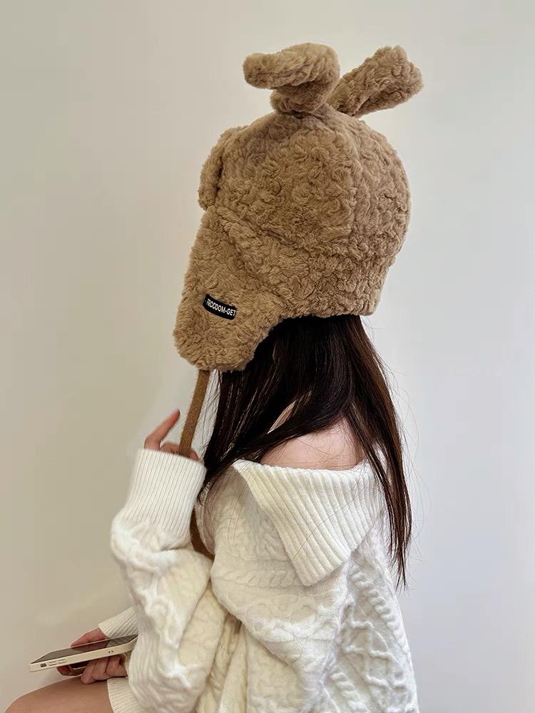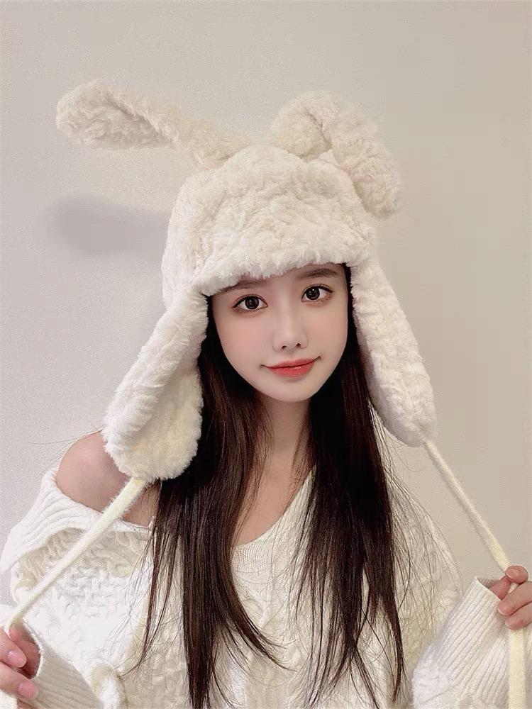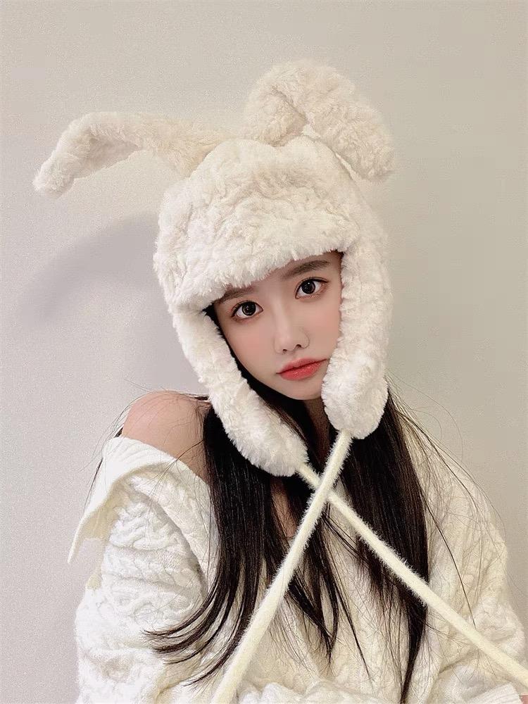 Lindo gorro Lei Feng de felpa con orejas de conejo para mujer, invierno, forrado de vellón, grueso, cálido, para exteriores, esquí, ciclismo, orejeras