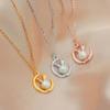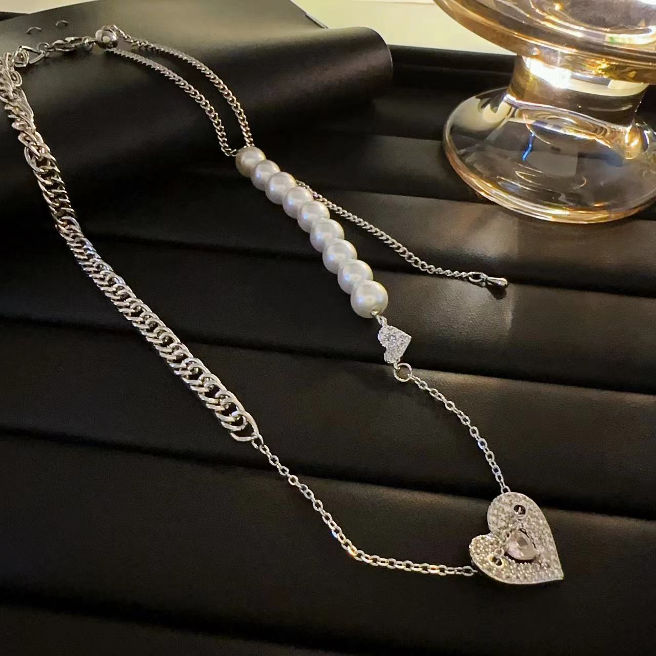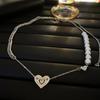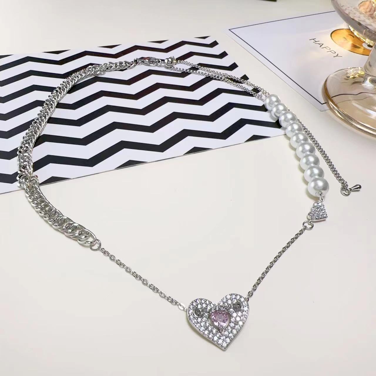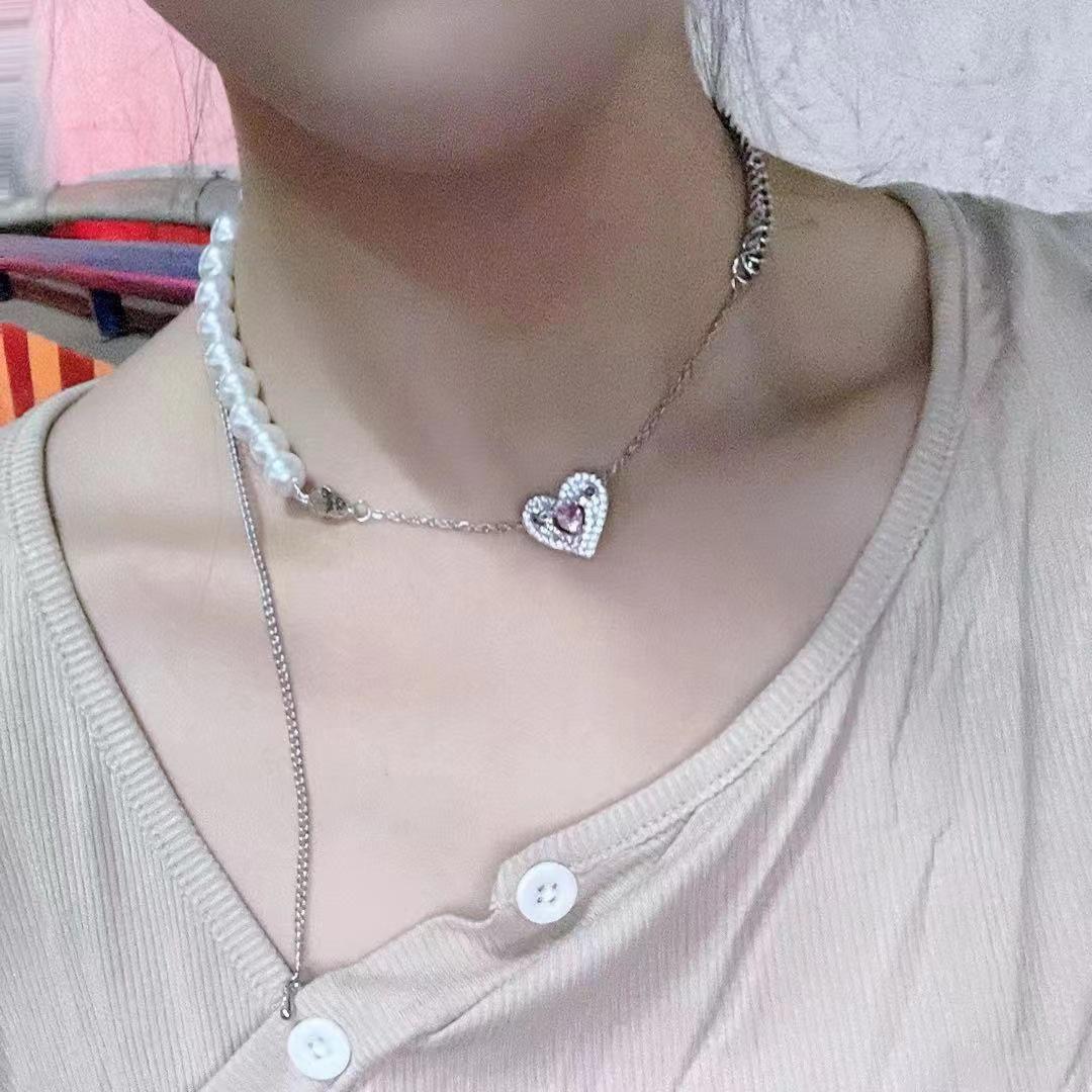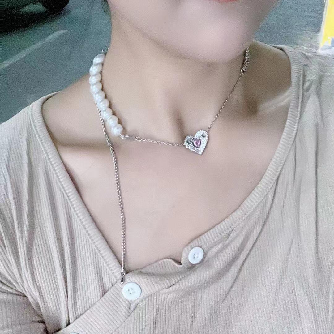 Colgante de diamantes de amor color melocotón con costura de perla, cadena de clavícula femenina con diseño avanzado, sentido de la luz, collar de temperamento de lujo a la moda