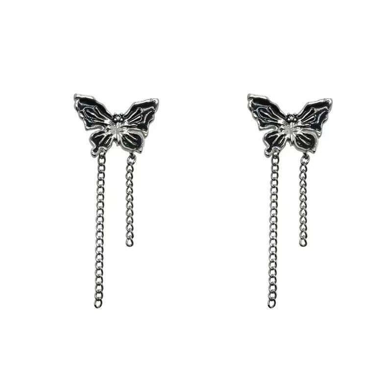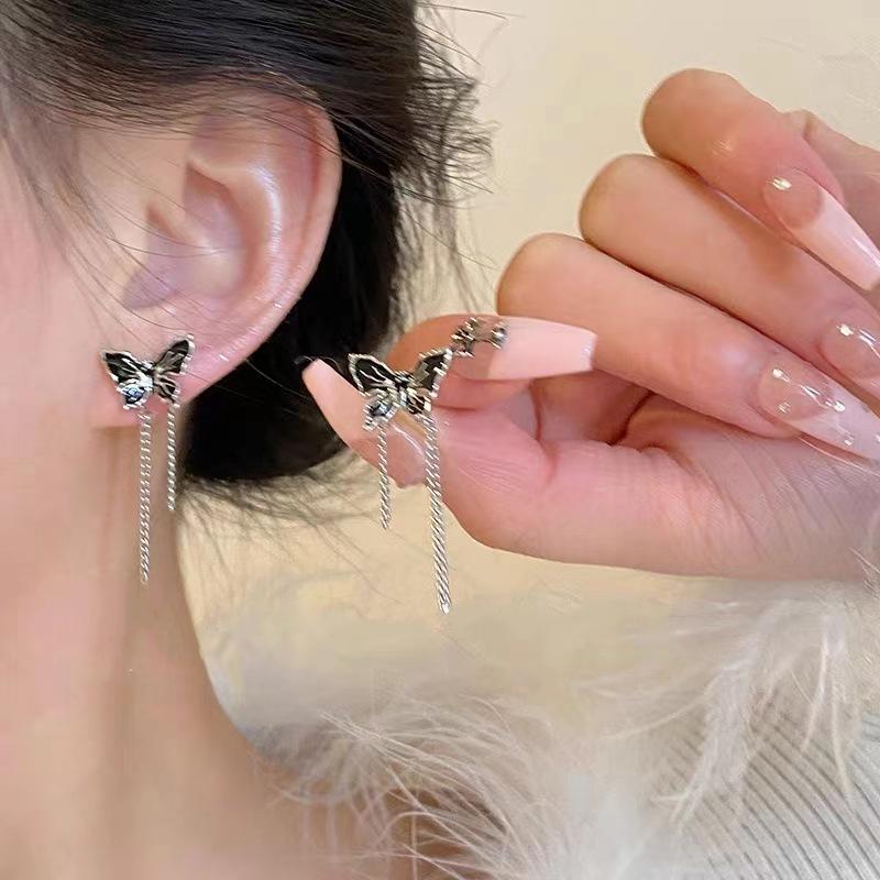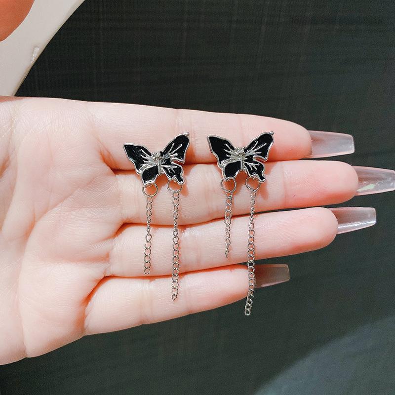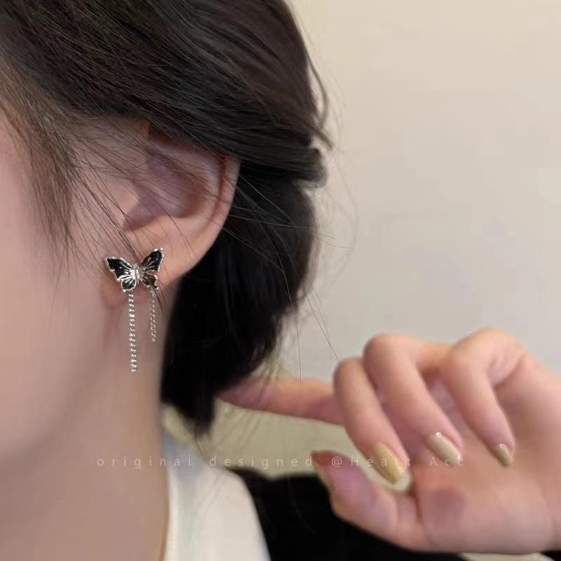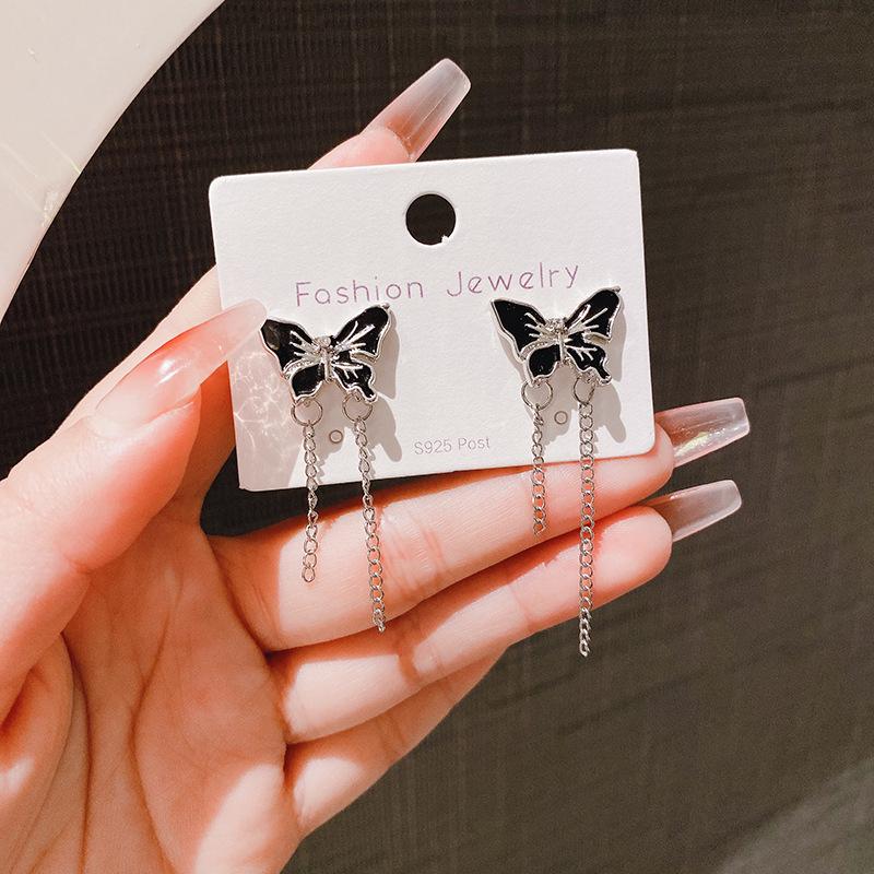 Pendientes de mariposa negra con aguja de plata s925, elegantes y con personalidad, con borlas y diseño de nicho.