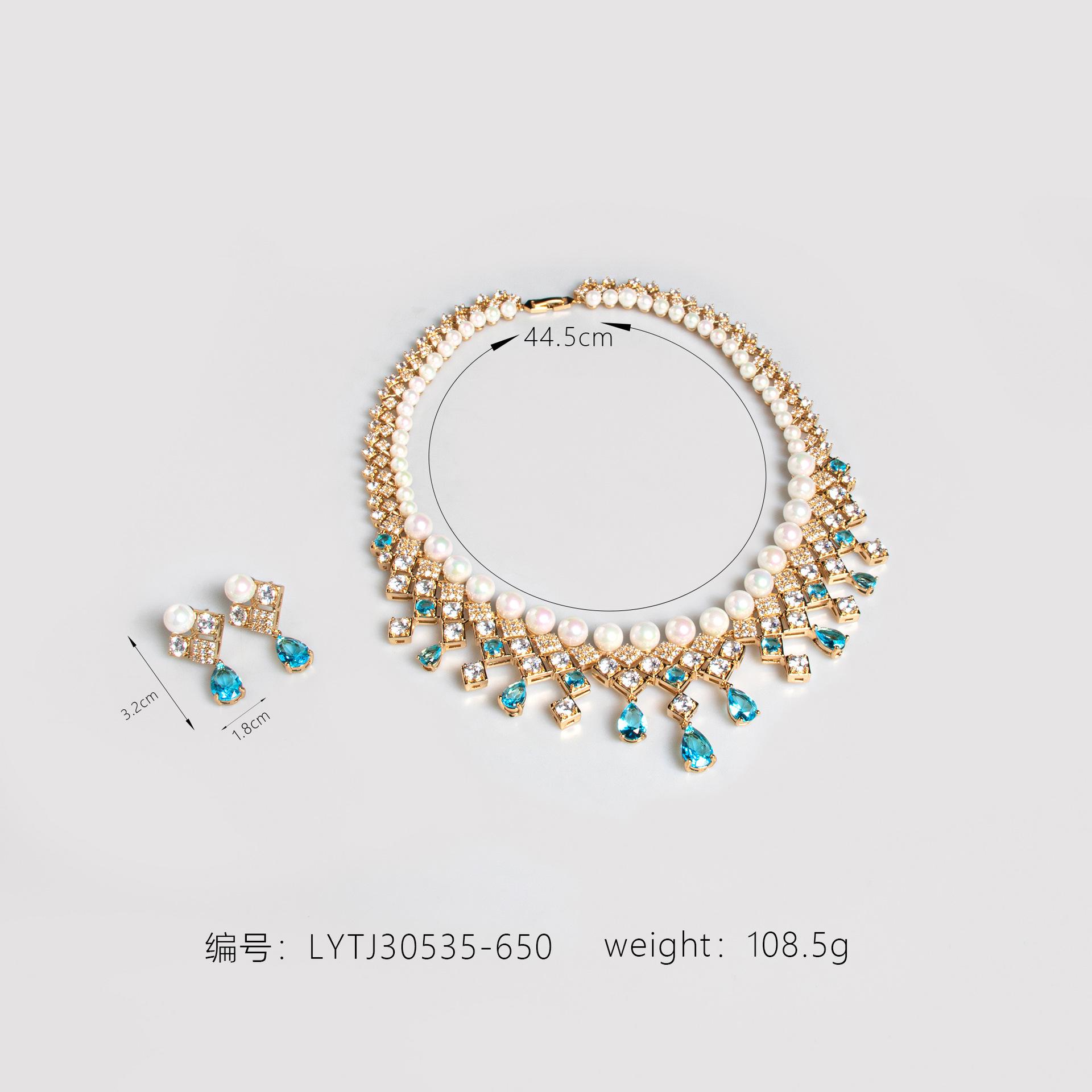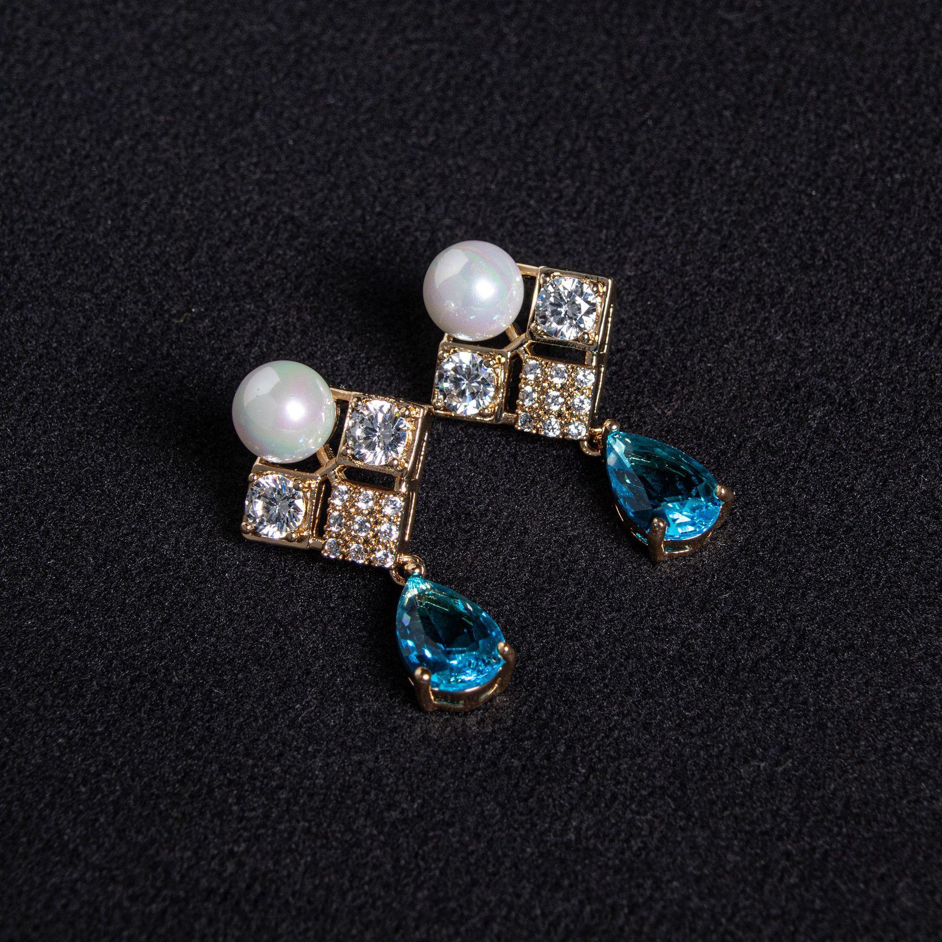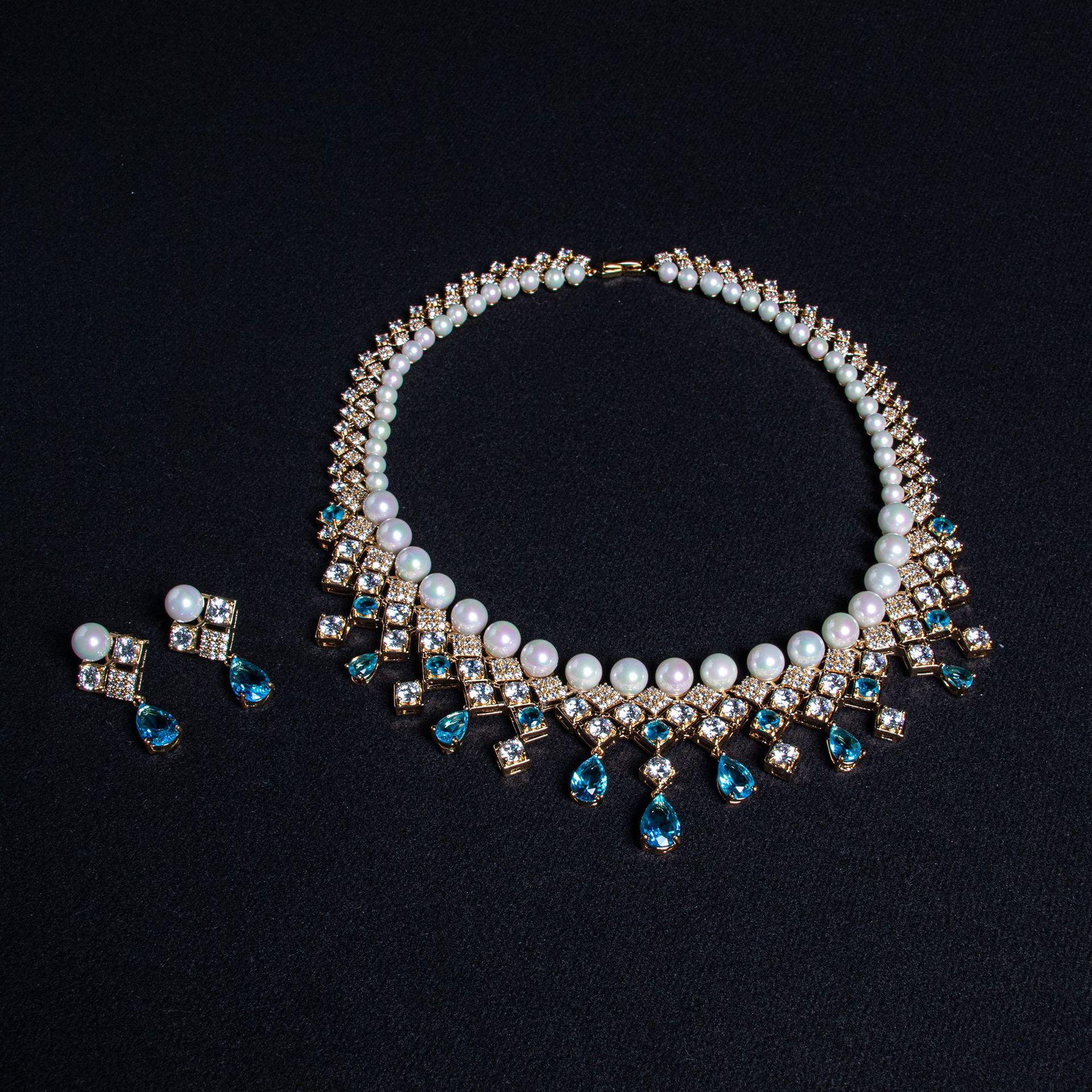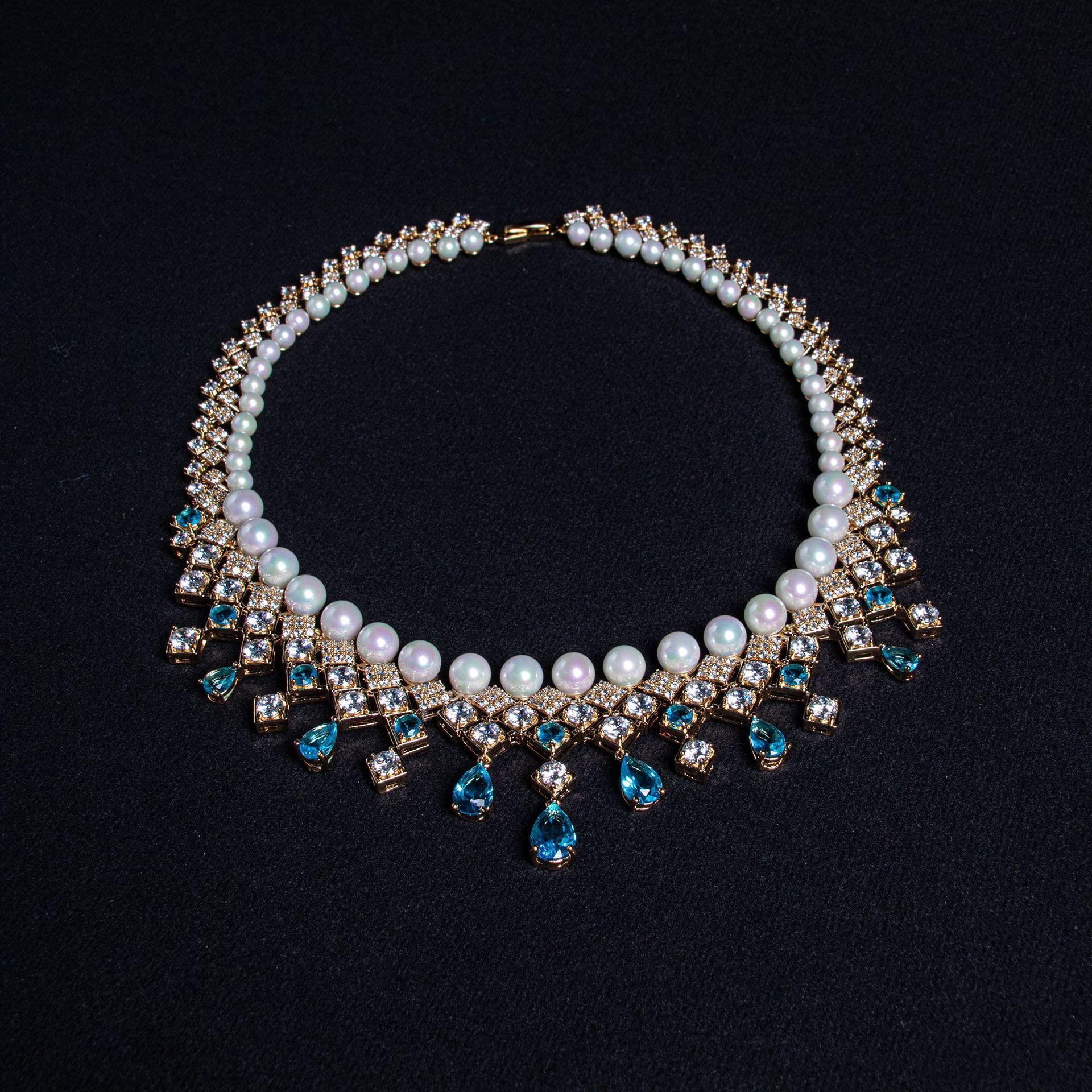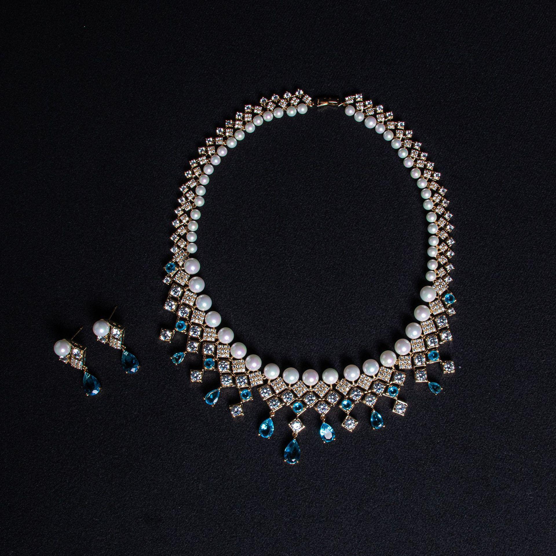 Nuevo Collar Transfronterizo de Zircón Gota de Agua Azul Cadena Clavicular Retro Palacio Nicho de Alta Gama Collar de Perlas Cuadradas