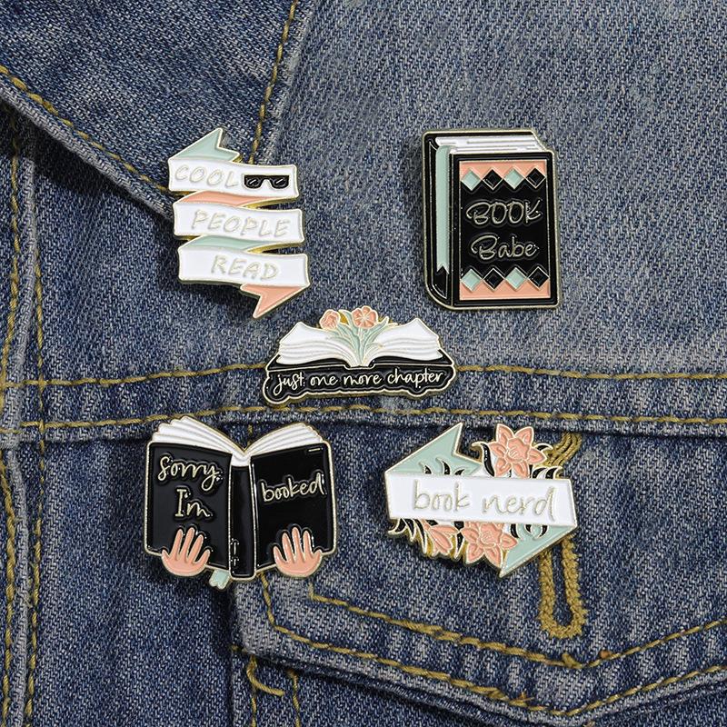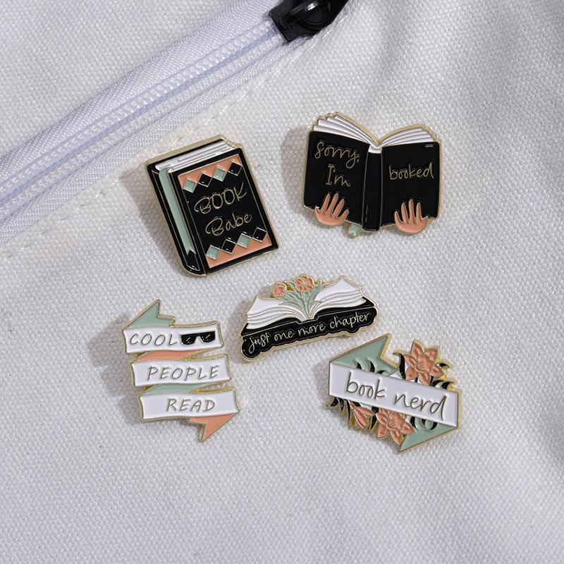Insignia de metal con pintura de flores y libros de dibujos animados simples, decoración para lectores, broche de letras inglesas, joyería