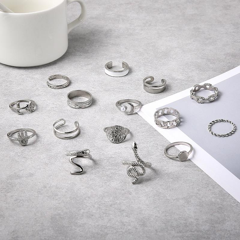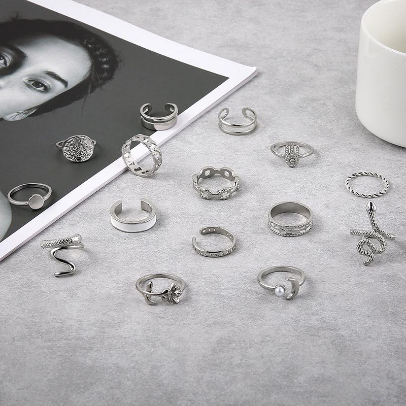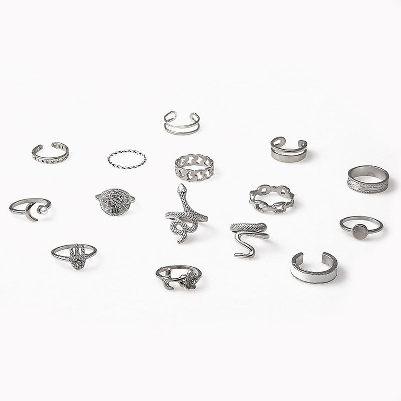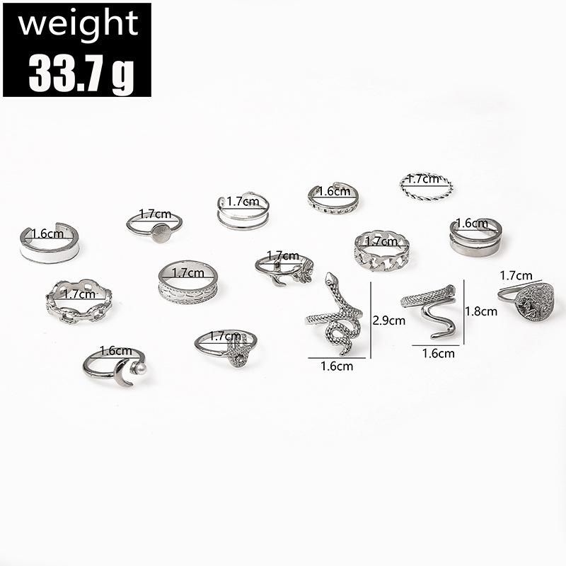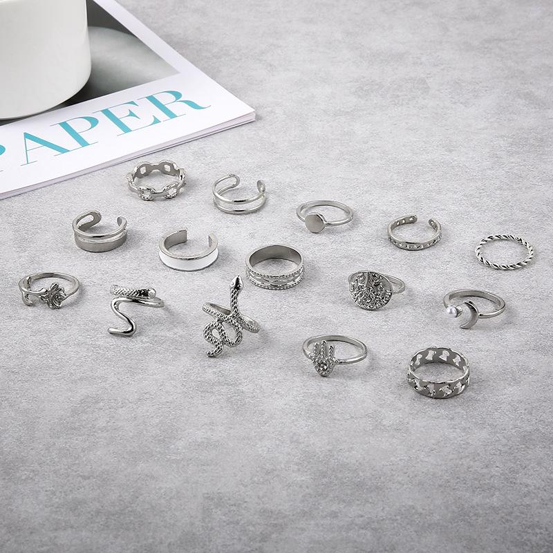 Anillo Transfronterizo de Venta Caliente Estilo Europeo y Americano Moneda de Oro Perla Diamante Palma Rosa Serpiente Juego de 15 Piezas Anillo de Articulación