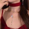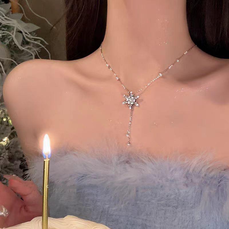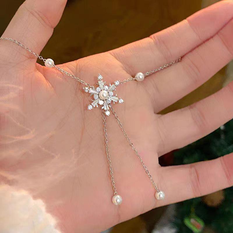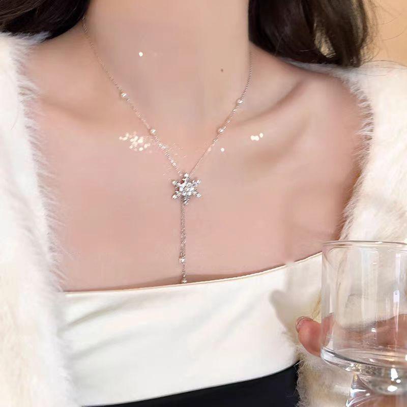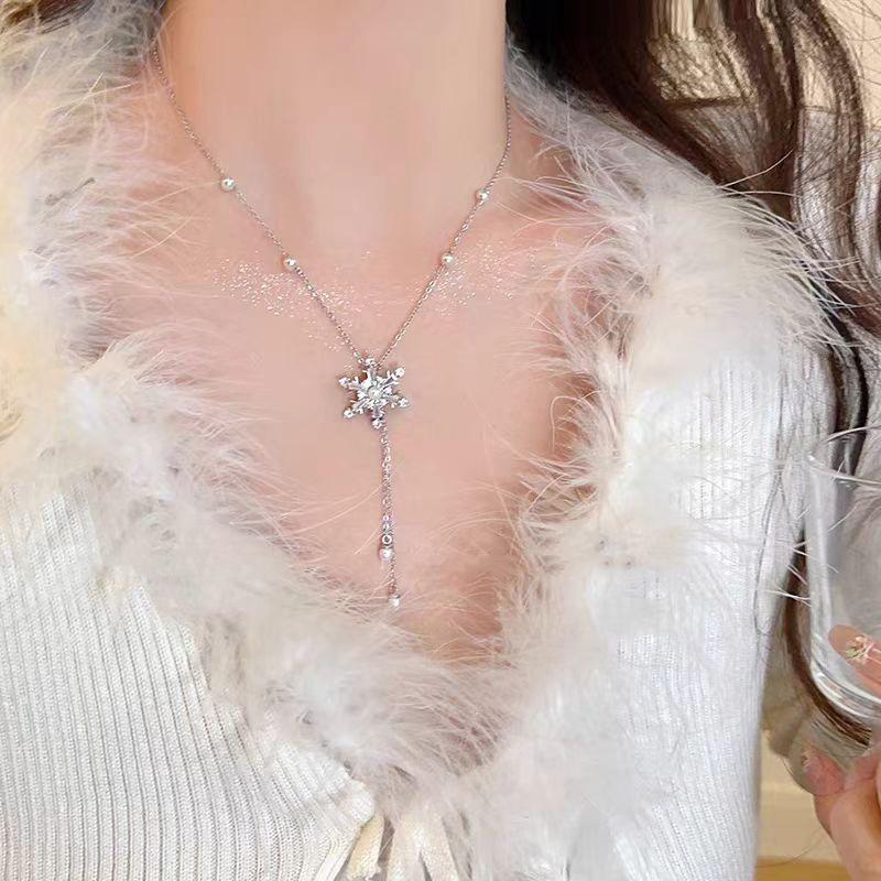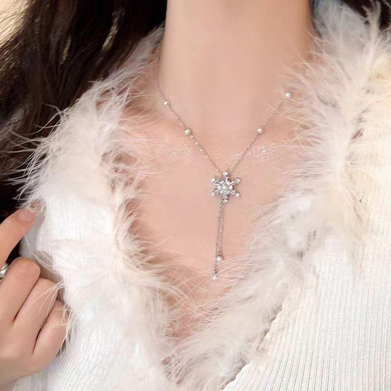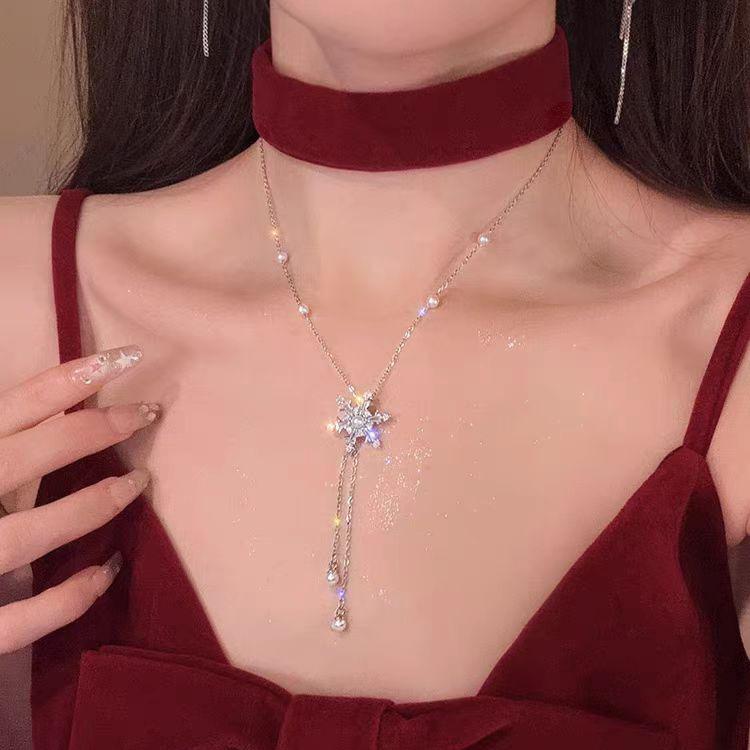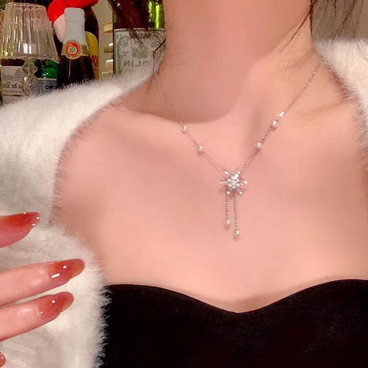 Collar de acero de titanio con colgante de circonita micro incrustada en cobre, brillante, con borla de copo de nieve de diamantes completos, elegante, versátil, con cadena de clavícula de perlas