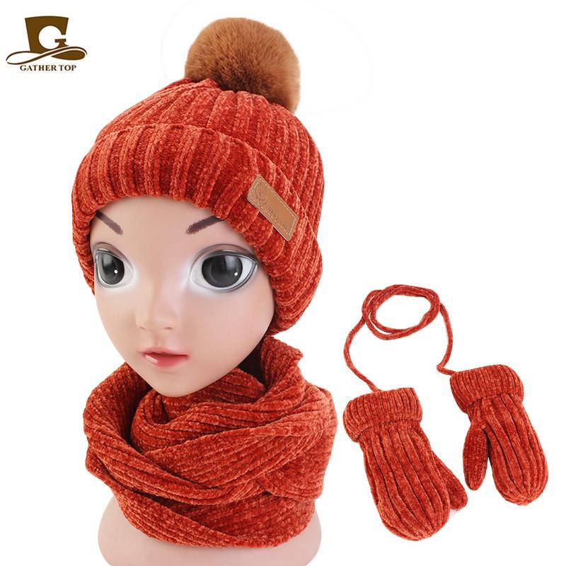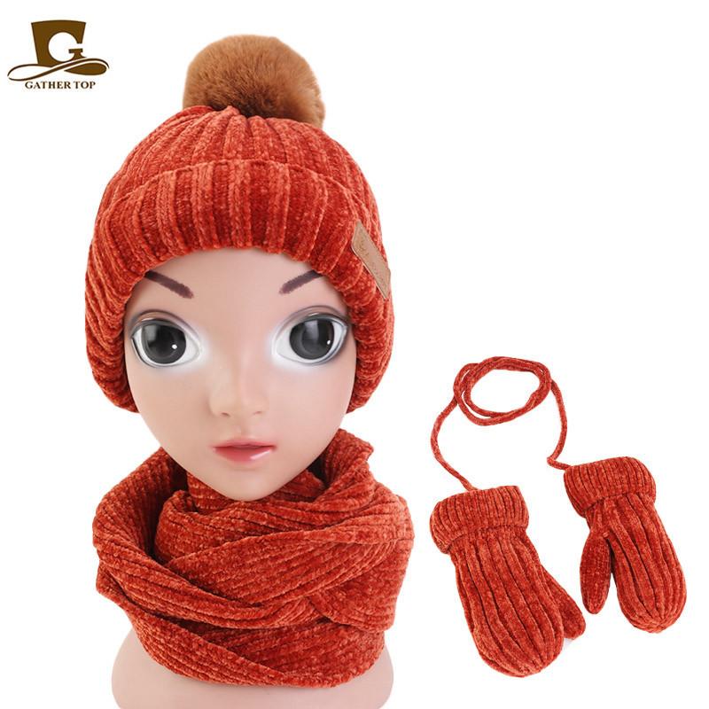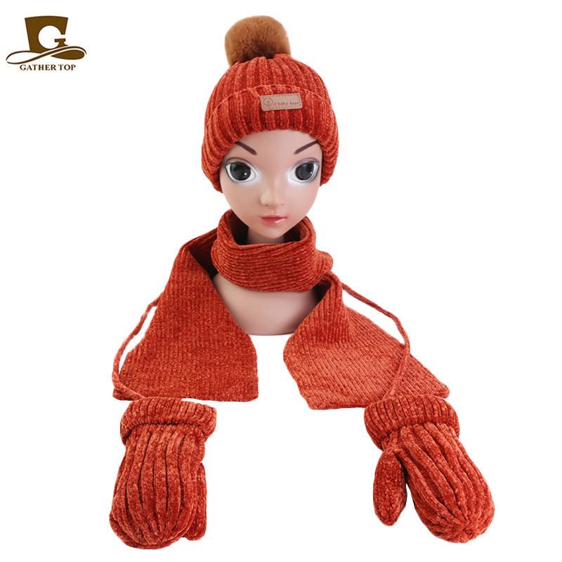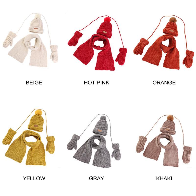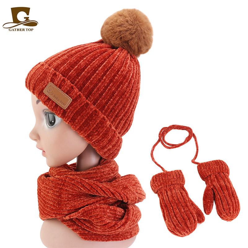 Conjunto de tres piezas de lana chenilla para niños, gorro de bebé, bufanda, guantes, conjunto cálido forrado con felpaTJ-50