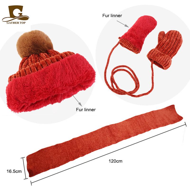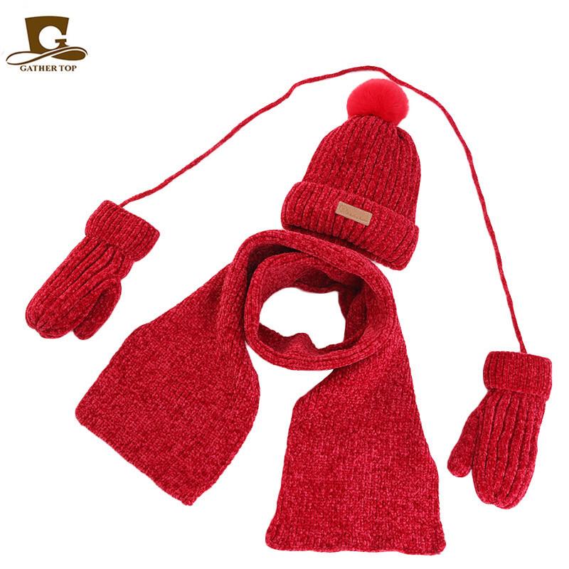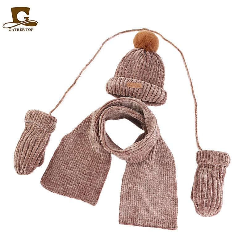 Conjunto de tres piezas de chenilla y lana de vaca para niños, gorro, bufanda y guantes de felpa cálidos, TJ-50