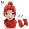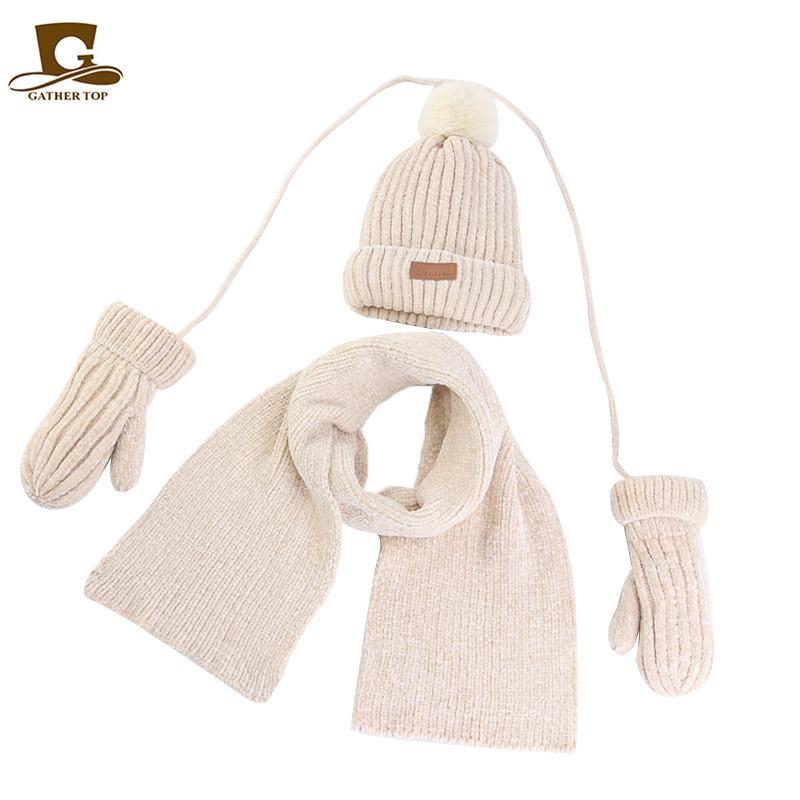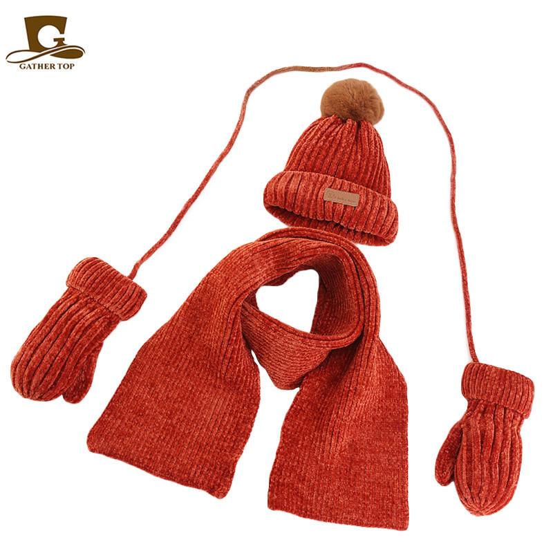 Conjunto de tres piezas de lana y cuero de chenilla para niños, gorro, bufanda y guantes de felpa cálidos para bebé TJ-50