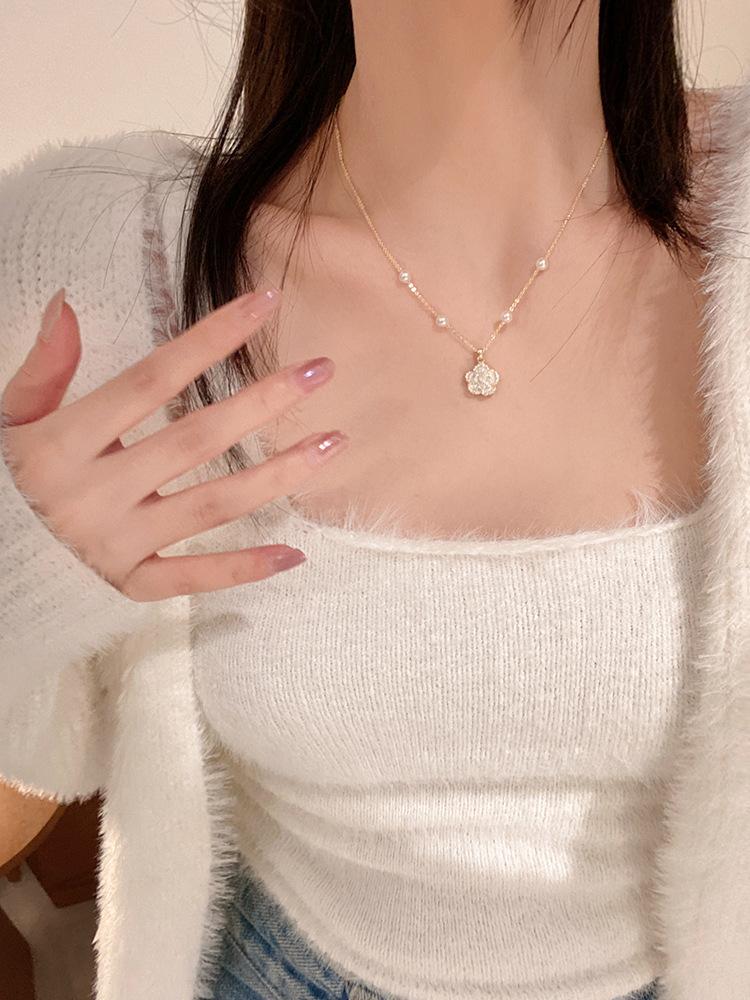 Collar de camelia con perlas para mujer, ligero, de lujo, estilo nicho, con cadena para clavícula, estilo frío y moderno de alta gama.