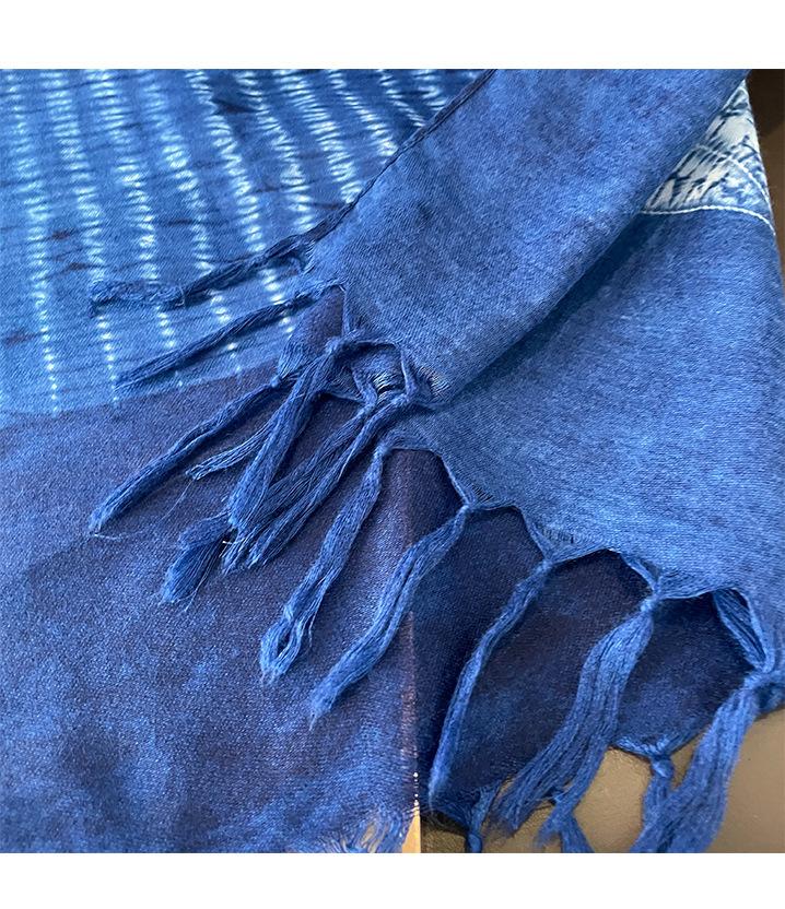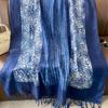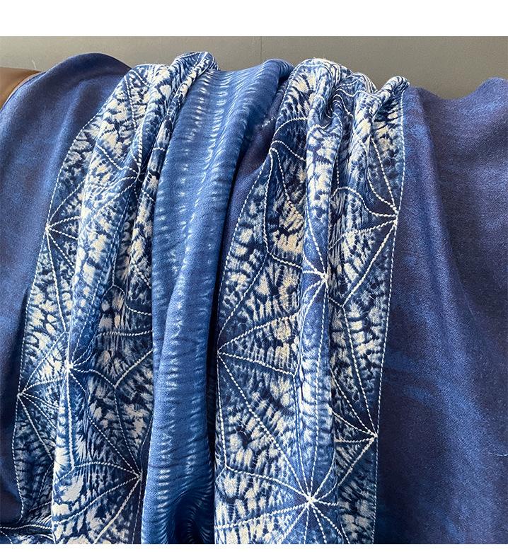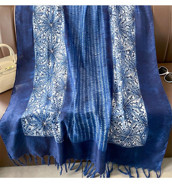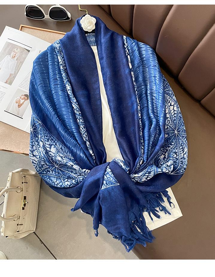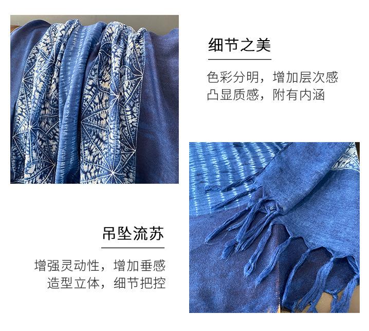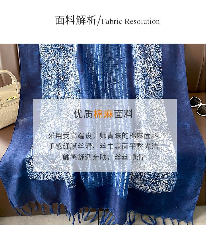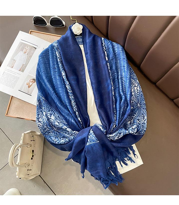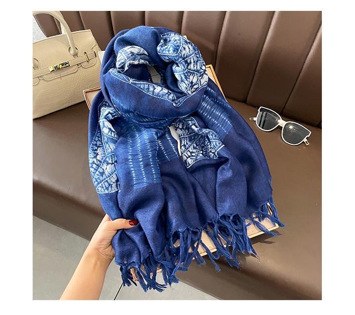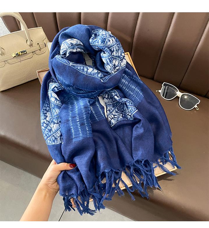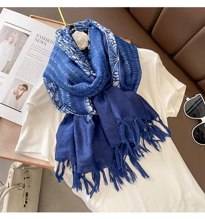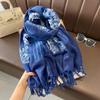 Bufanda larga estampada de lino y algodón azul para primavera y otoño, toalla de playa fina y cálida para estudiantes.