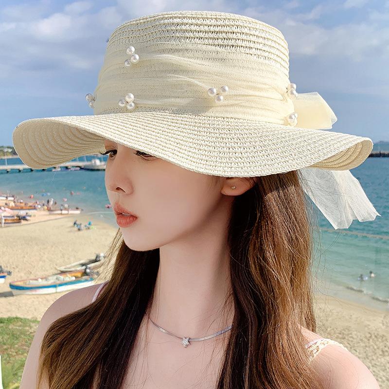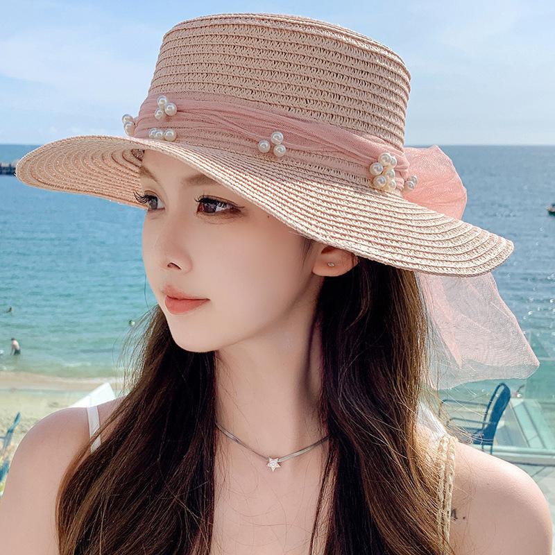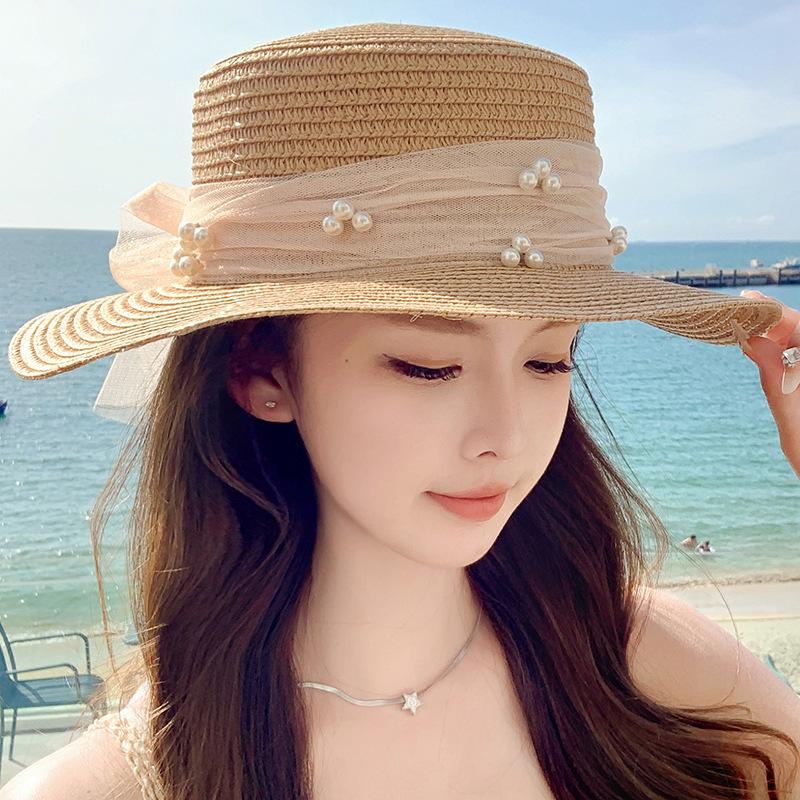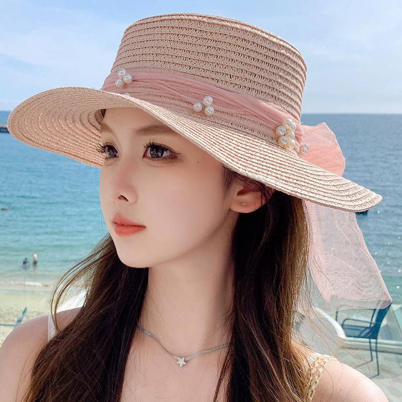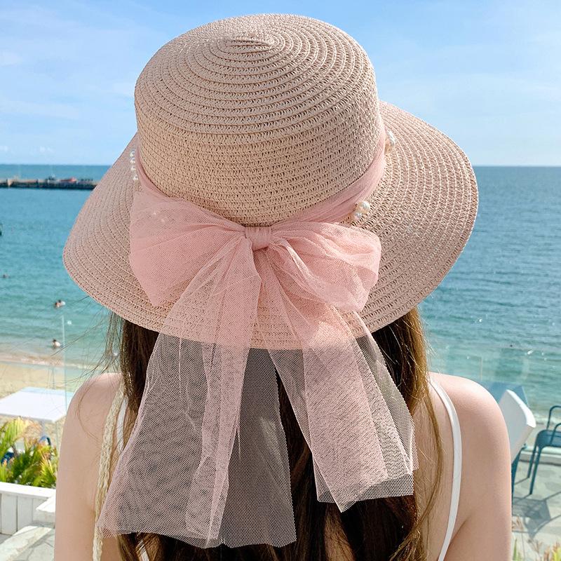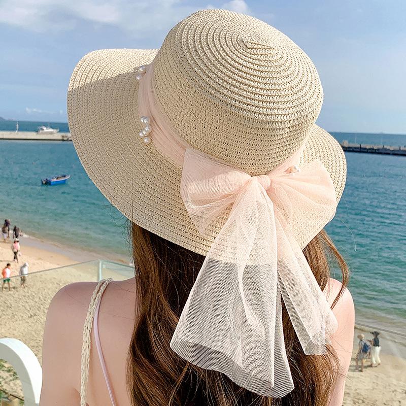 Sombrero de sol de verano con lazo de cinta, sombrero de copa plana elegante y a la moda, sombrero de playa, sombrero de sol para mujer