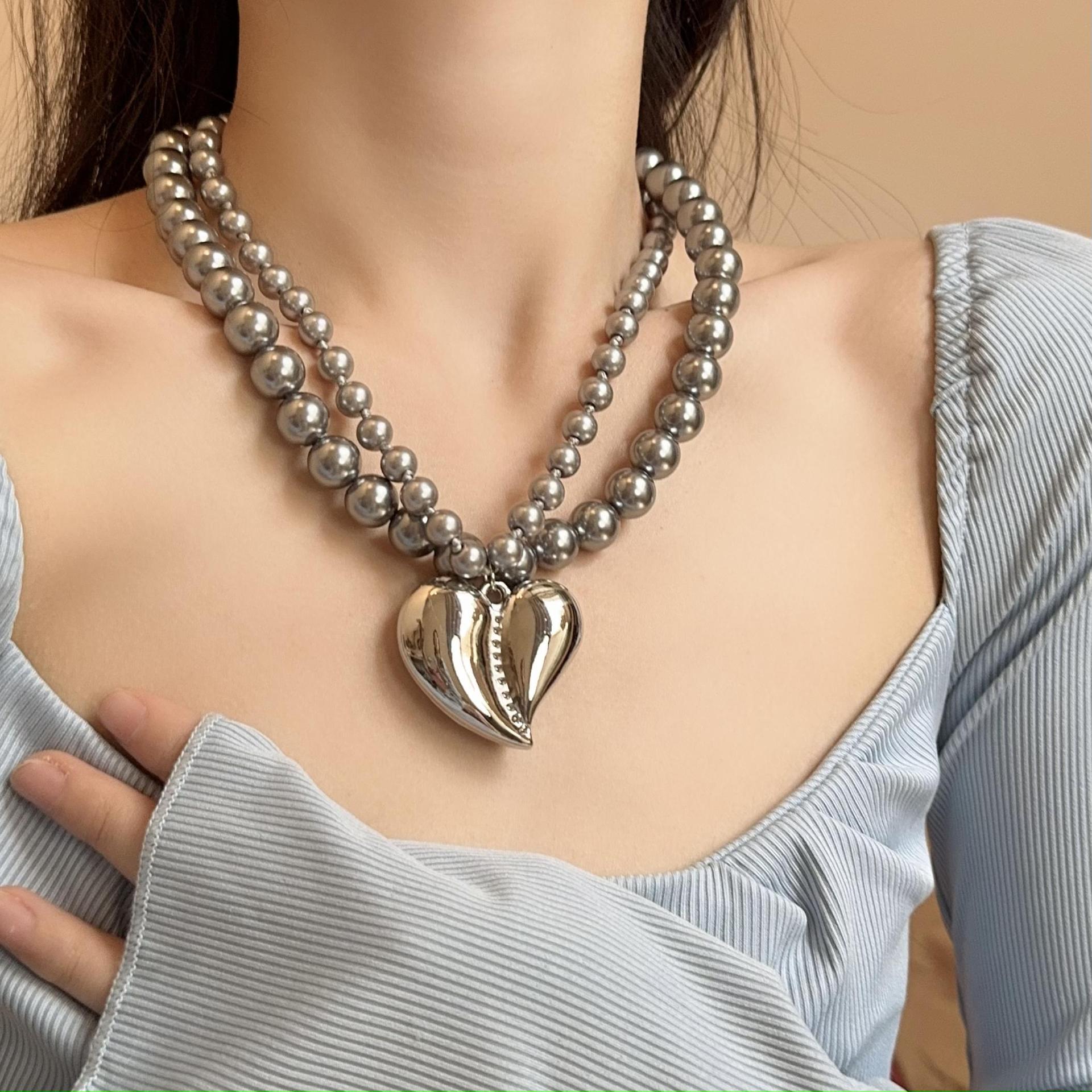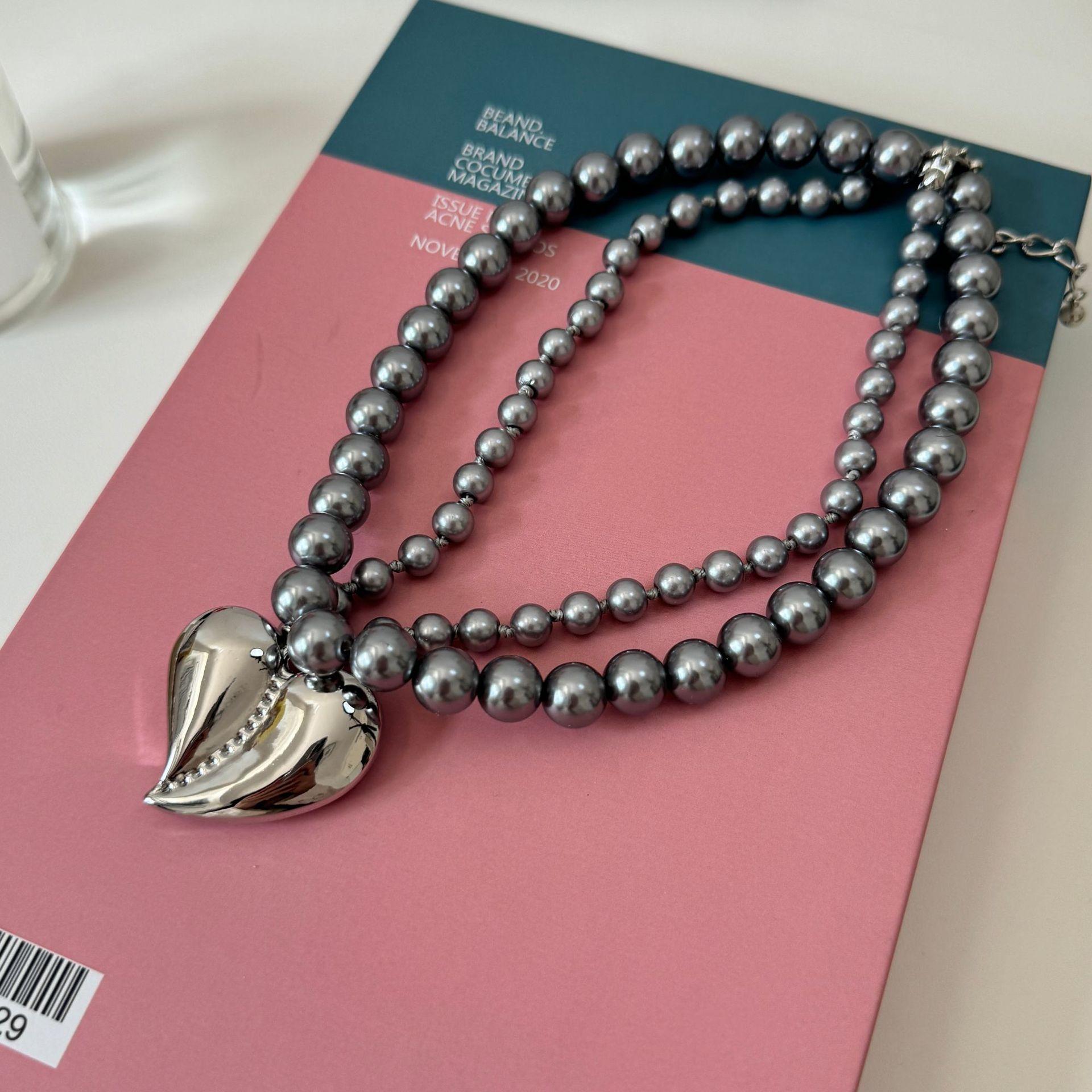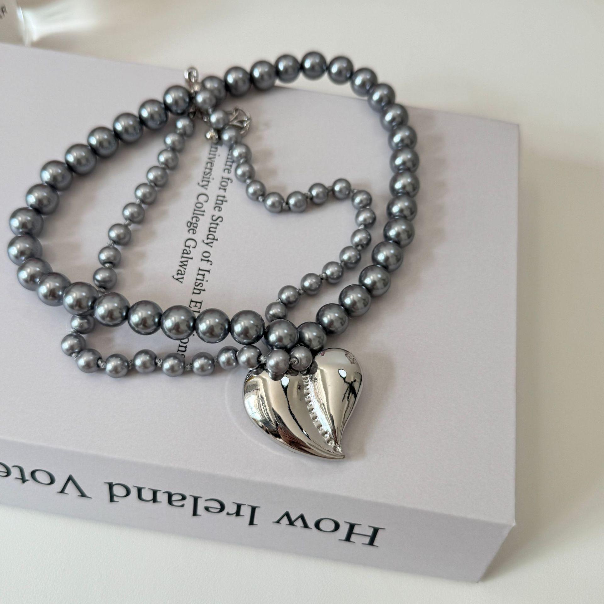 Collar con colgante de amor tridimensional de perla gris de doble capa, conjunto de nicho, collar de lujo ligero y dulce, cadena de clavícula de alta calidad para mujer.