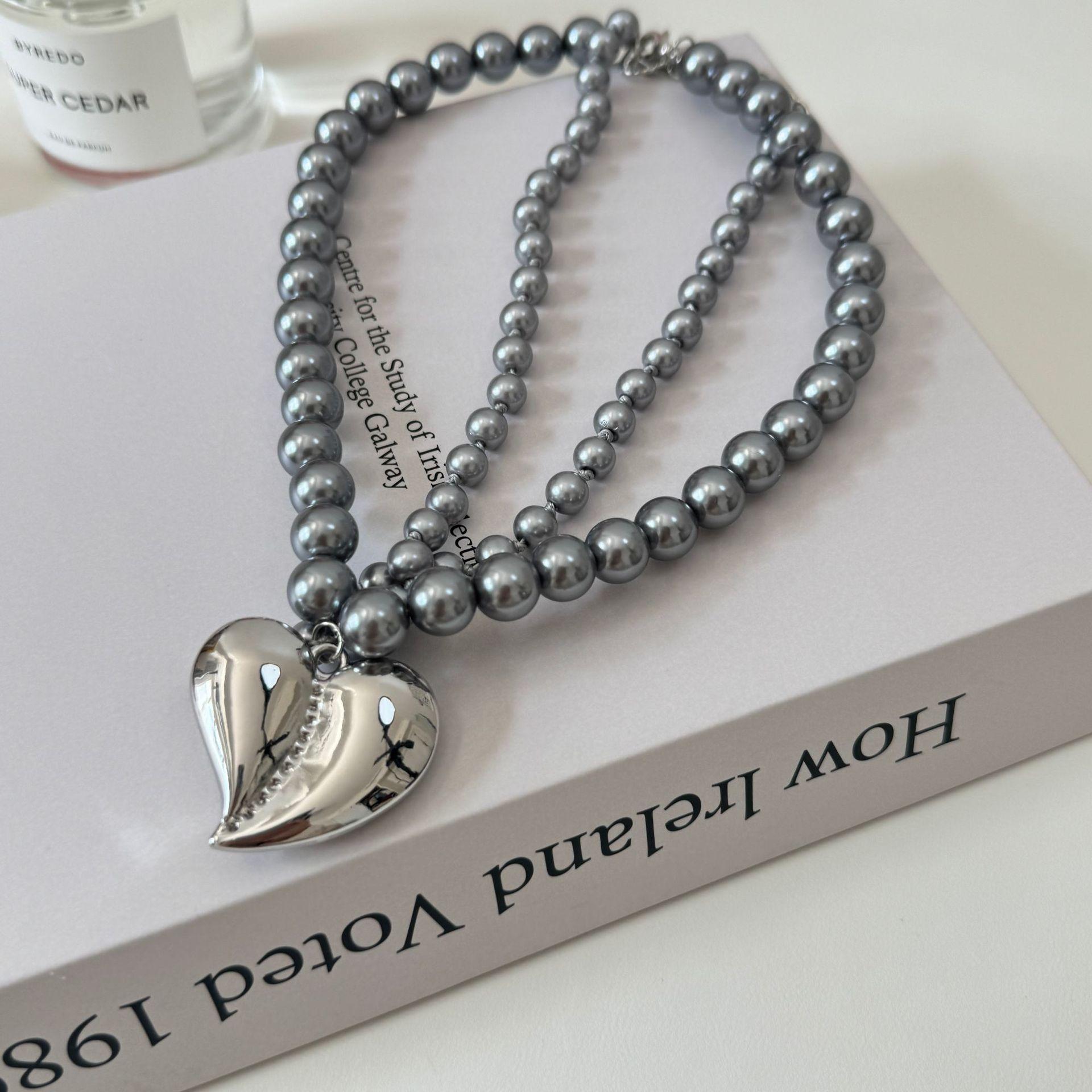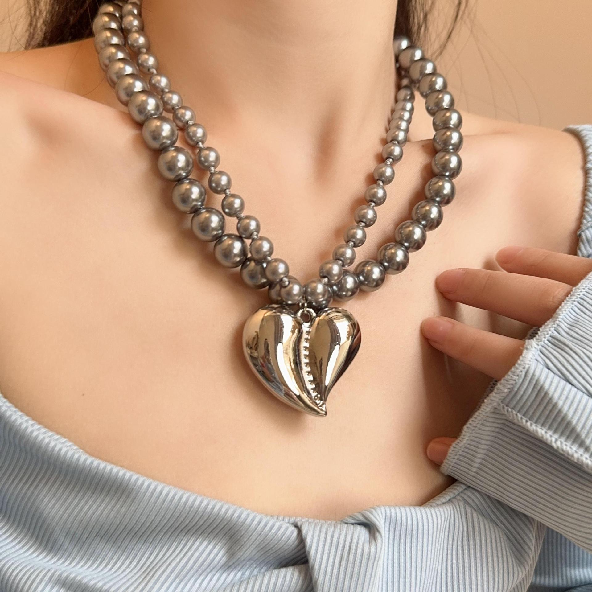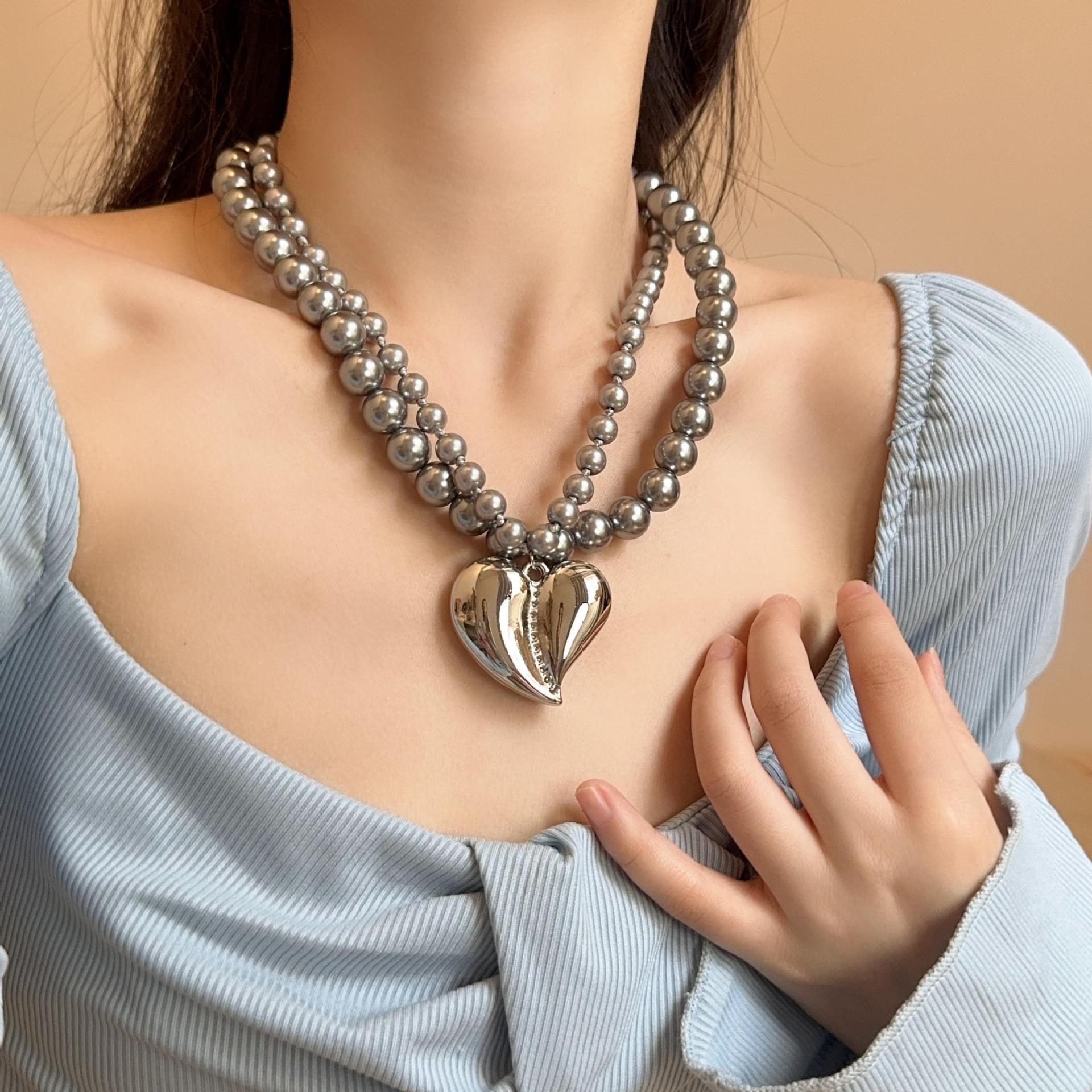 Collar con colgante de amor tridimensional de perla gris de doble capa, conjunto de nicho, collar de lujo ligero y dulce, cadena de clavícula de alta calidad para mujer.