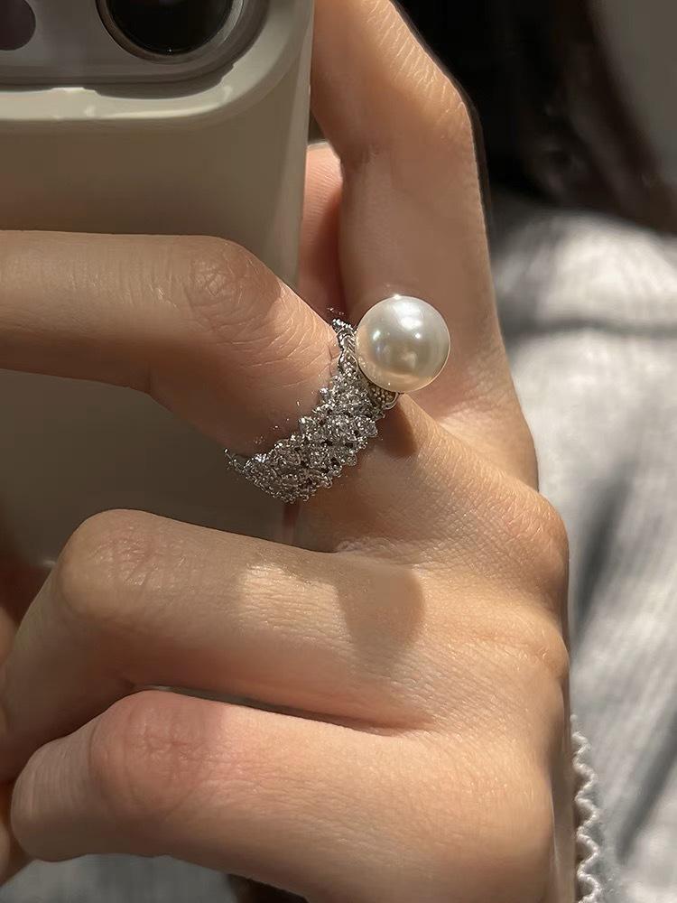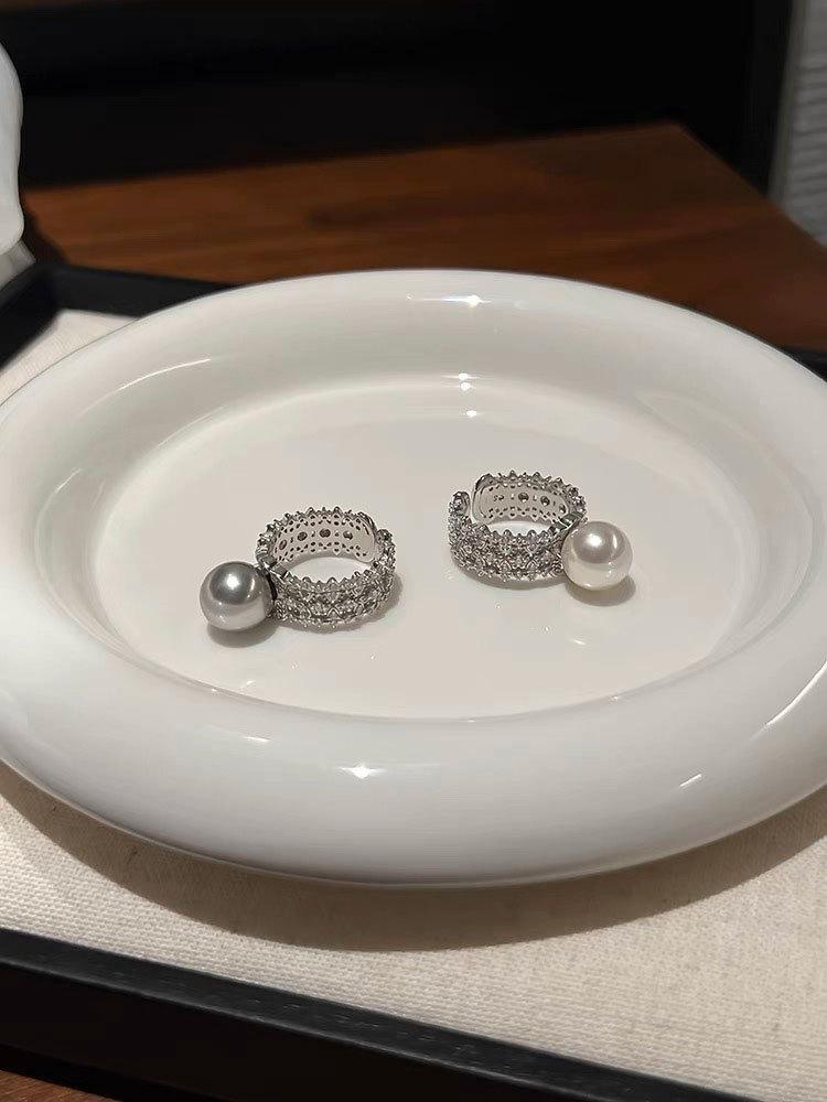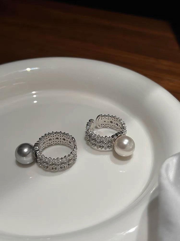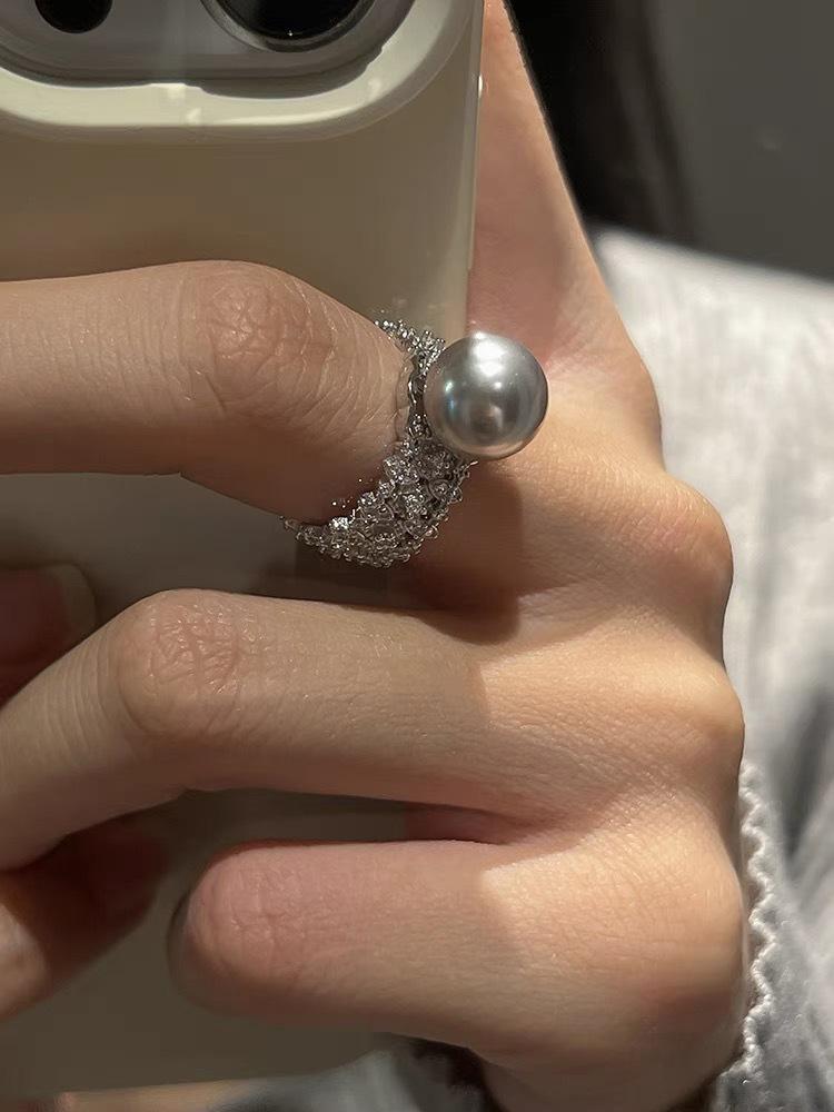 Anillo abierto de perla blanca y gris plateada con diseño de nicho para mujer, moderno, personalizado, ligero, de lujo, elegante, combinable, de alta calidad.