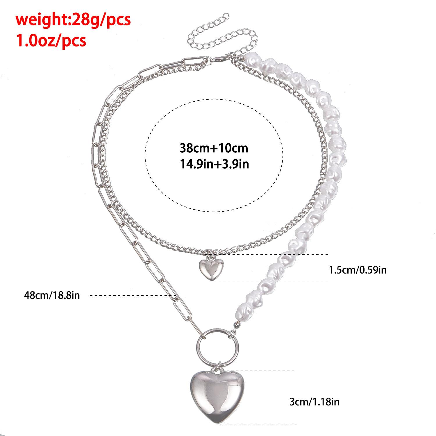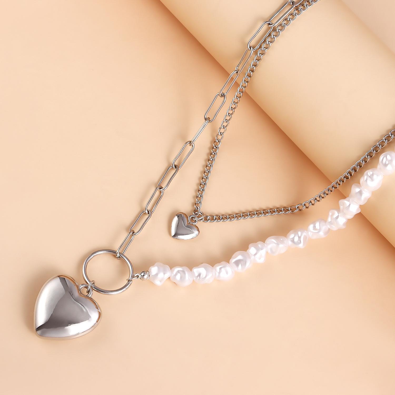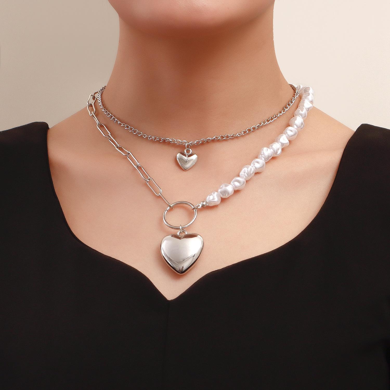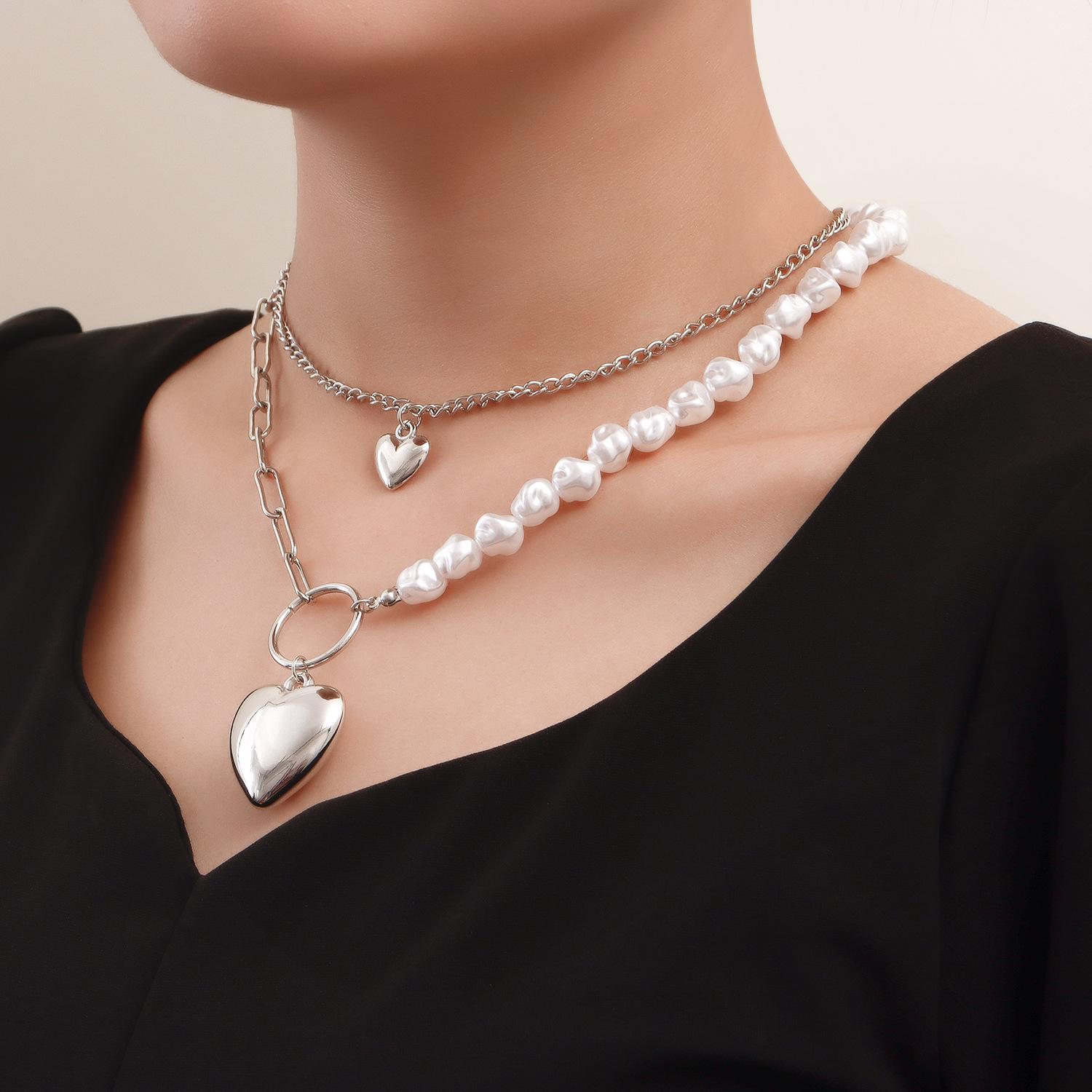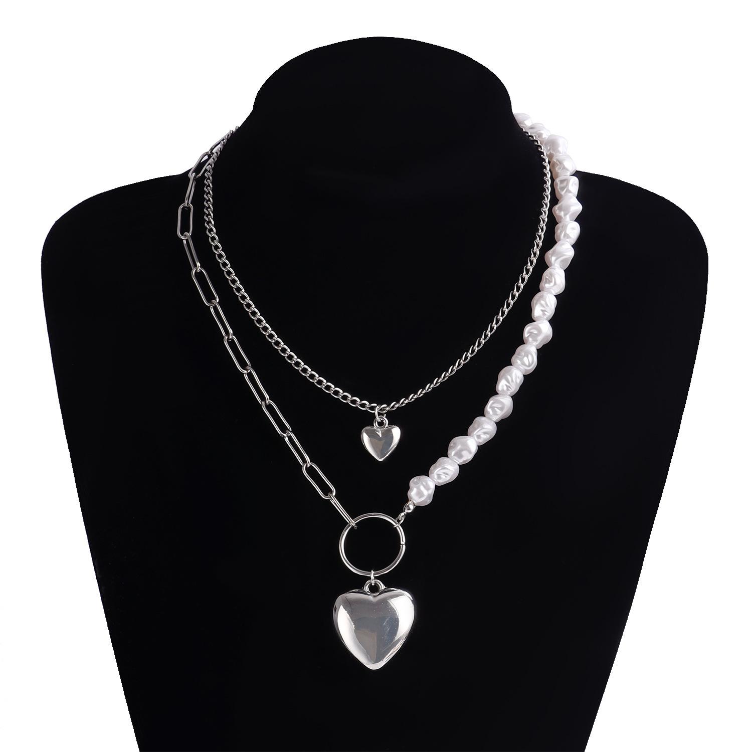 Collar con colgante de amor de doble capa con cadena de clavícula y costuras de perlas artificiales de forma especial para mujer, joyería transfronteriza europea y americana