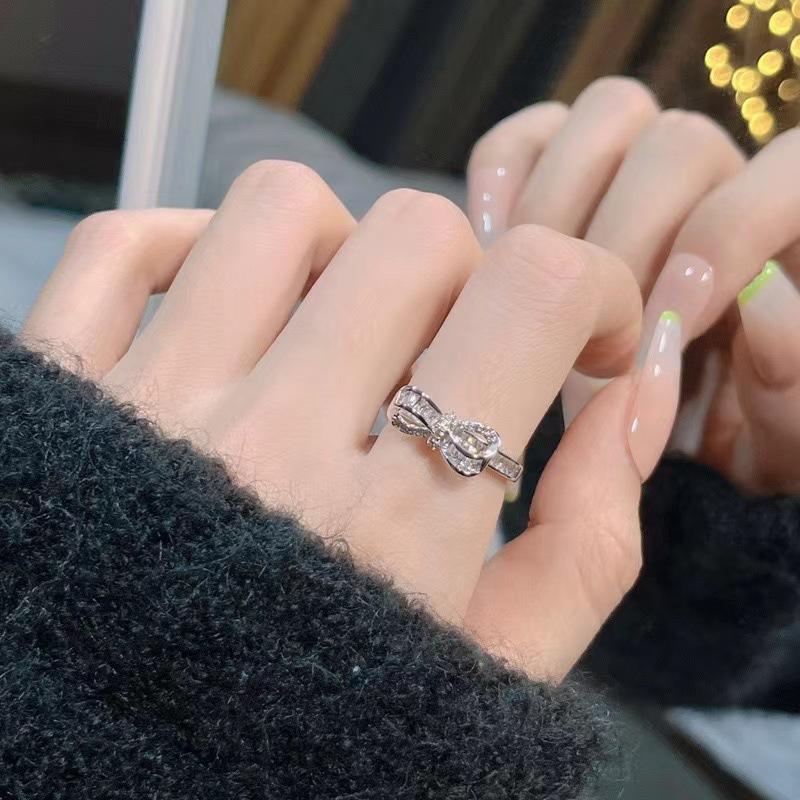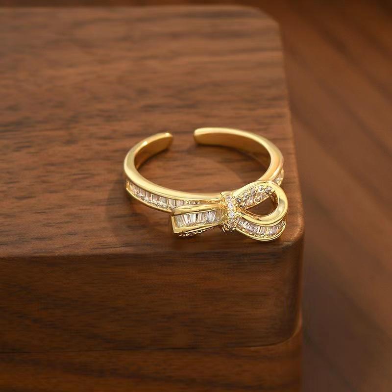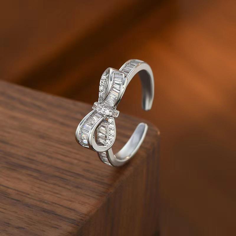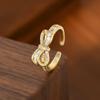 Anillo abierto de circonita con lazo de lujo ligero y de alta gama para mujer, minimalista, moderno, refinado, distintivo, combinable con todo.