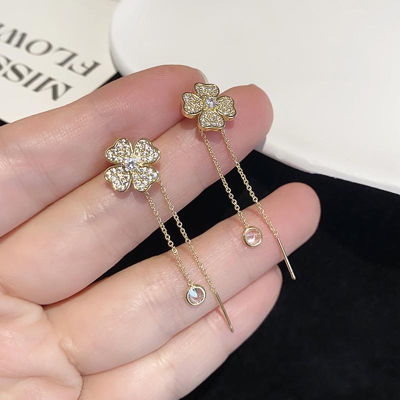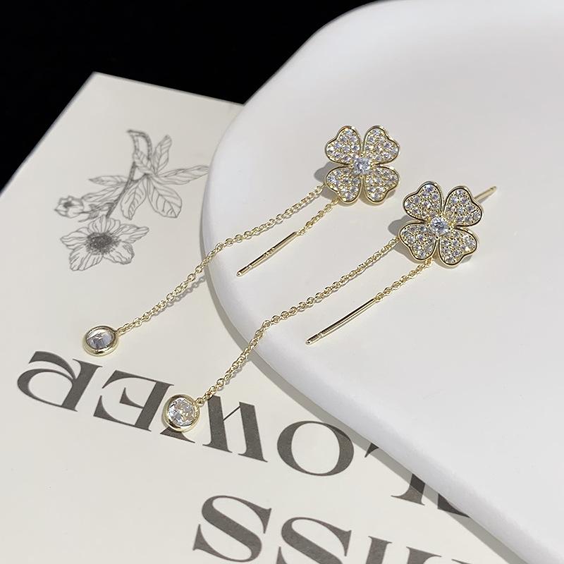 Pendientes largos elegantes con borlas y cuatro hojas de aguja de plata S925, de alta gama, combinables y a la moda, únicos para mujer.