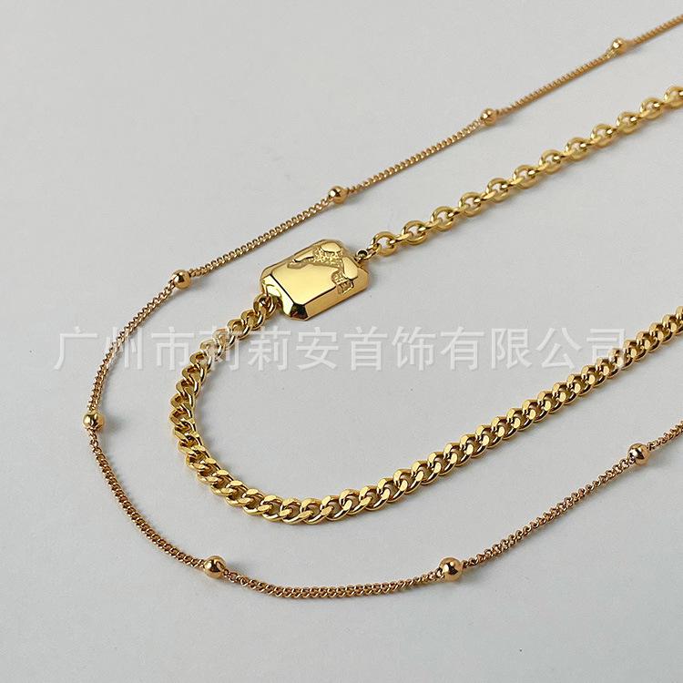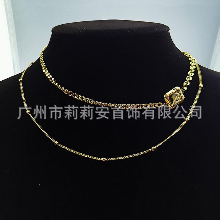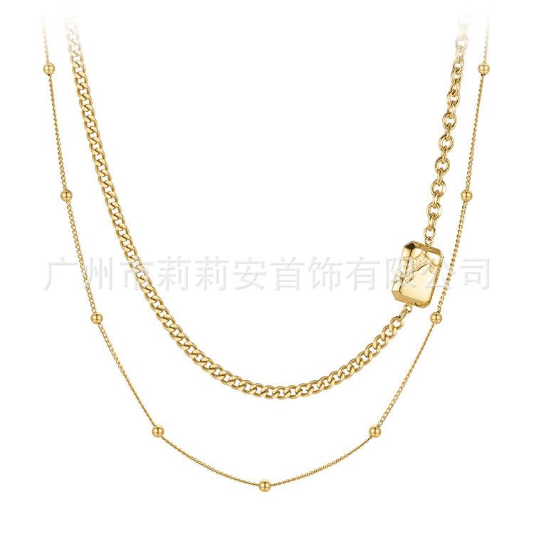 Collar con colgante cuadrado de cadena de costura de doble capa de diseño europeo y americano de acero de titanio bañado en oro de 18 quilates P223293