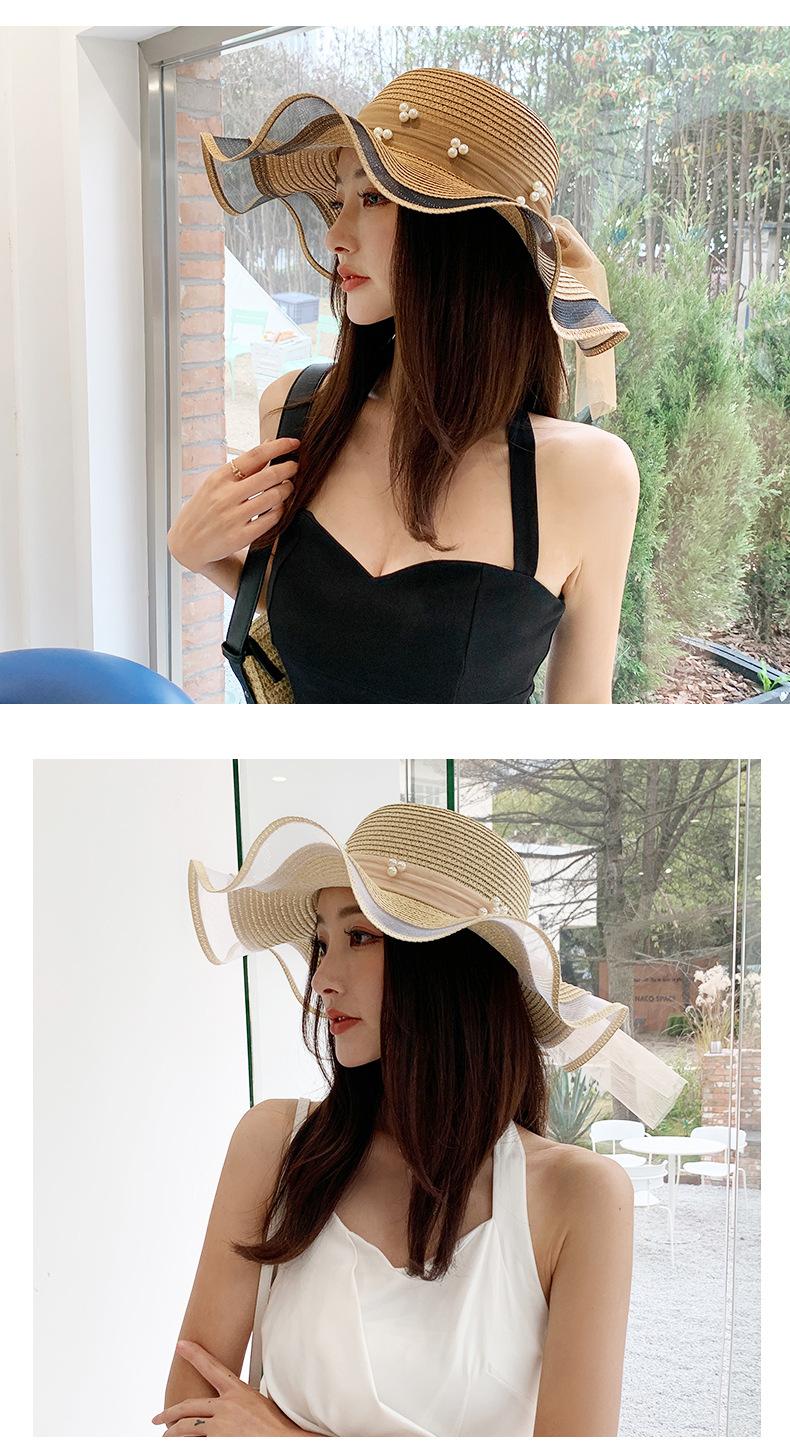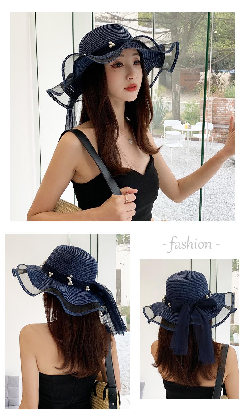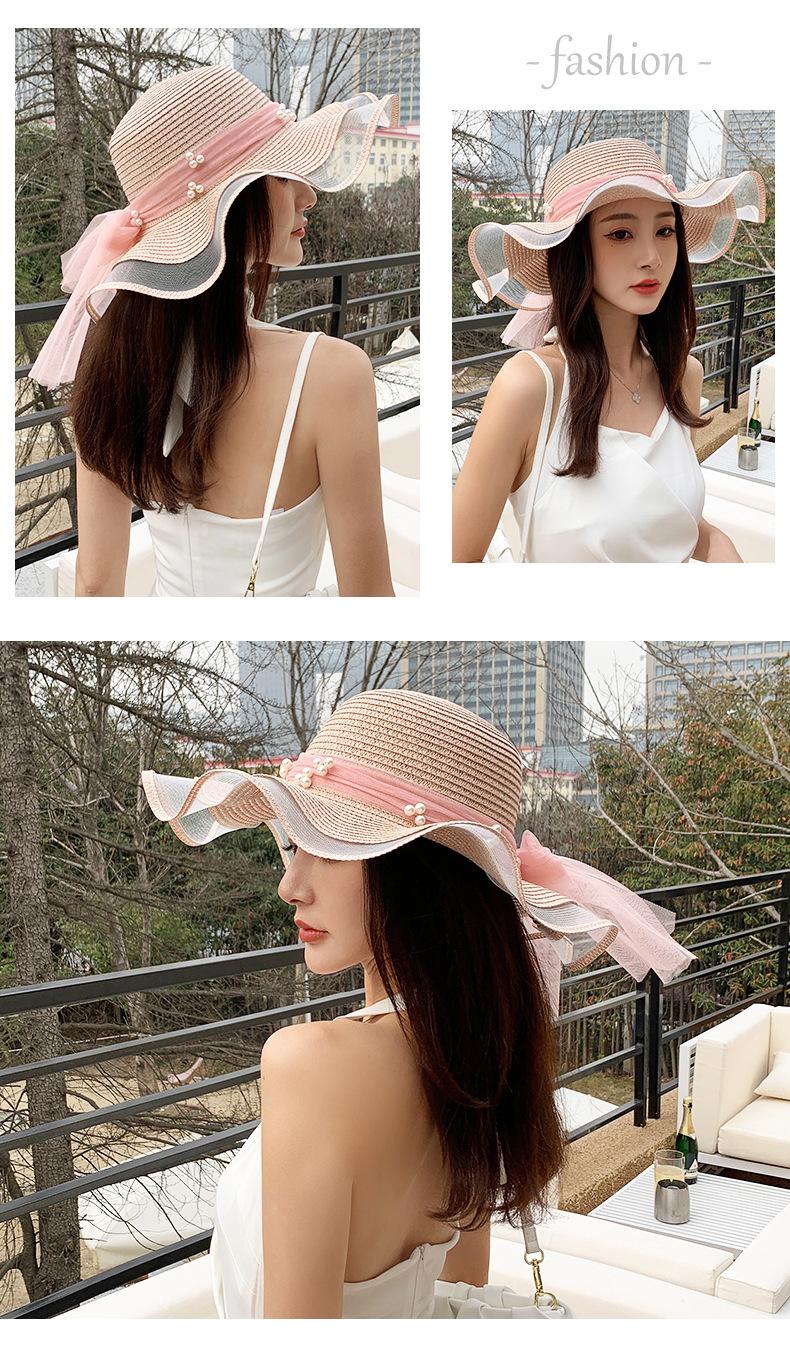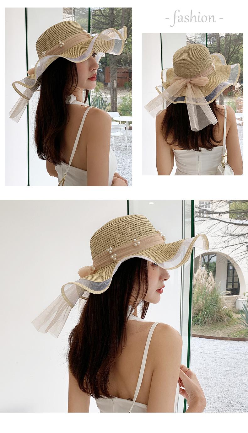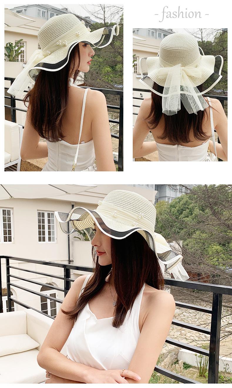 Sombrero de Playa de Ala Ancha con Lazo de Cinta Sombrero de Sol de Verano para Exterior Sombrero de Paja Ondulado Encaje Perla Sombrero de Sol