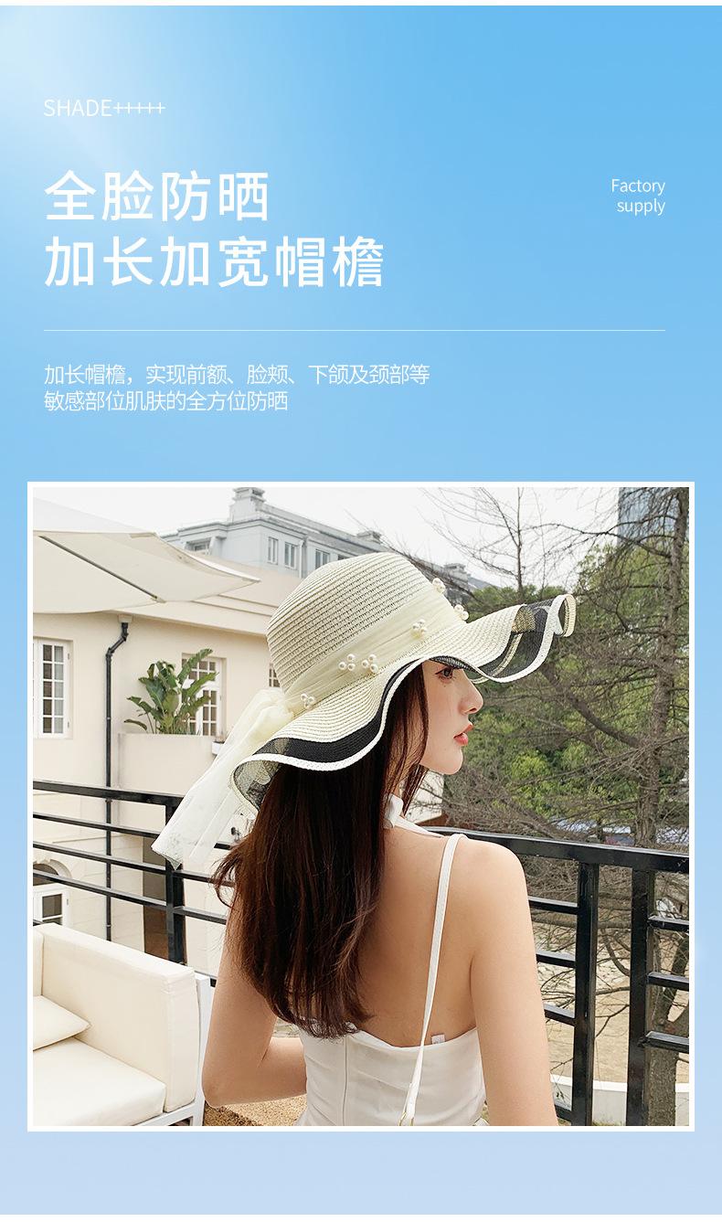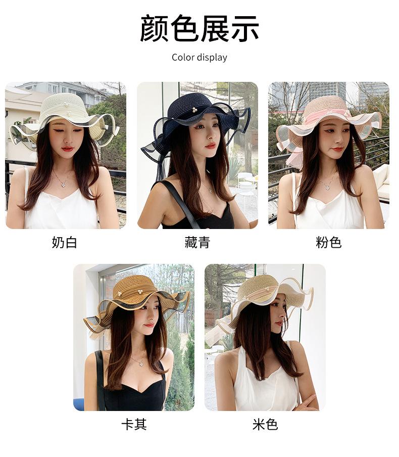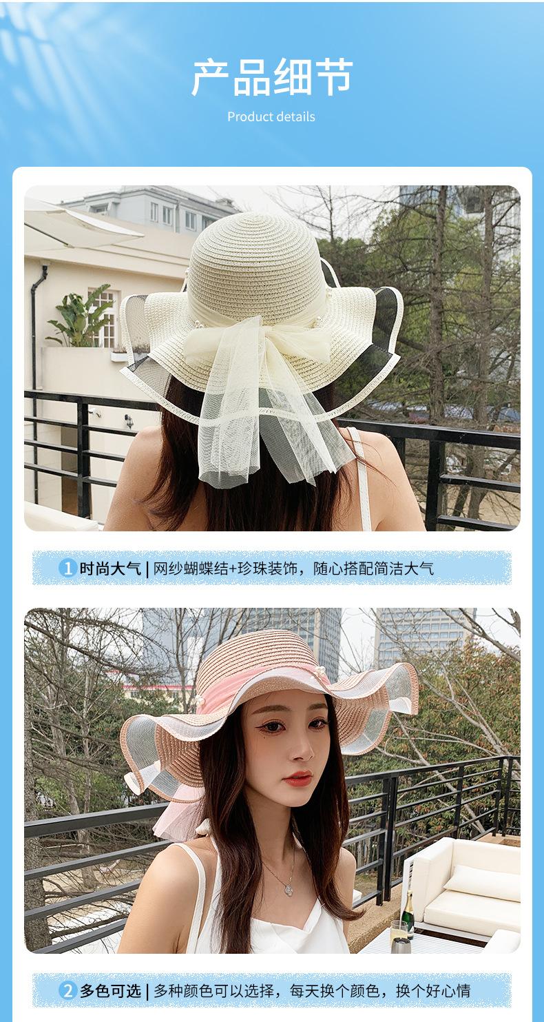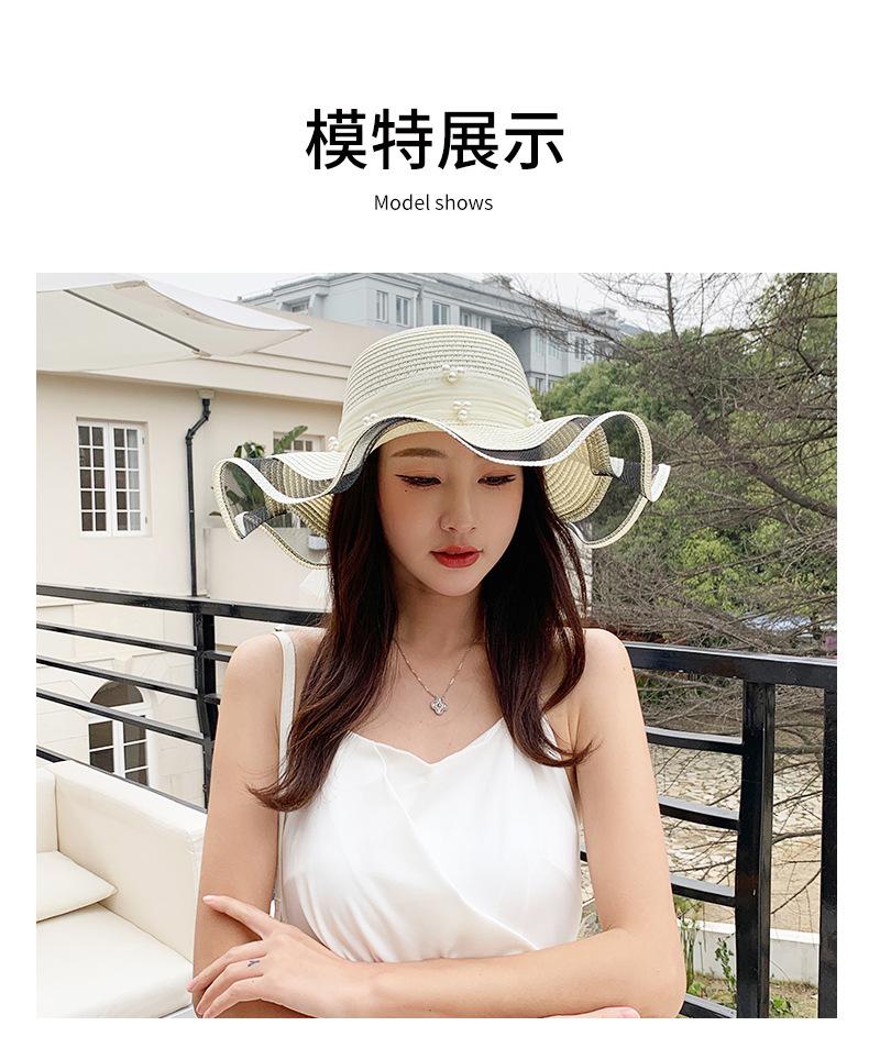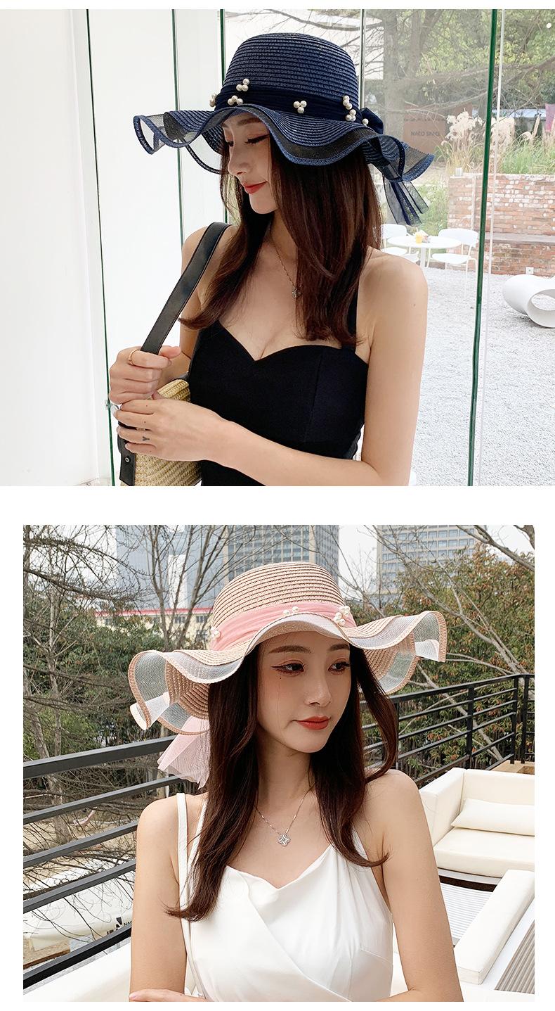 Sombrero de Playa de Ala Ancha con Lazo de Cinta Sombrero de Sol de Verano para Exterior Sombrero de Paja Ondulado Encaje Perla Sombrero de Sol