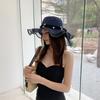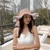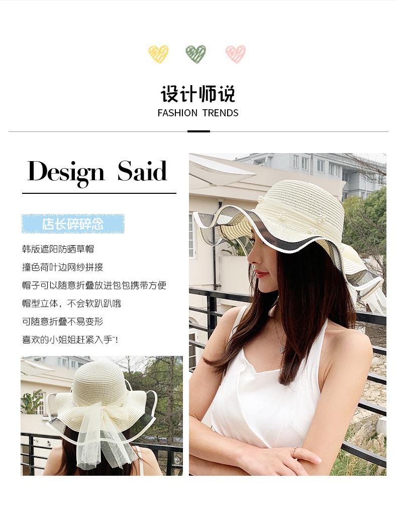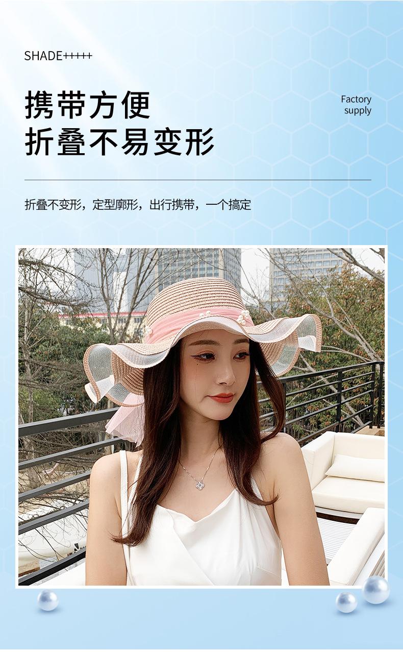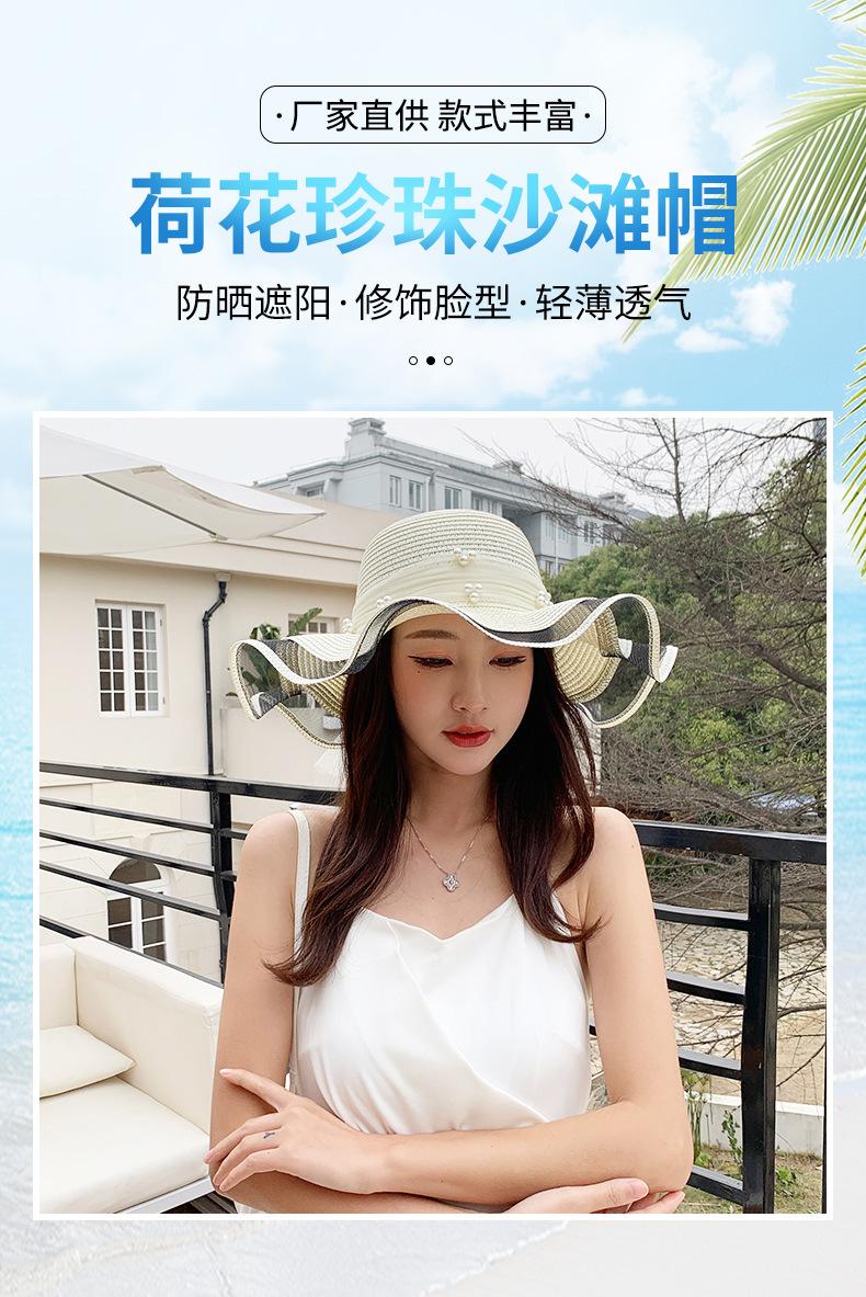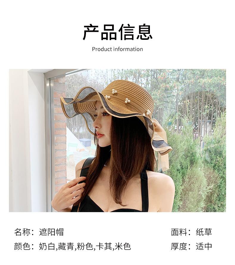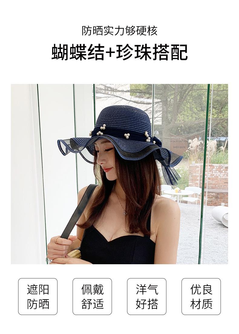 Sombrero de Playa de Ala Ancha con Lazo de Cinta Sombrero de Sol de Verano para Exterior Sombrero de Paja Ondulado Encaje Perla Sombrero de Sol
