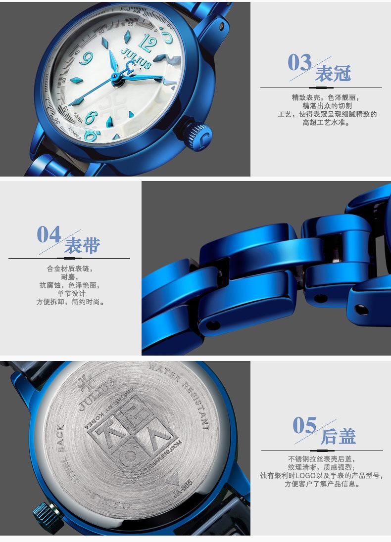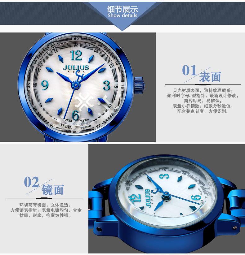 El significado de la marca JULIUS es alegre, único, amoroso, ideal, inusual y brillante. Es un reloj único que te enamorará a primera vista (Just You Will Love, un reloj único y especial). JULIUS toma este nombre y cuenta con siete series principales: Serie Clásica, Serie Emocionante, Serie Brazalete, Serie Exploración, Serie Pareja, Serie Hombre y Serie Edición Limitada.
