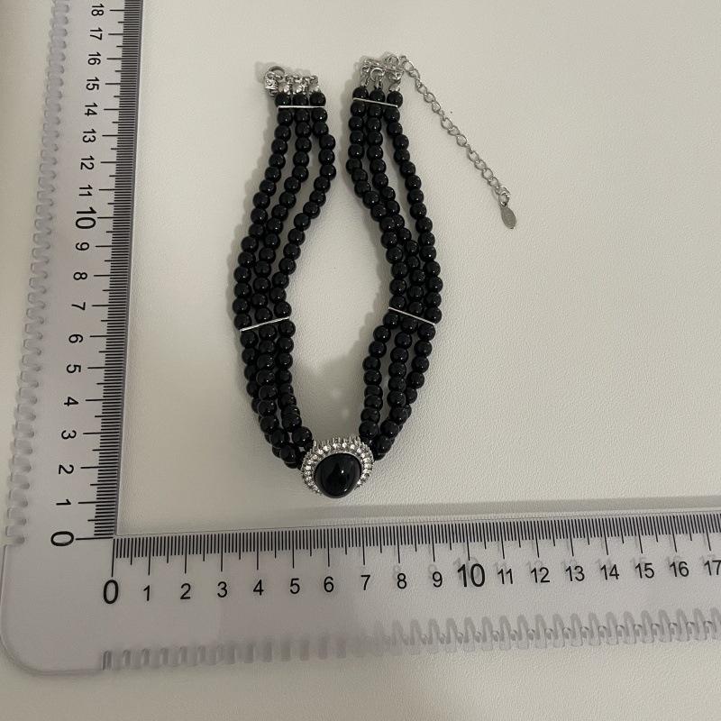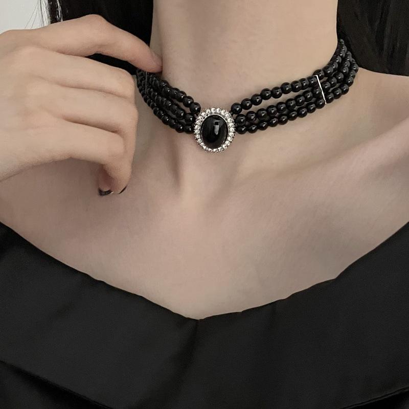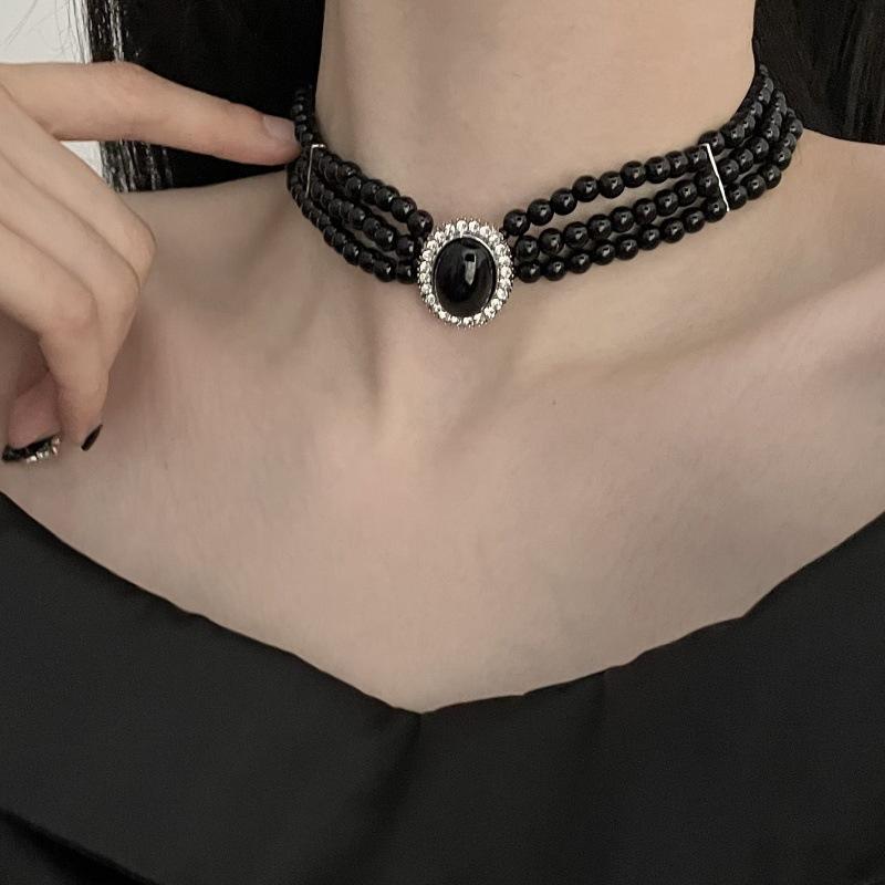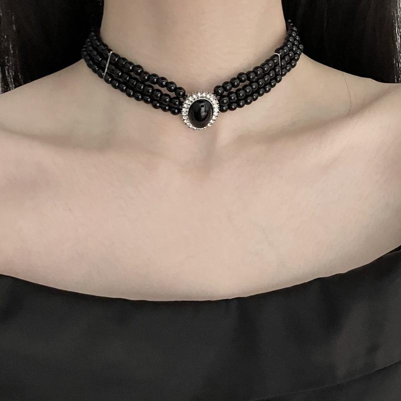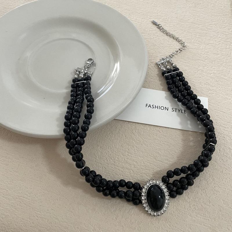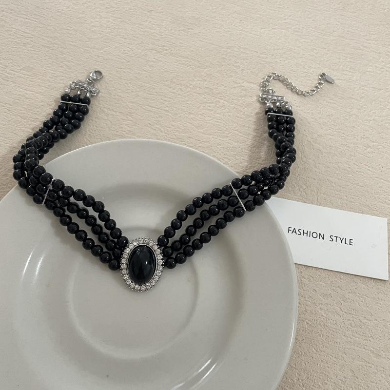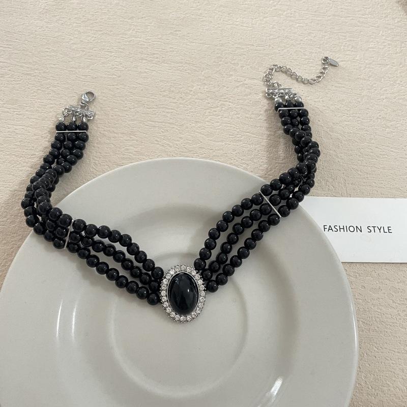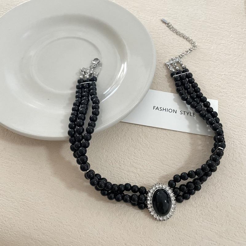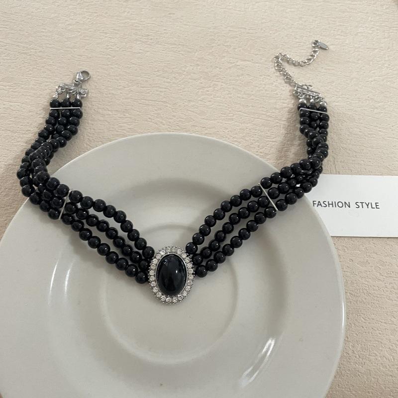 Collar de lujo de alta gama con cadena de clavícula de cuentas multicapa negras clásicas retro francesas, de moda europea y americana.