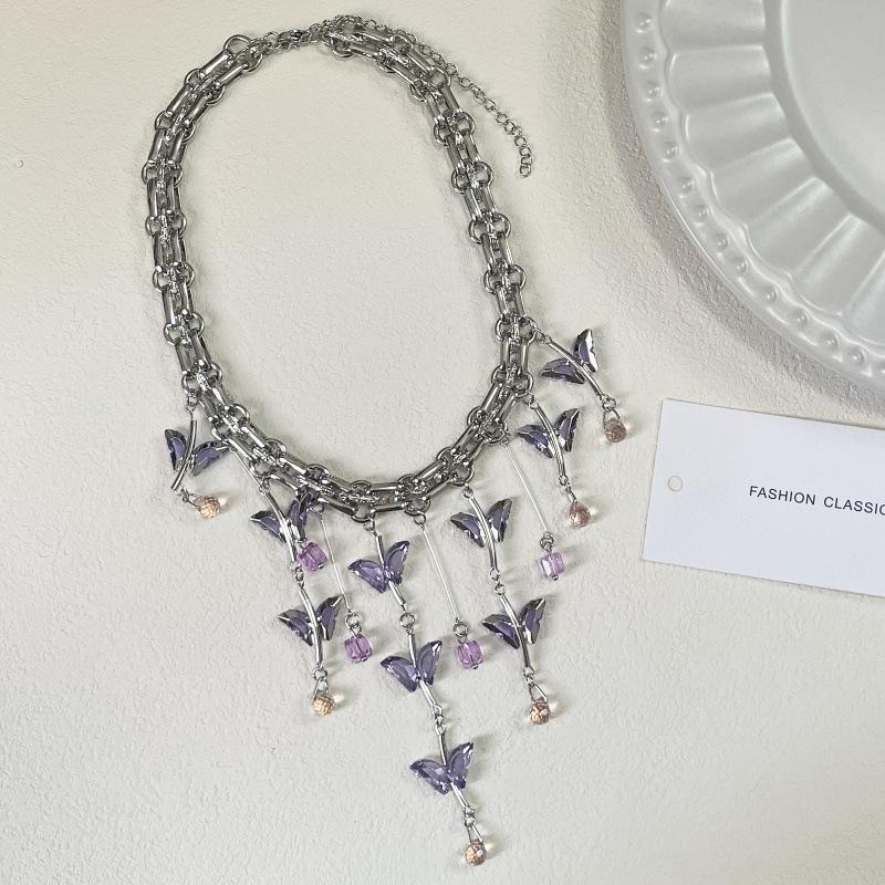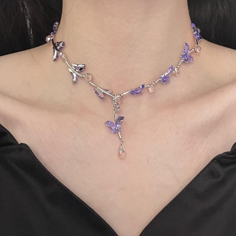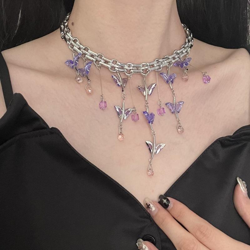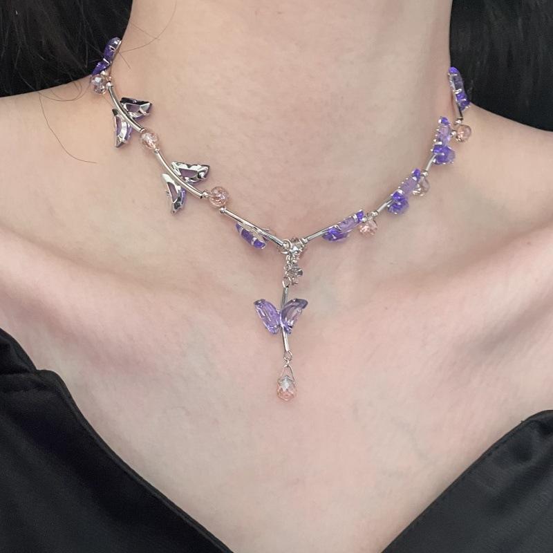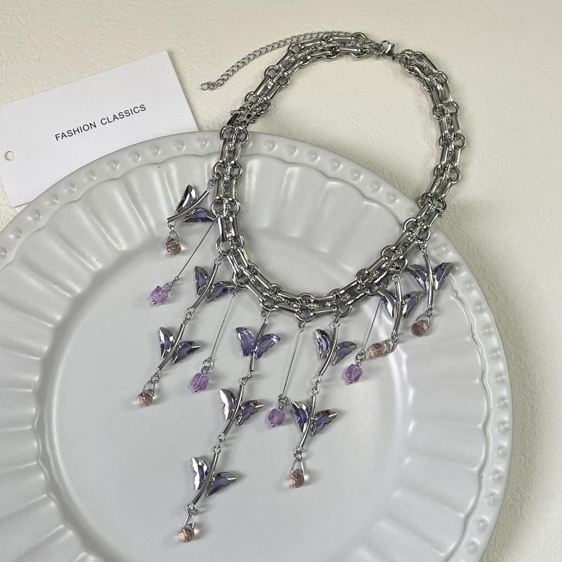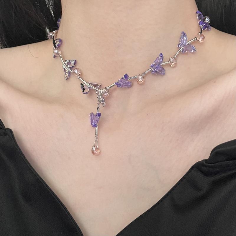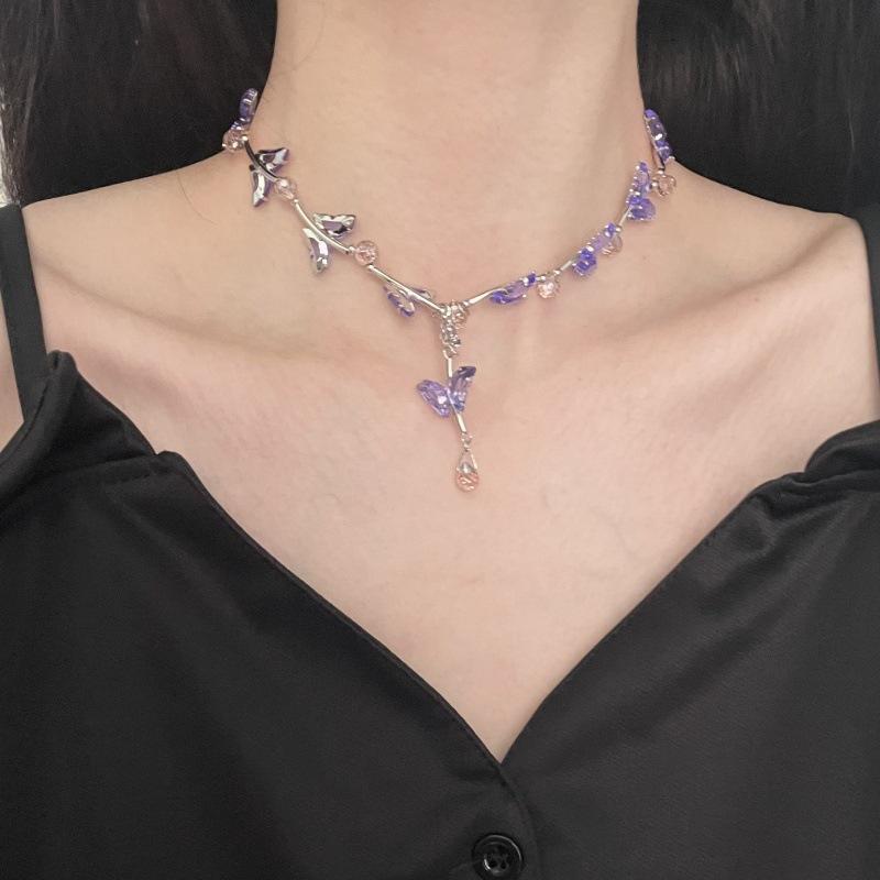 Collar con borlas de mariposa morada, elegante y a la moda, con diseño de nicho, cadena para el cuello, exquisita cadena para clavícula.