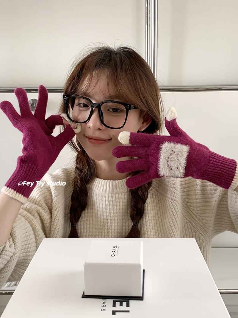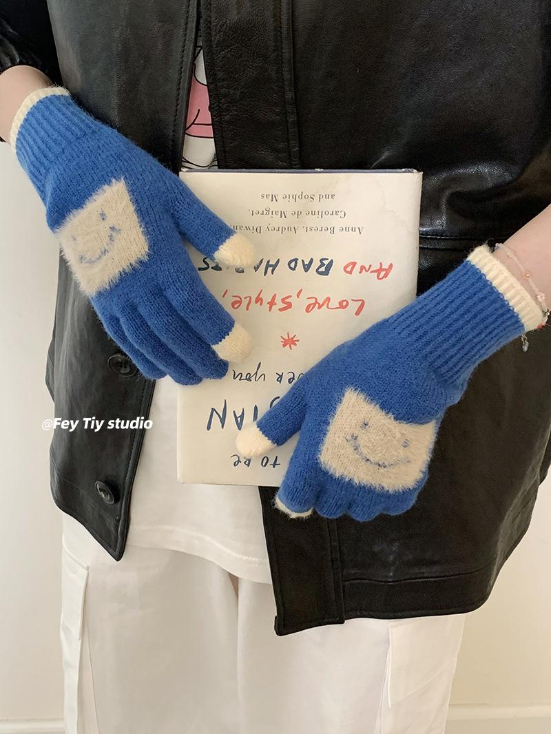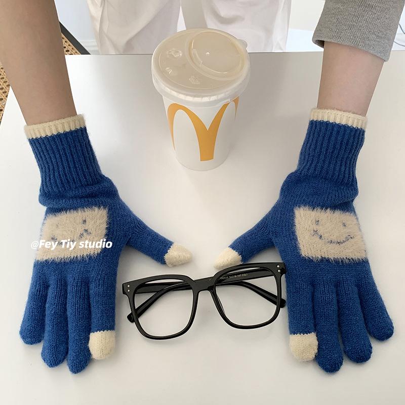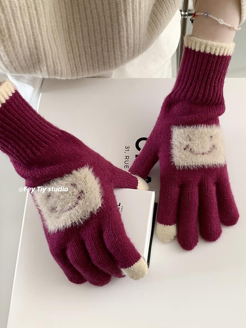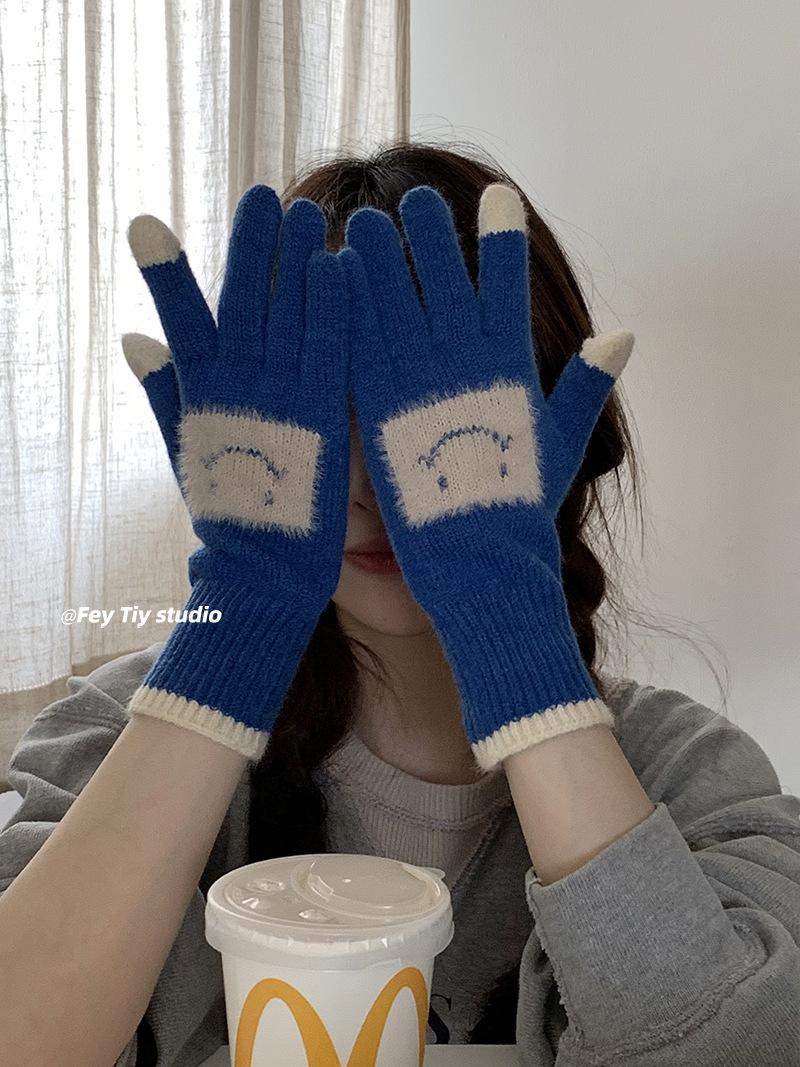 Otoño e Invierno Corea del Sur ins nuevos guantes de punto smiley para mujer de cinco dedos color sólido pantalla táctil cálidos lindos moda