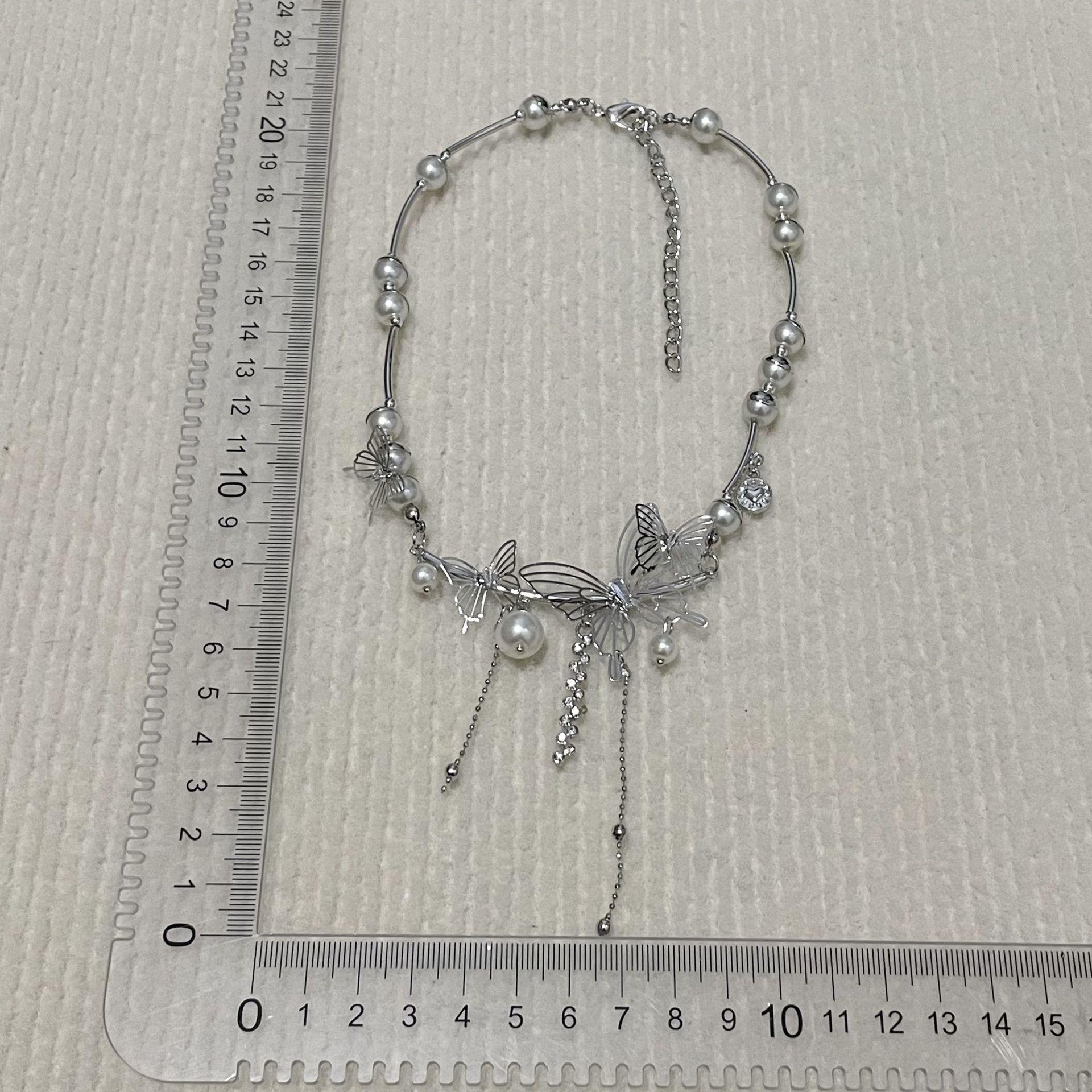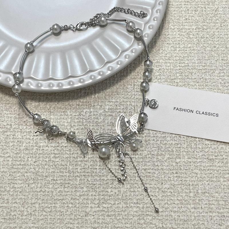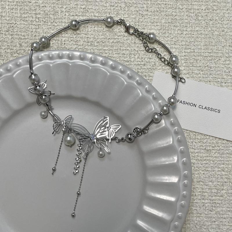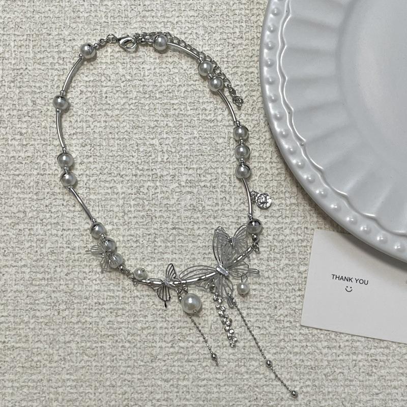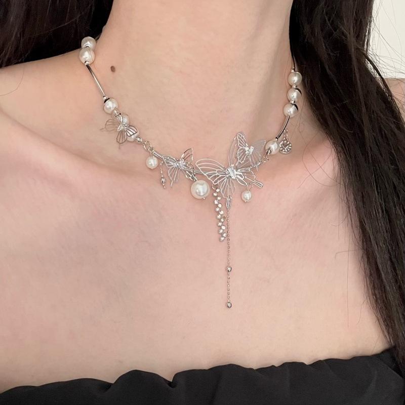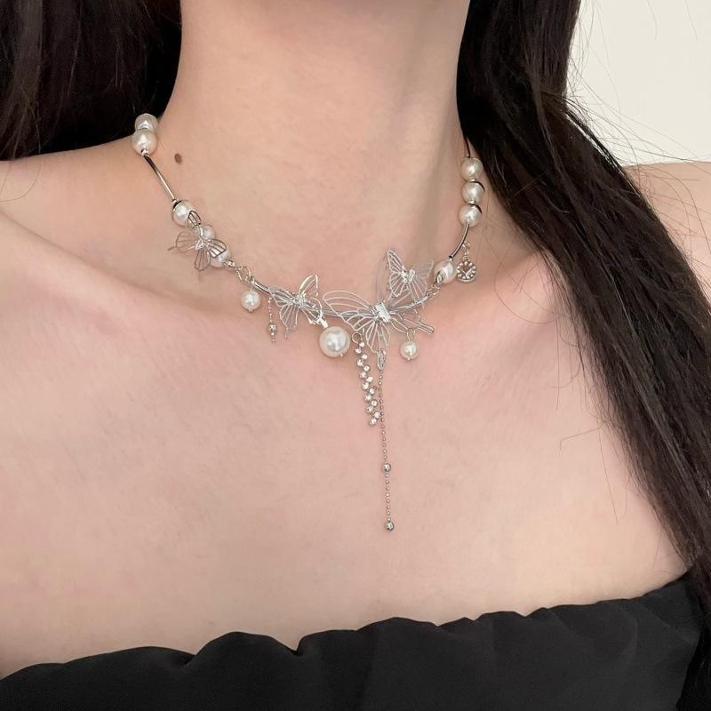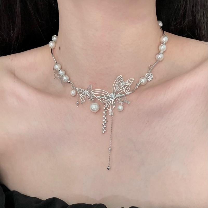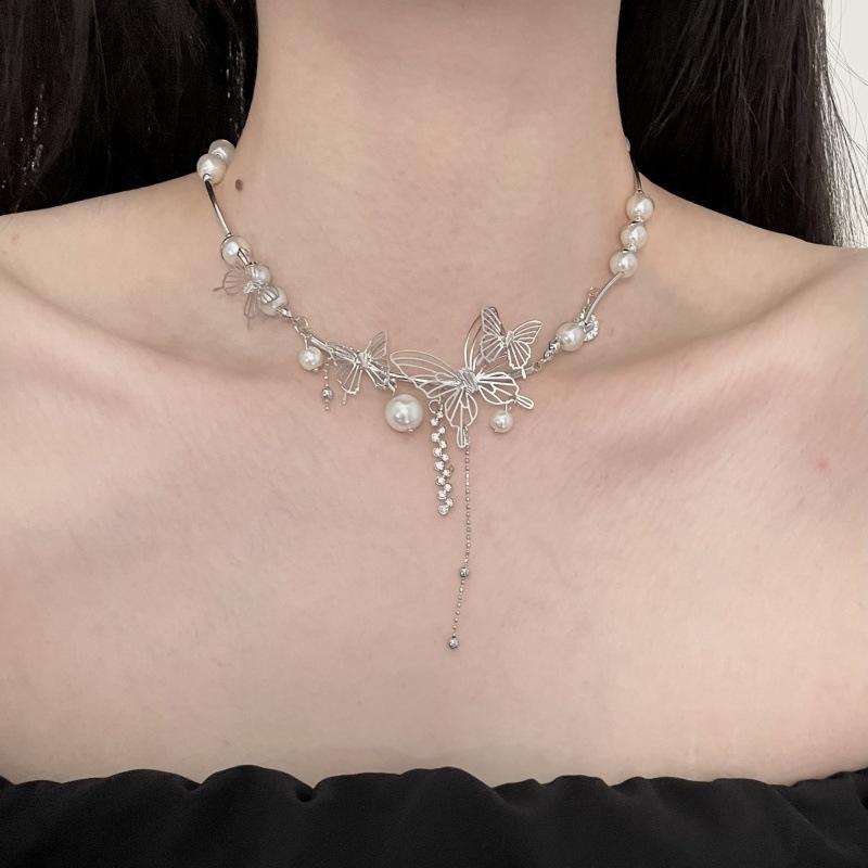 Collar con borlas de perlas y mariposas huecas, elegante y moderno, ligero, de lujo, con diseño de nicho exquisito, cadena de clavícula de alta gama, nuevo