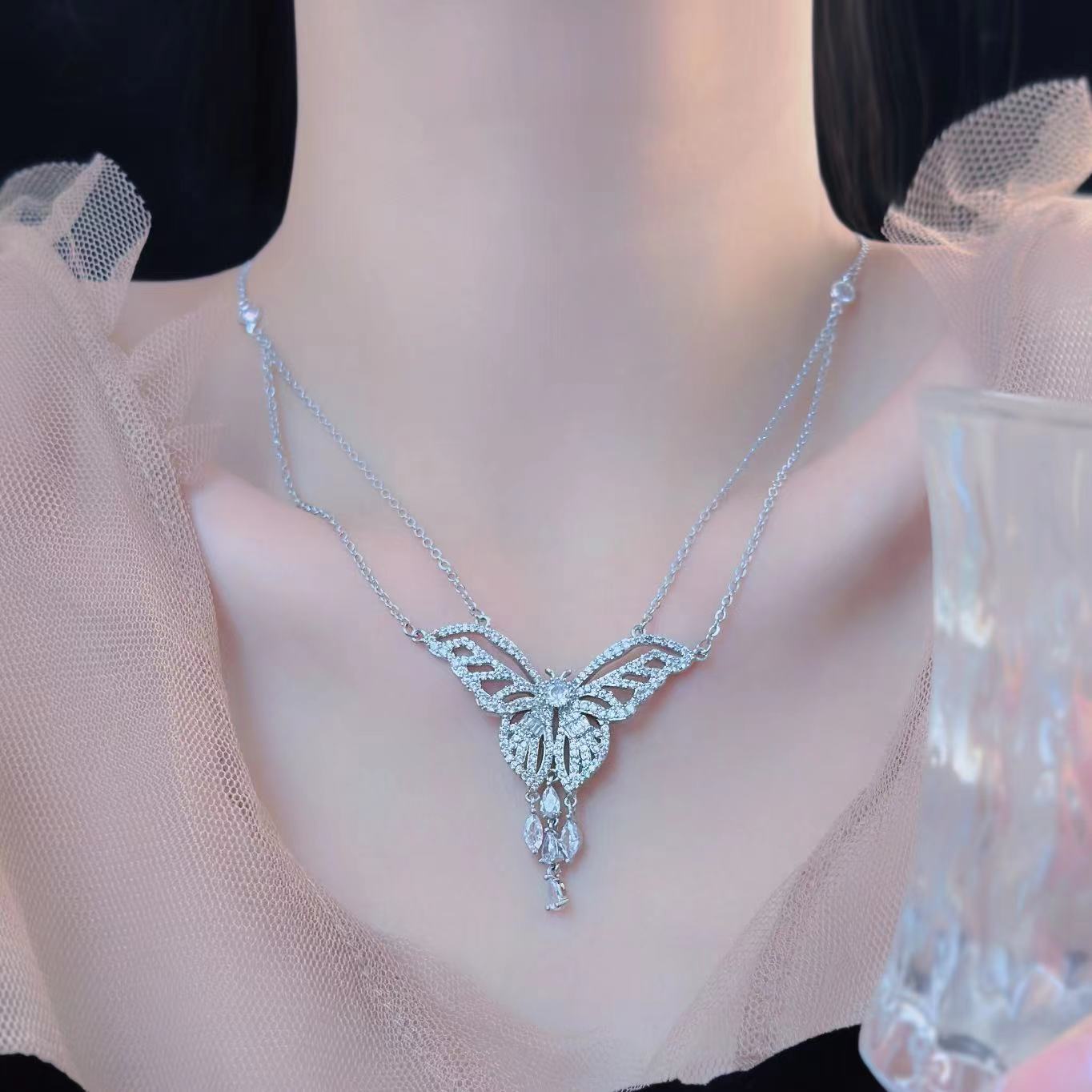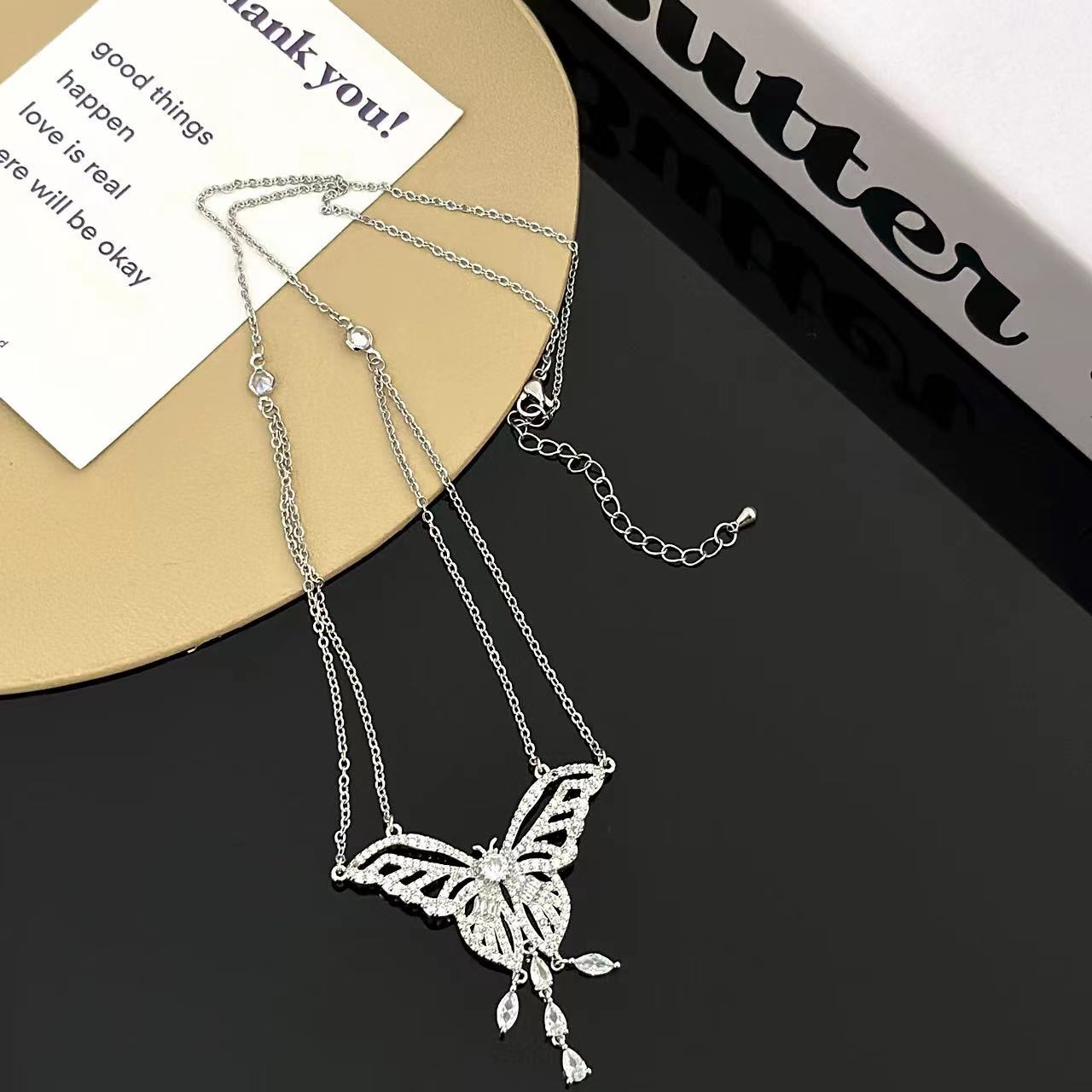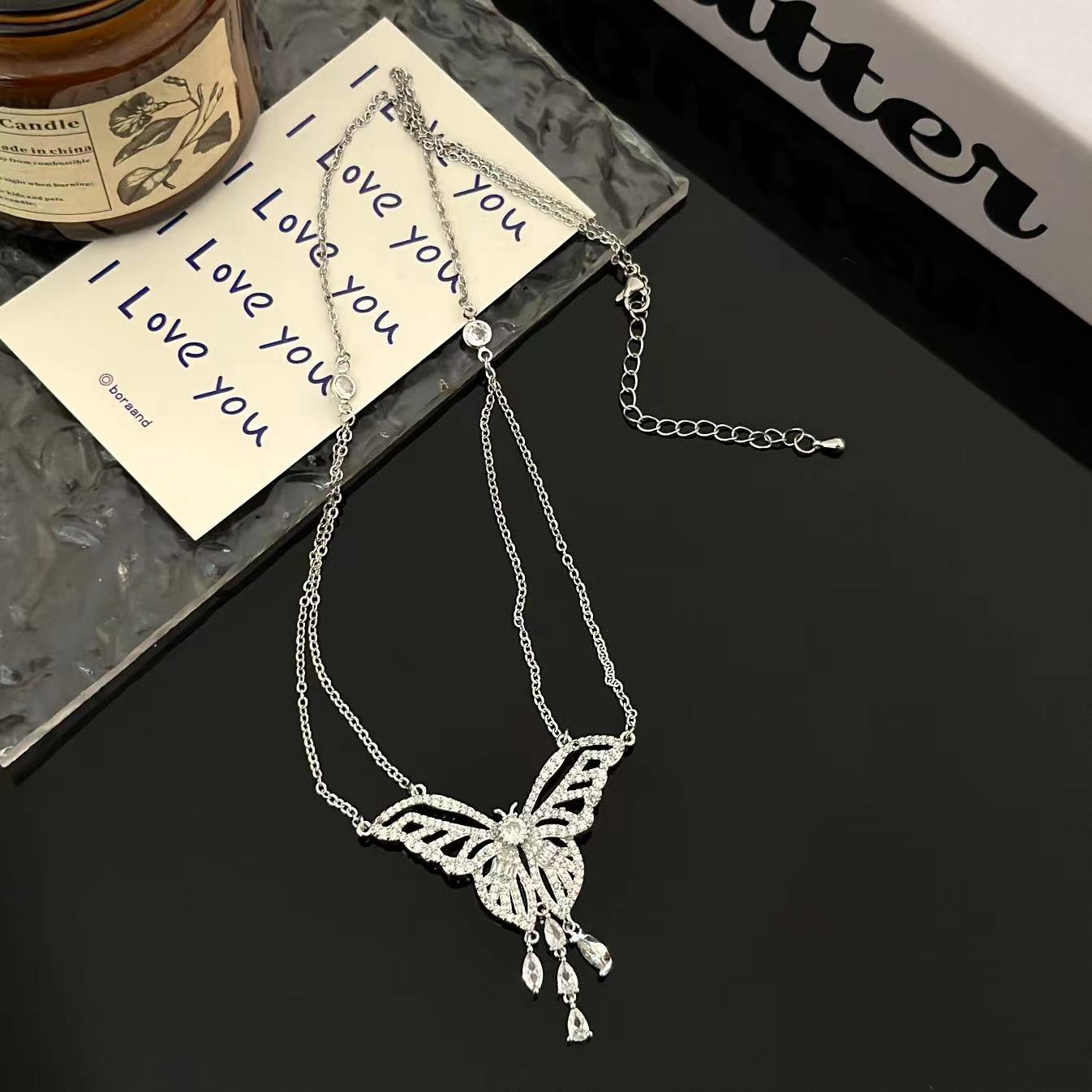 Colgante de borla de mariposa con microincrustaciones, cadena de clavícula de doble capa, diseño de nicho femenino, collar elegante de lujo ligero de alta calidad a la moda.
