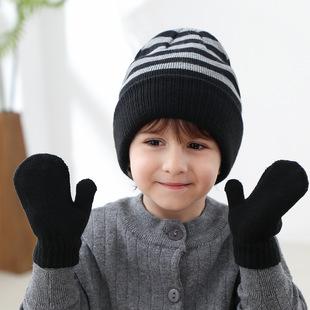 Conjunto de gorro y guantes para niños transfronterizos, conjunto de dos piezas de gorro y guantes cálidos de lana a rayas de estilo europeo y americano para niños y niñas