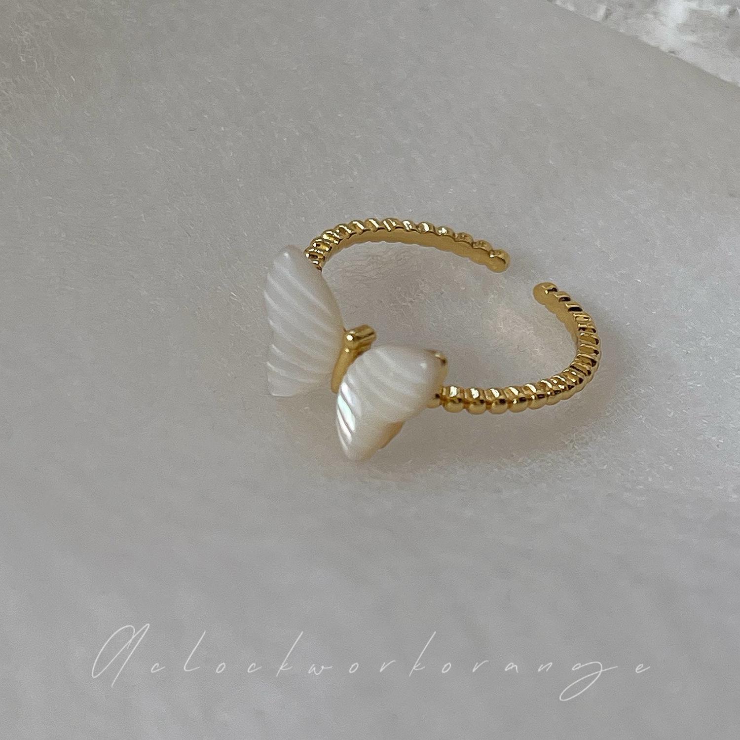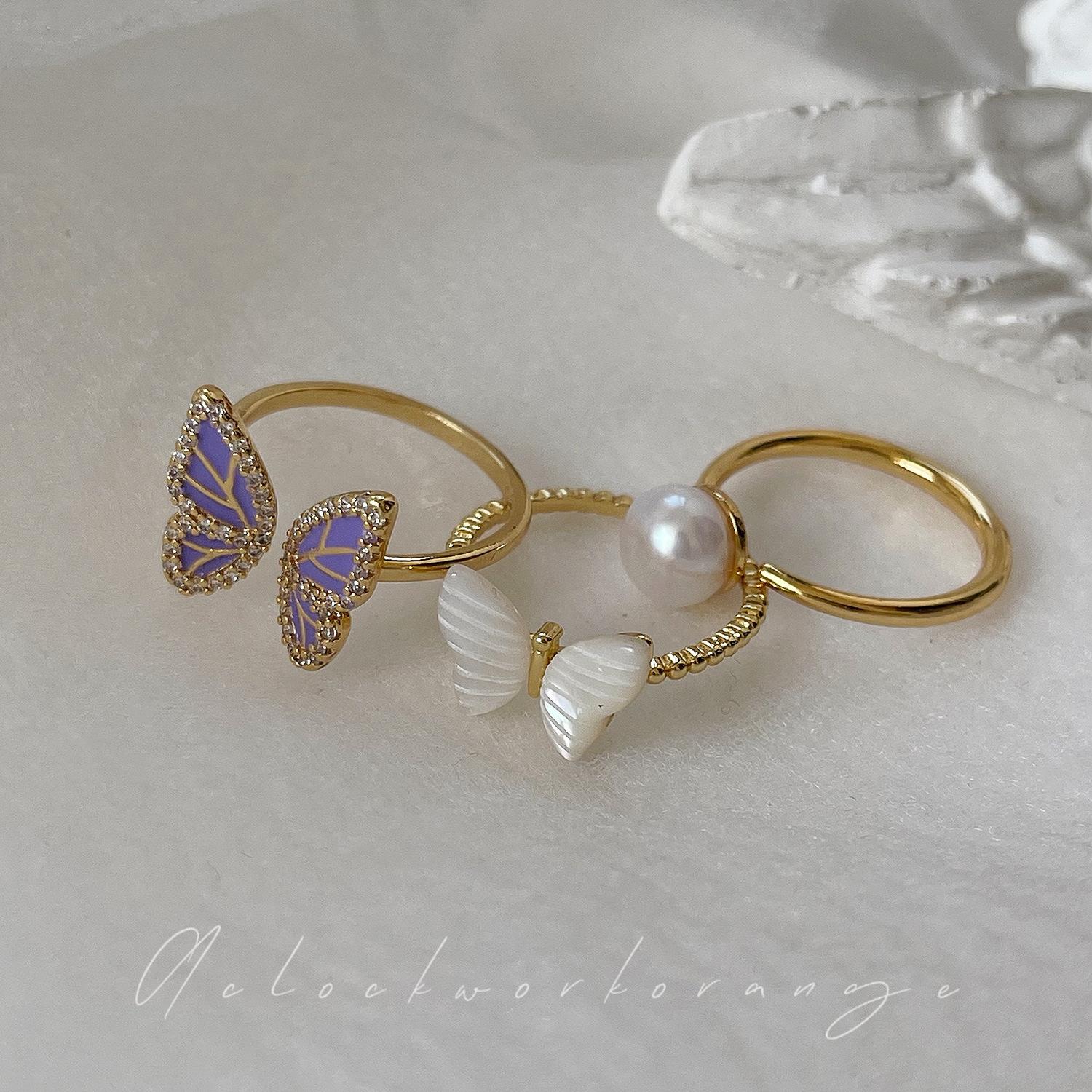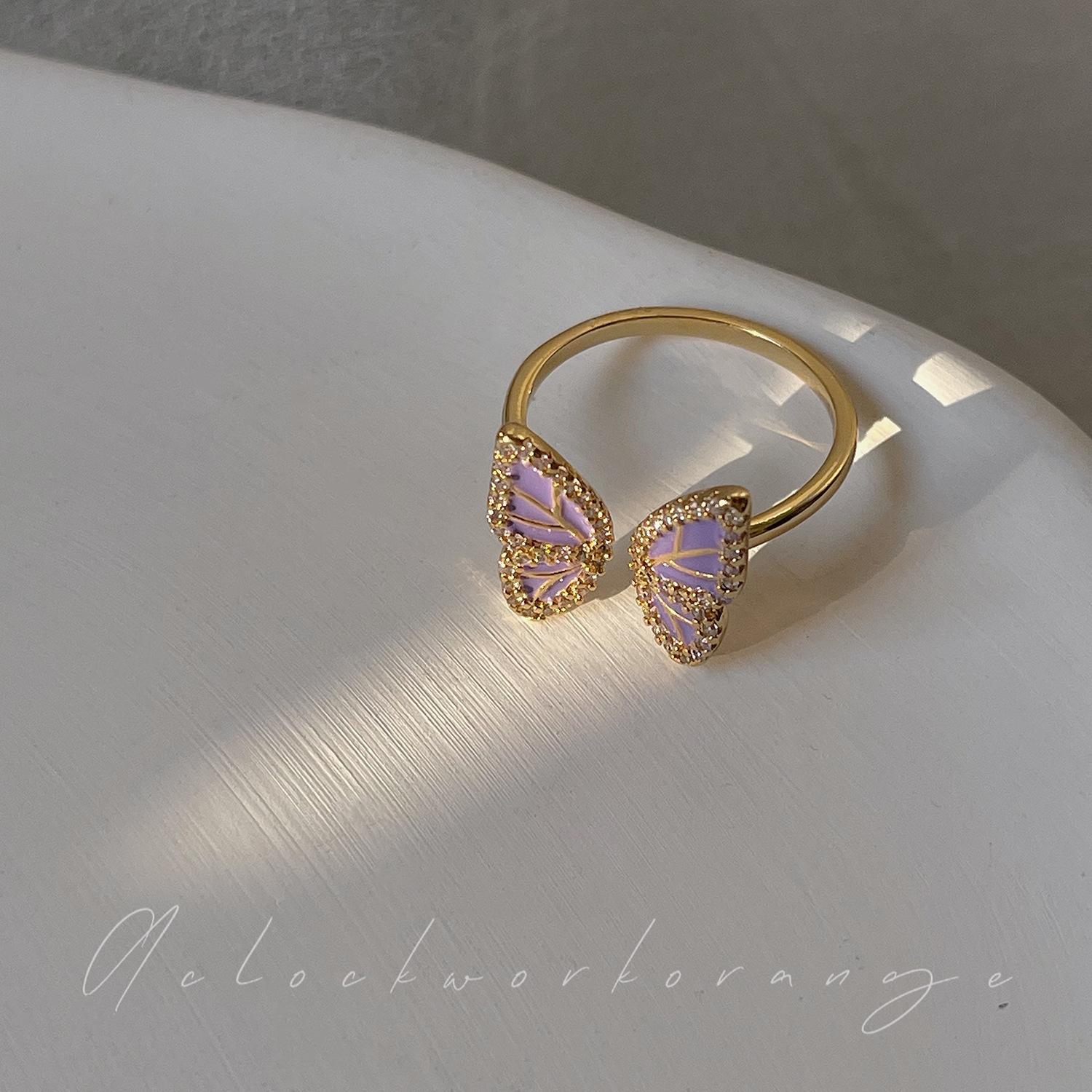 Anillo de mariposa morado y dorado de alta calidad para mujer, exquisito, de lujo ligero, elegante, con imitación de perla, plata S925, anillo abierto para dedo, anillo para dedo de comida, moda