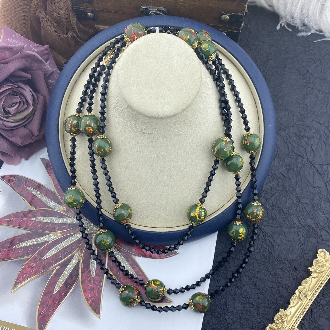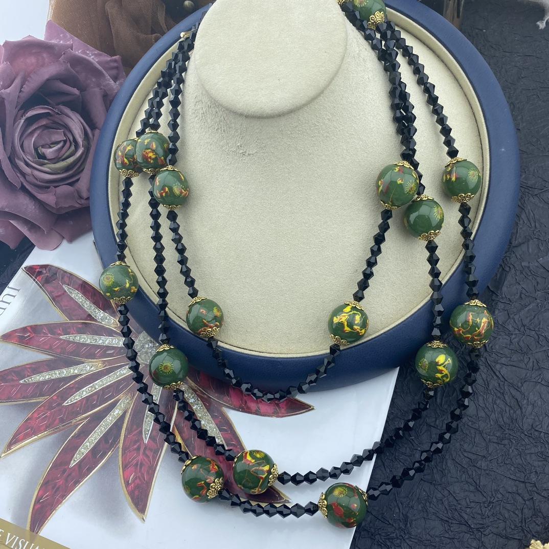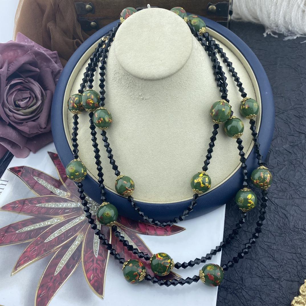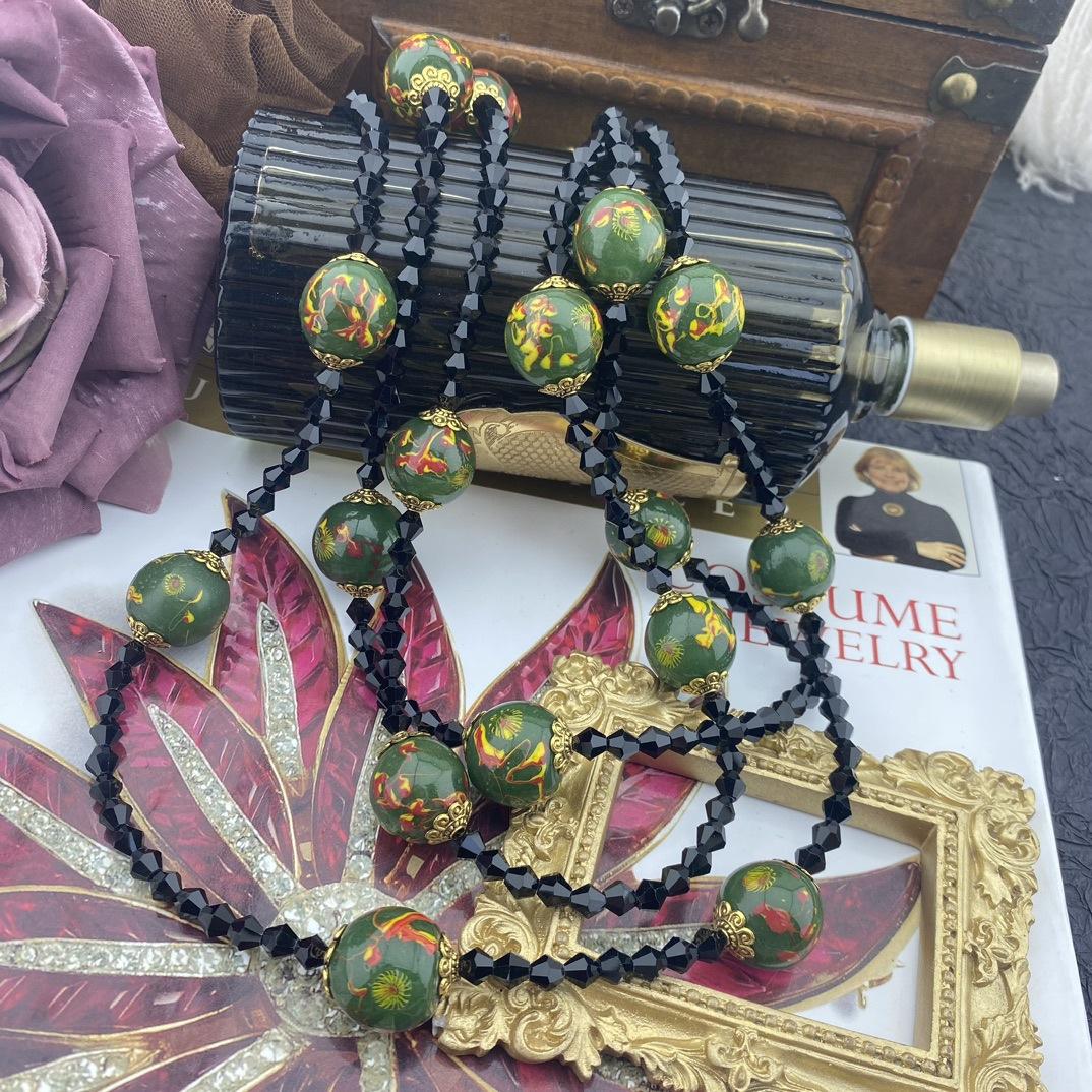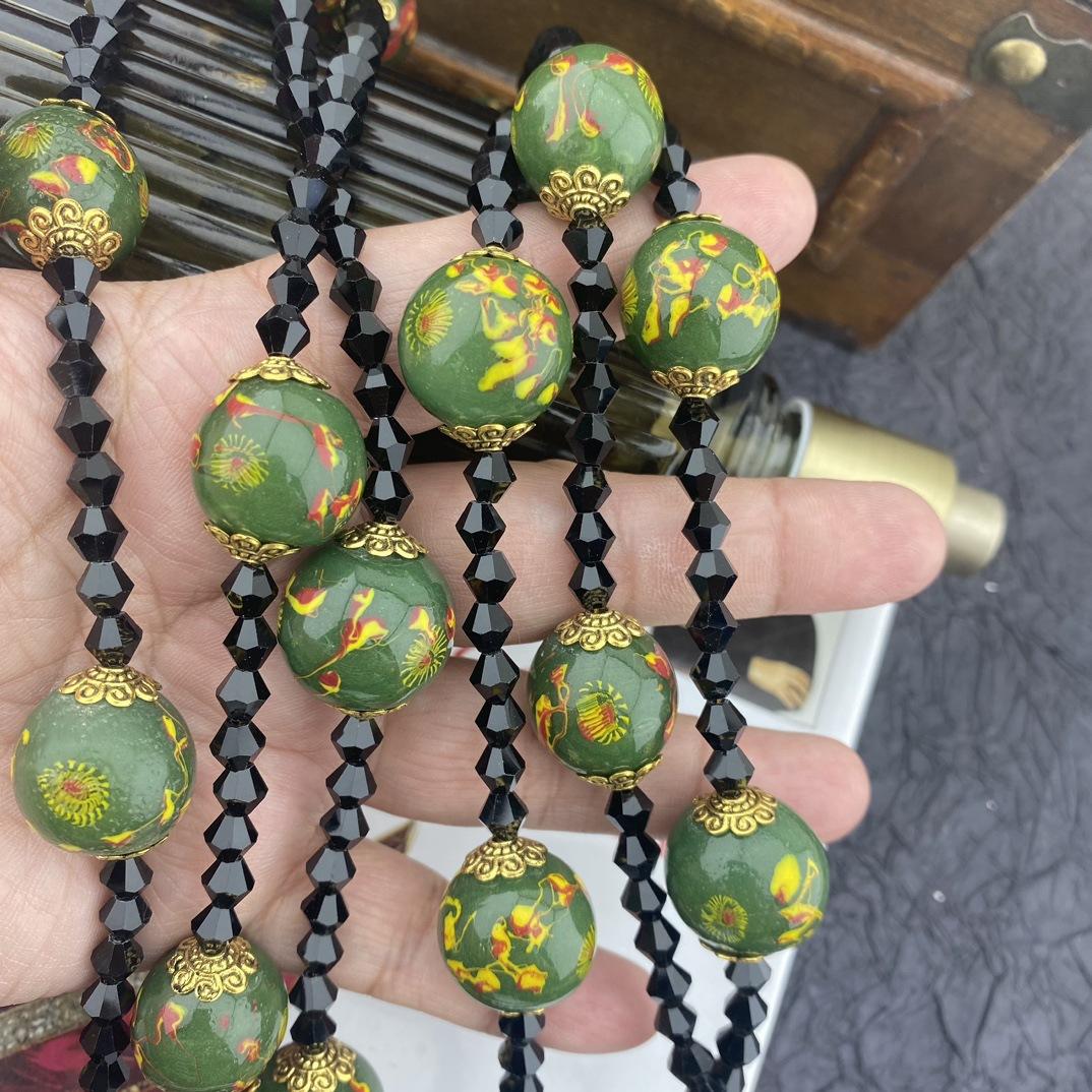 Collar largo de esmalte de color con forma de ojo de fénix verde de material antiguo vintage de Mi Nan Zhonggu con pequeñas cuentas de pétalos de lámina de oro