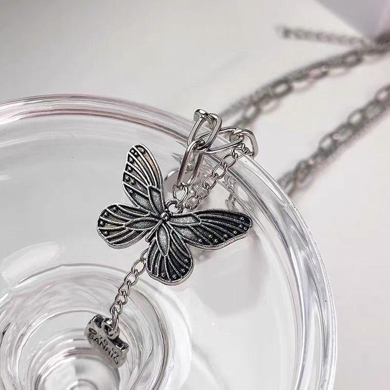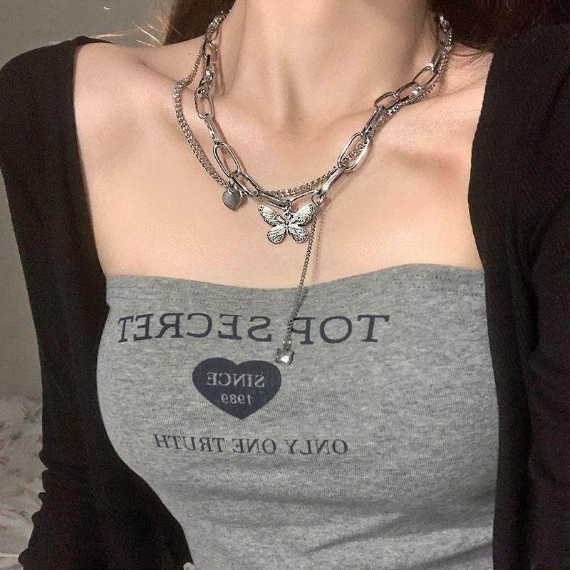 Collar de cadena de doble capa con costuras de mariposa de amor plegable para mujer, estilo hip hop, estilo frío, diseño de chica sexy, cadena de clavícula con sentido