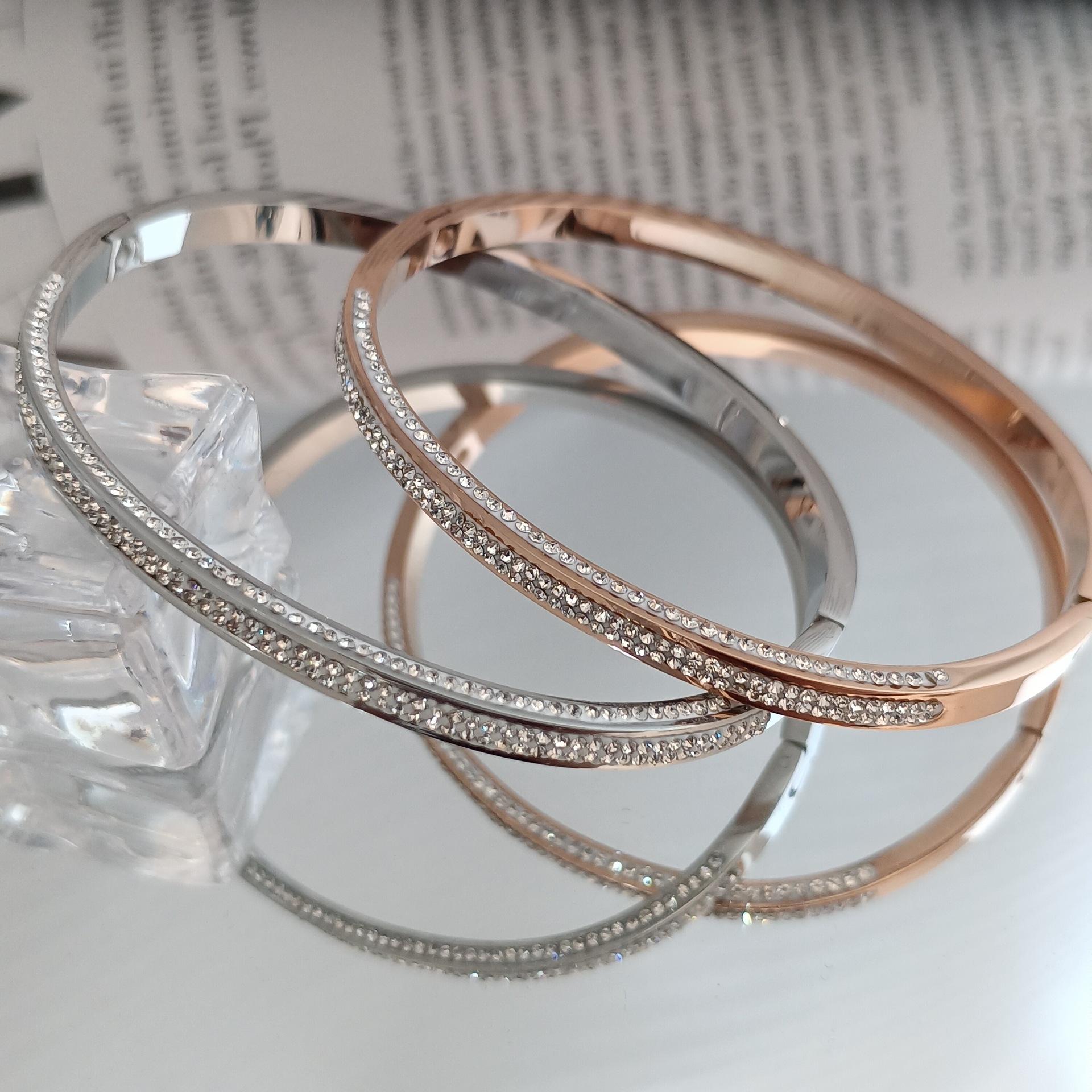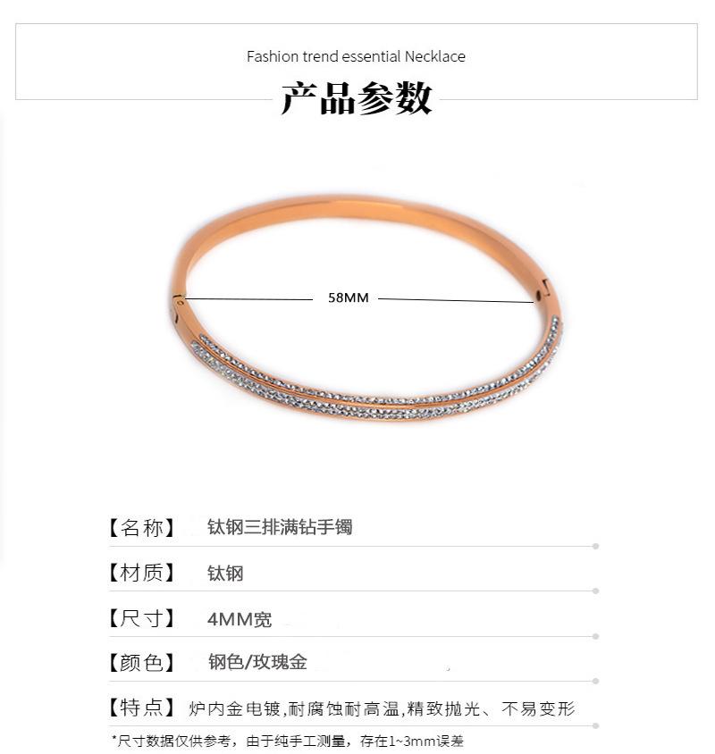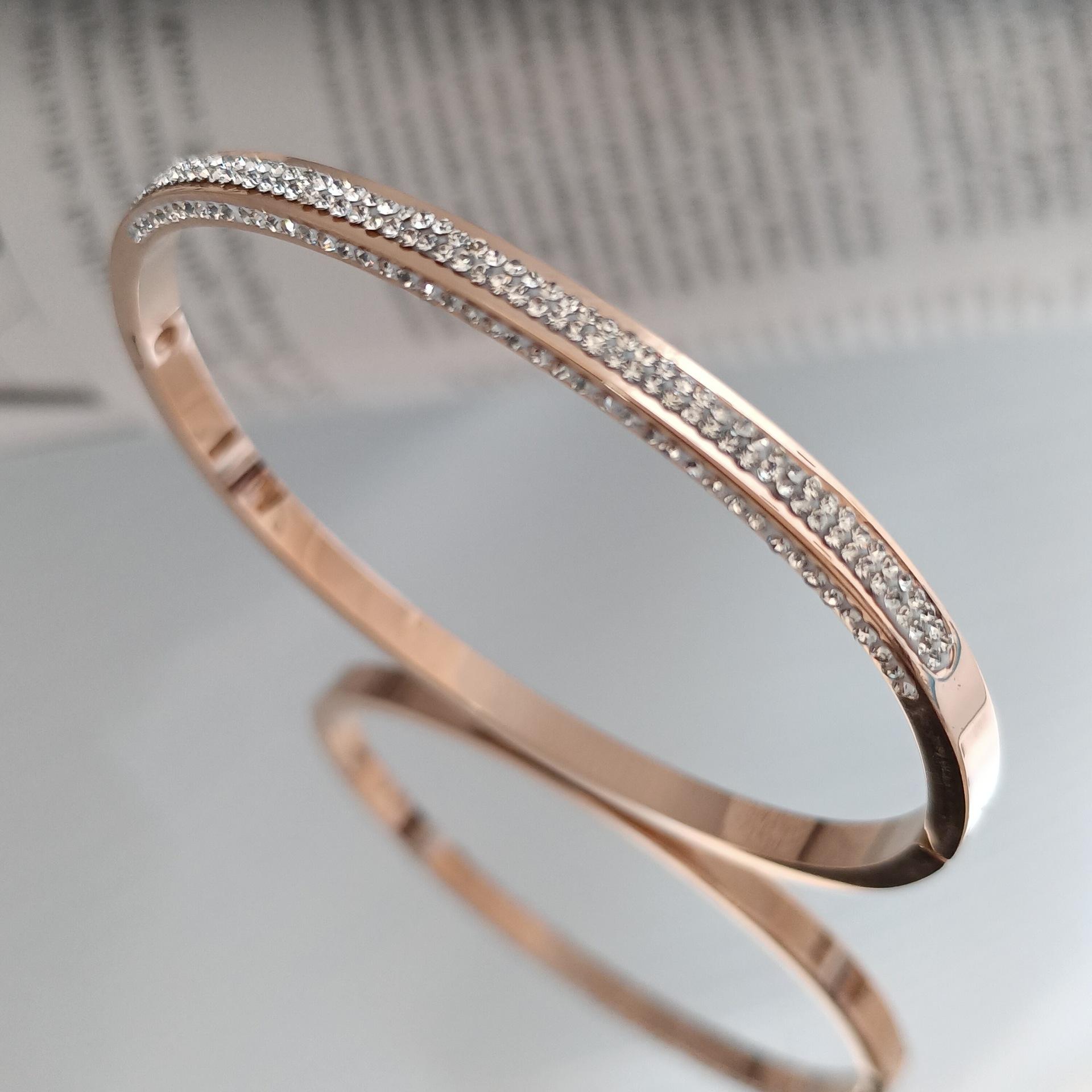 Pulsera europea y americana de diamantes de oro rosa de 18 quilates de acero de titanio para mujer, que no se desvanece, estrellada, estrecha de tres filas, pulsera de diamantes para el día a día