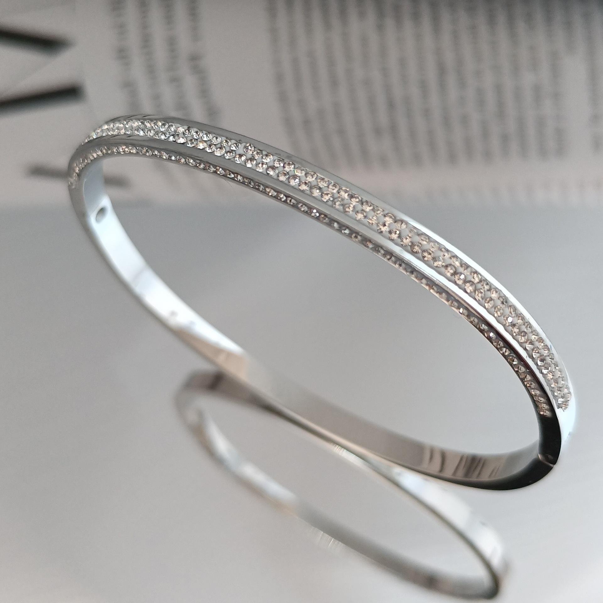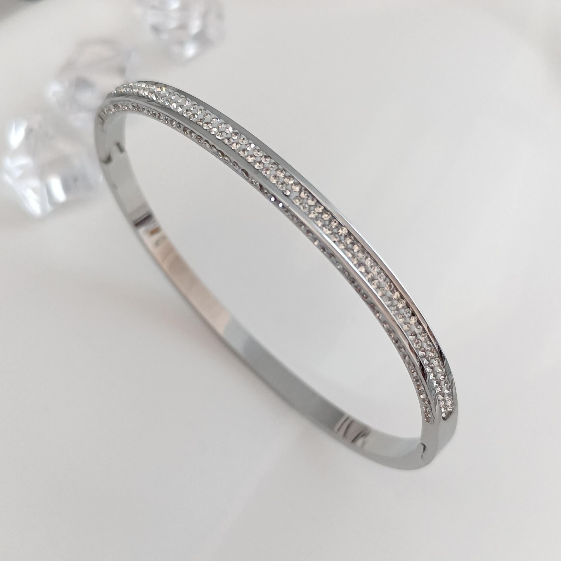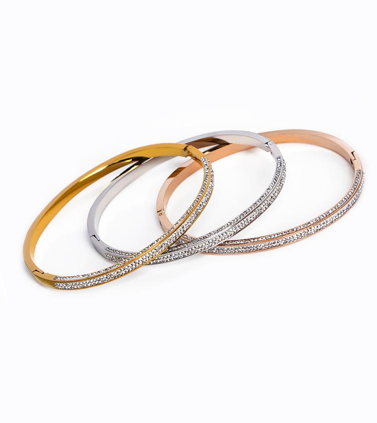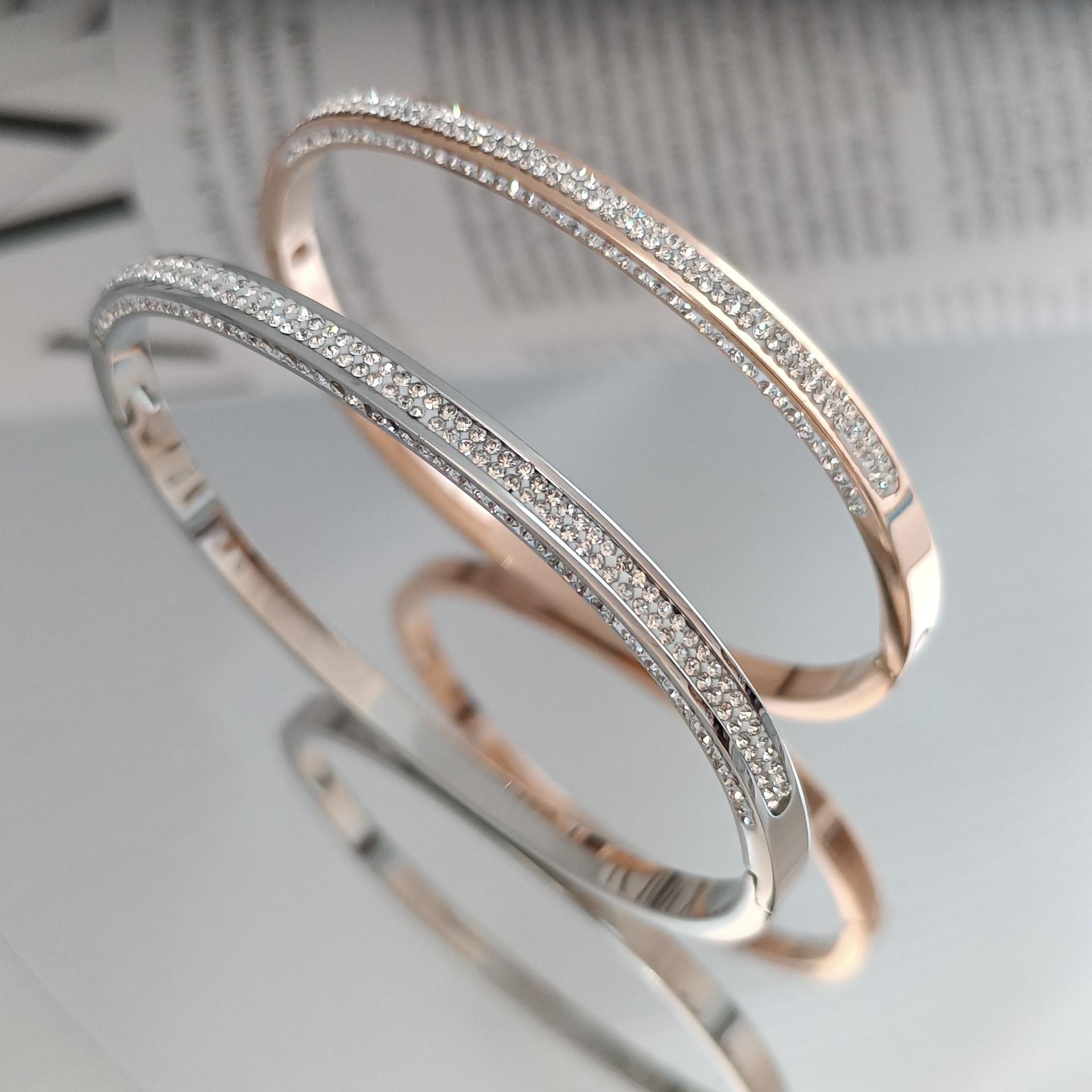 Pulsera europea y americana de diamantes de oro rosa de 18 quilates de acero de titanio para mujer, que no se desvanece, estrellada, estrecha de tres filas, pulsera de diamantes para el día a día