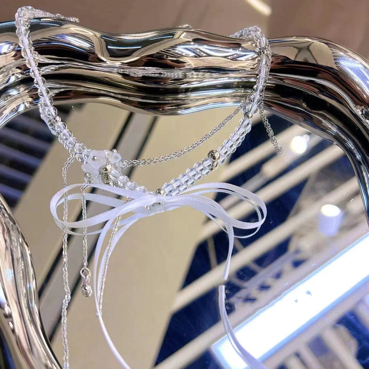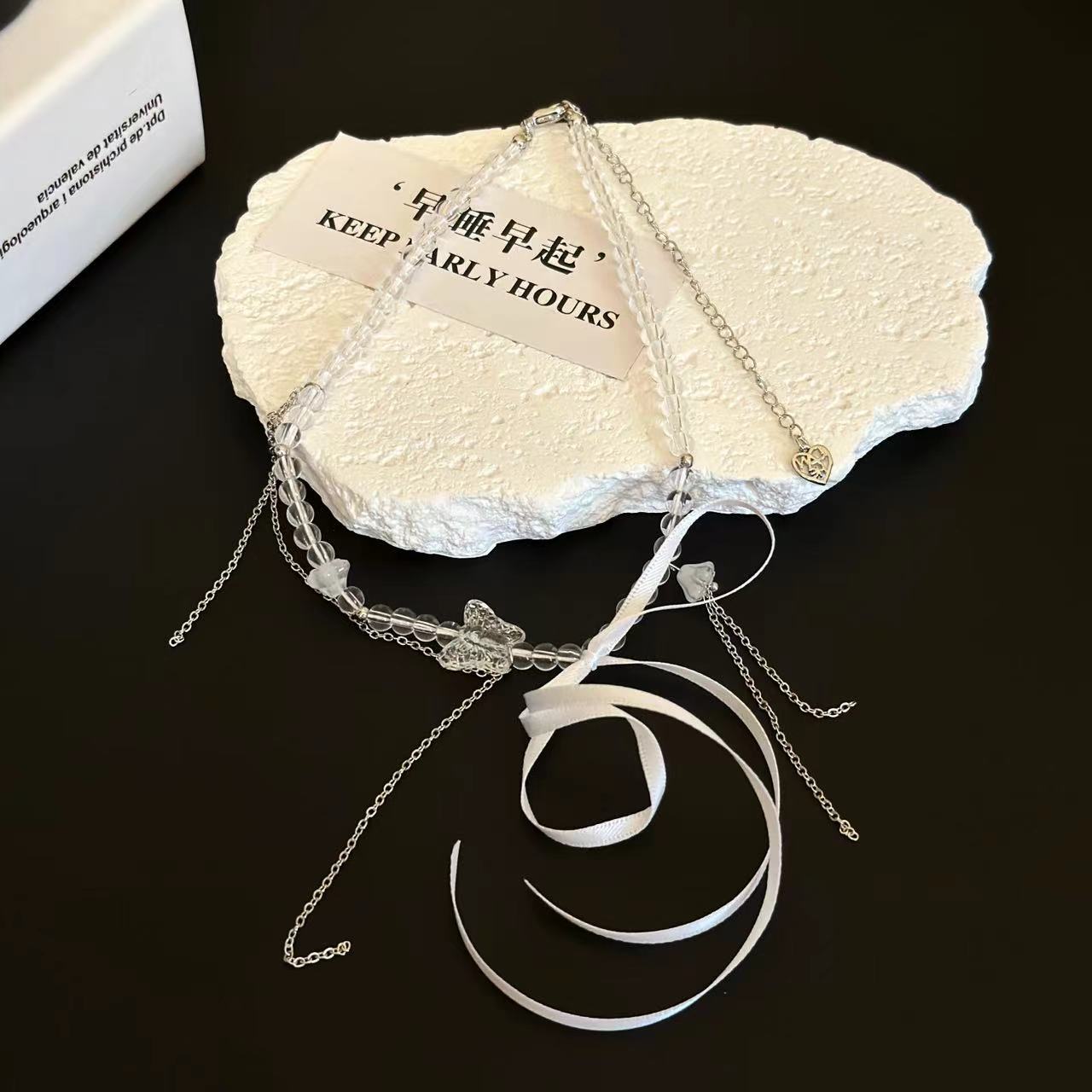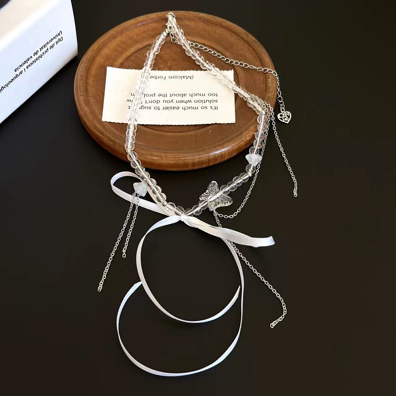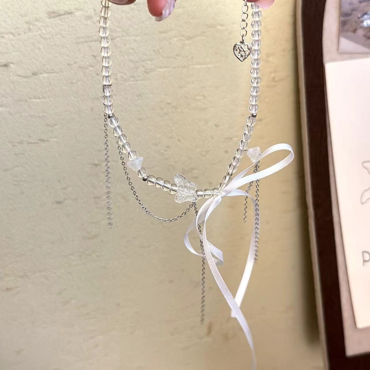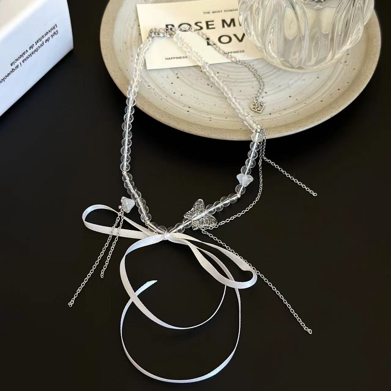 Collar de cuentas de cristal con lazo dulce, cadena de clavícula con nicho, elegante, de alta gama, ligero, de lujo, exquisito collar de cadena