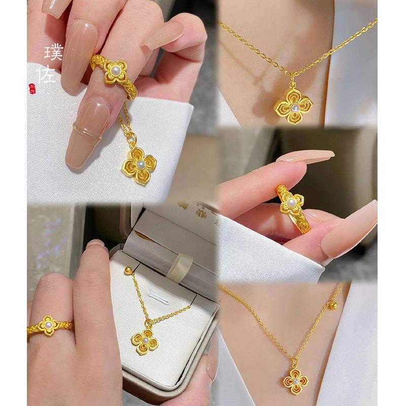 Tienda de oro con anillo abierto de perlas de flor ruyi de oro arenoso, lujo ligero exquisito, moda, regalo para novia