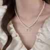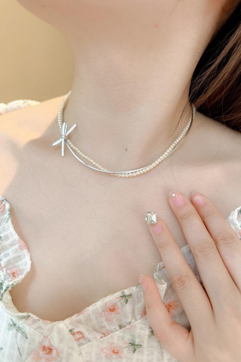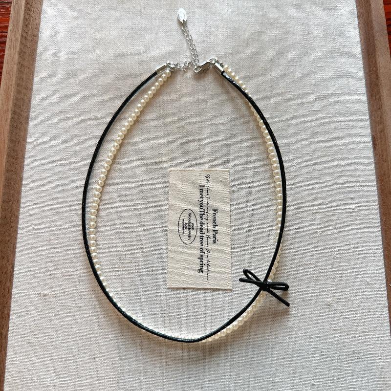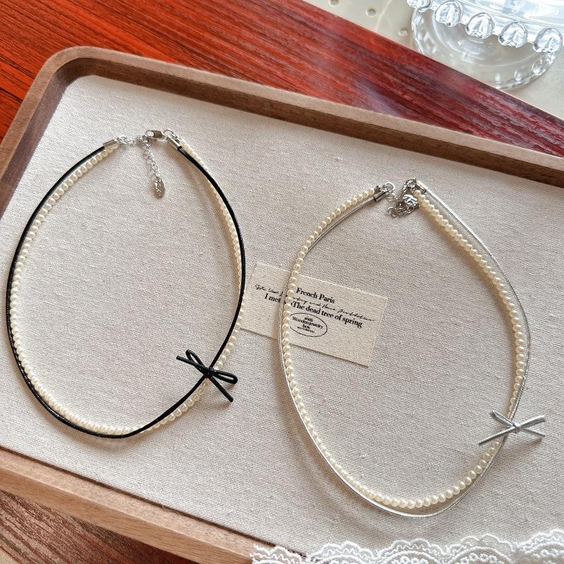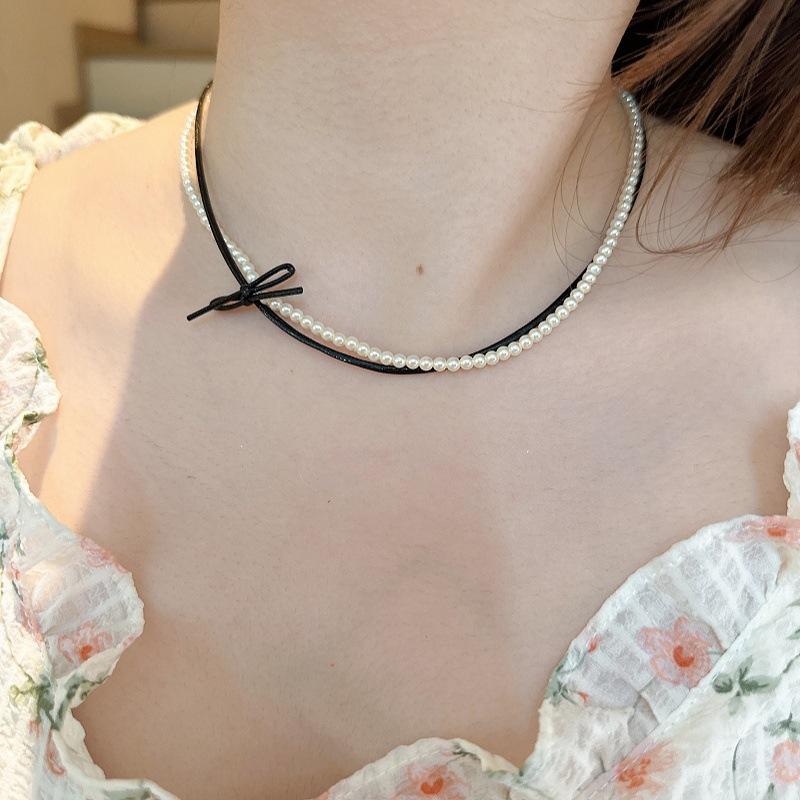 Collar de cuerda de cuero con cadena de perlas y lazo plateado, estilo elegante y versátil, novedad de 2024.