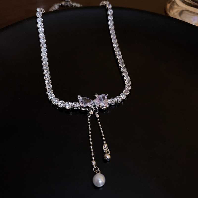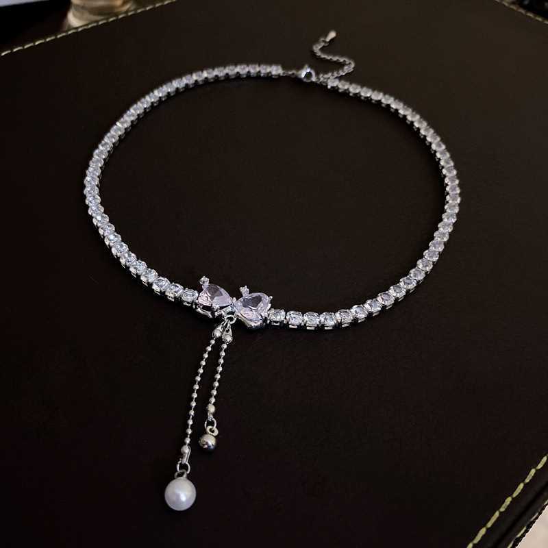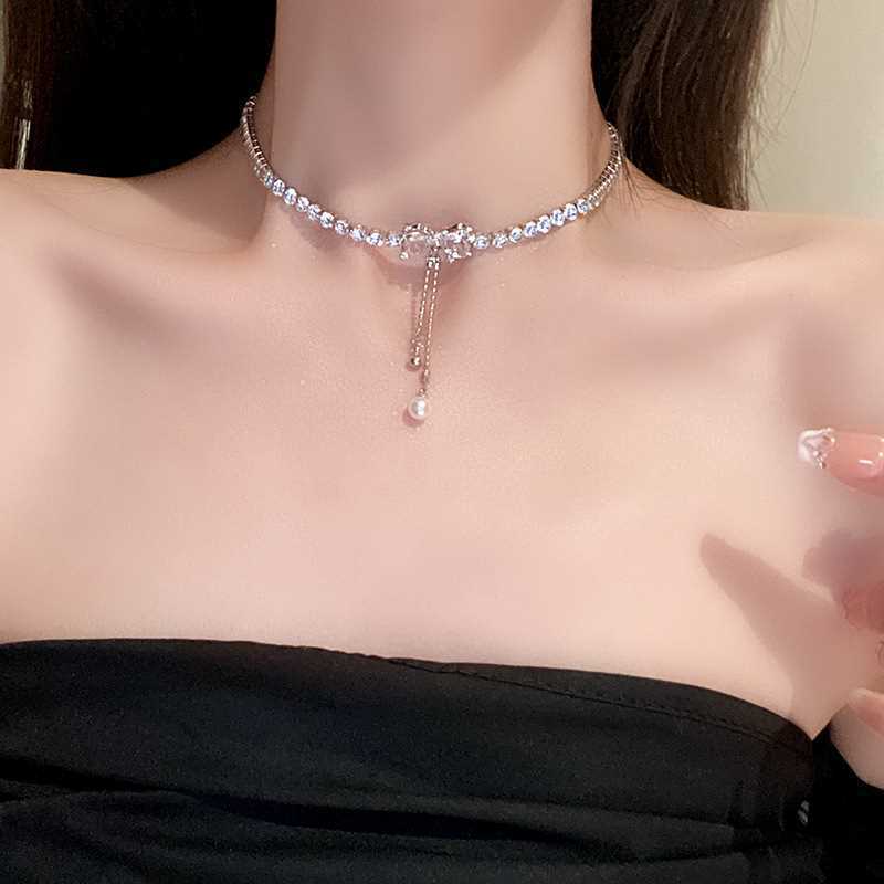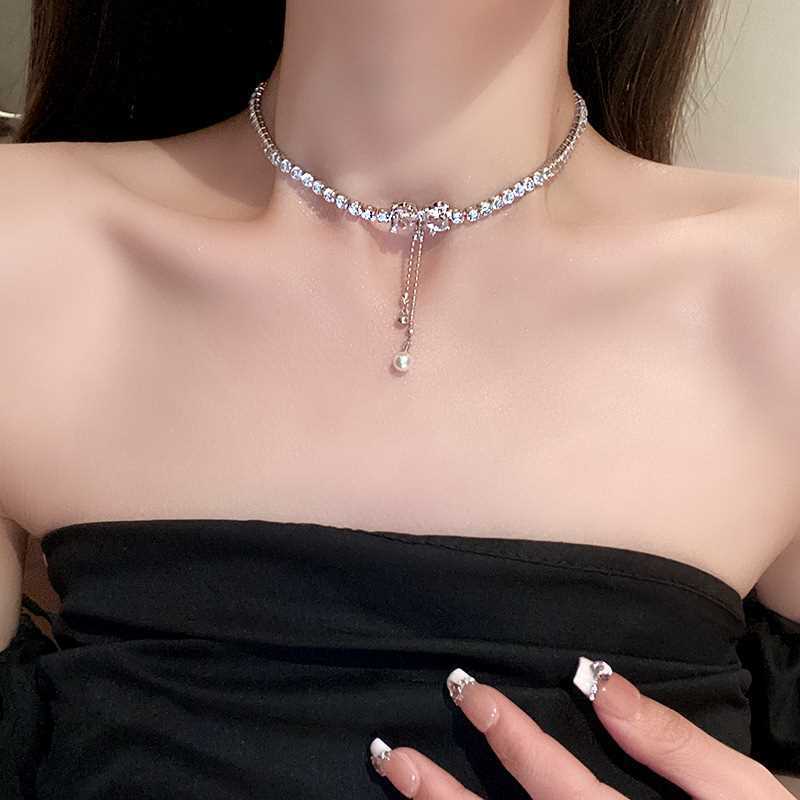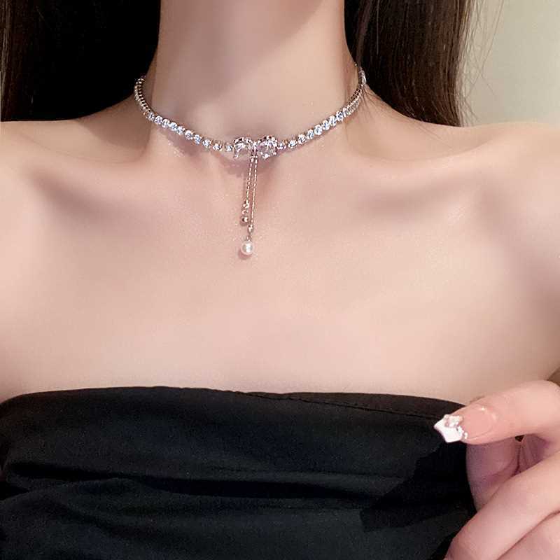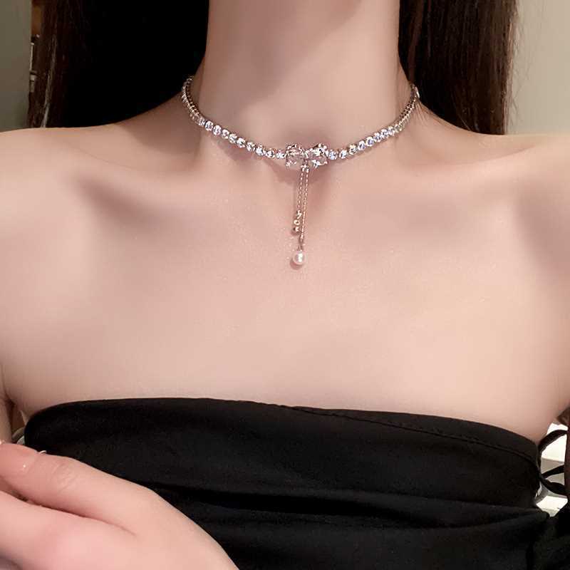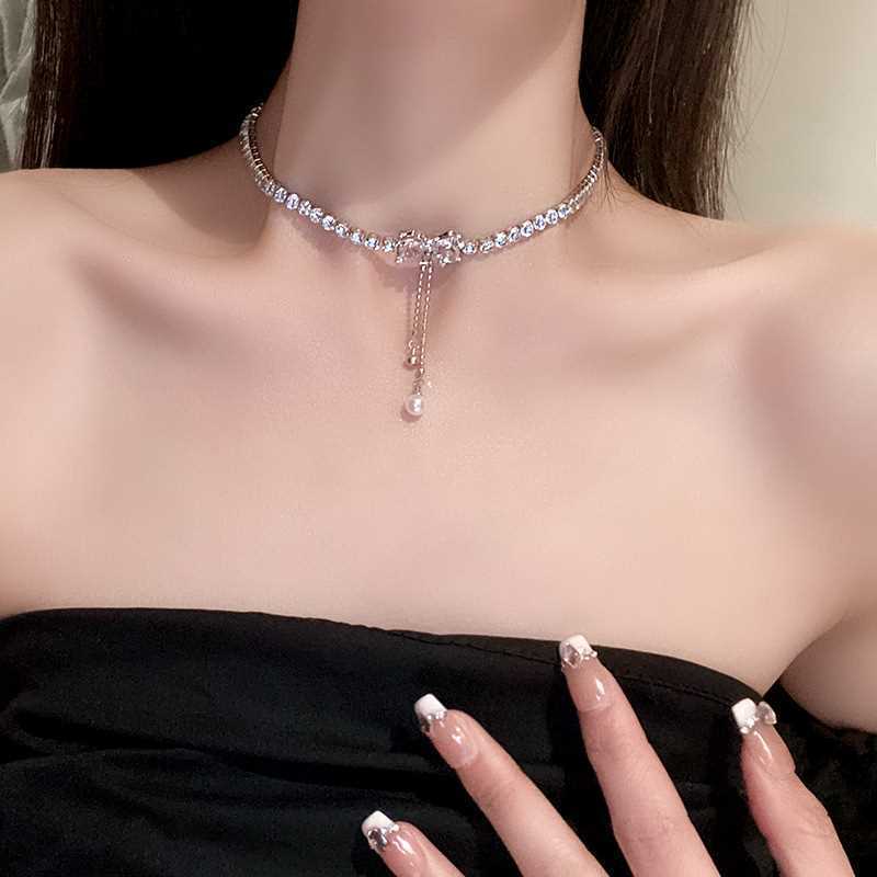 Collar de perlas con lazo para mujer, diseño de nicho de lujo ligero y combinable, nuevo estilo 2023, collar con cadena de clavícula.