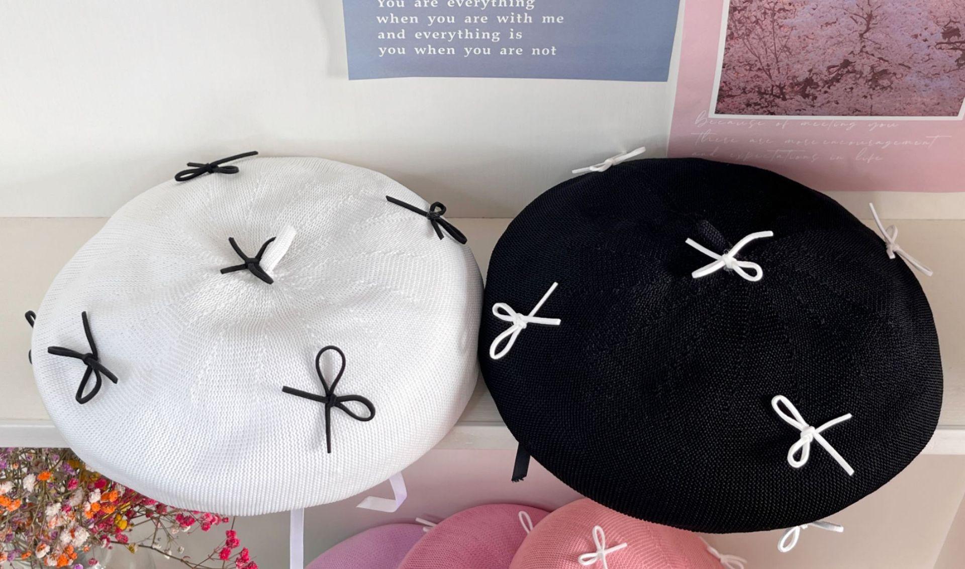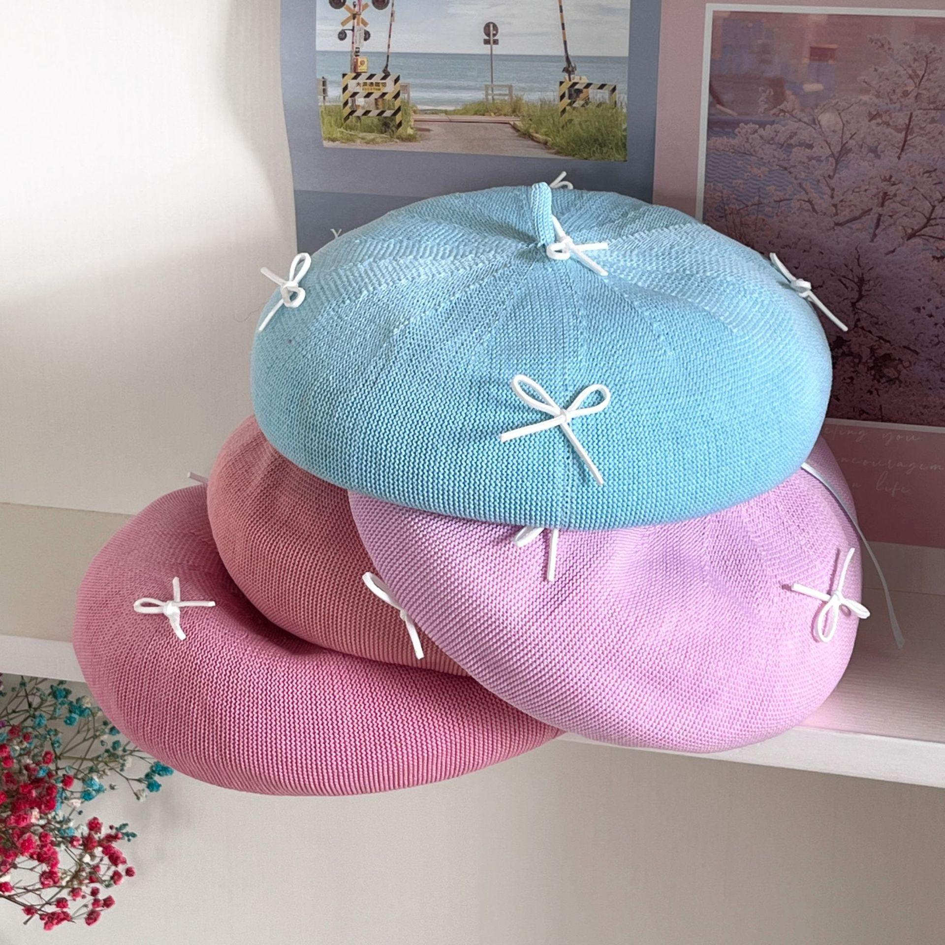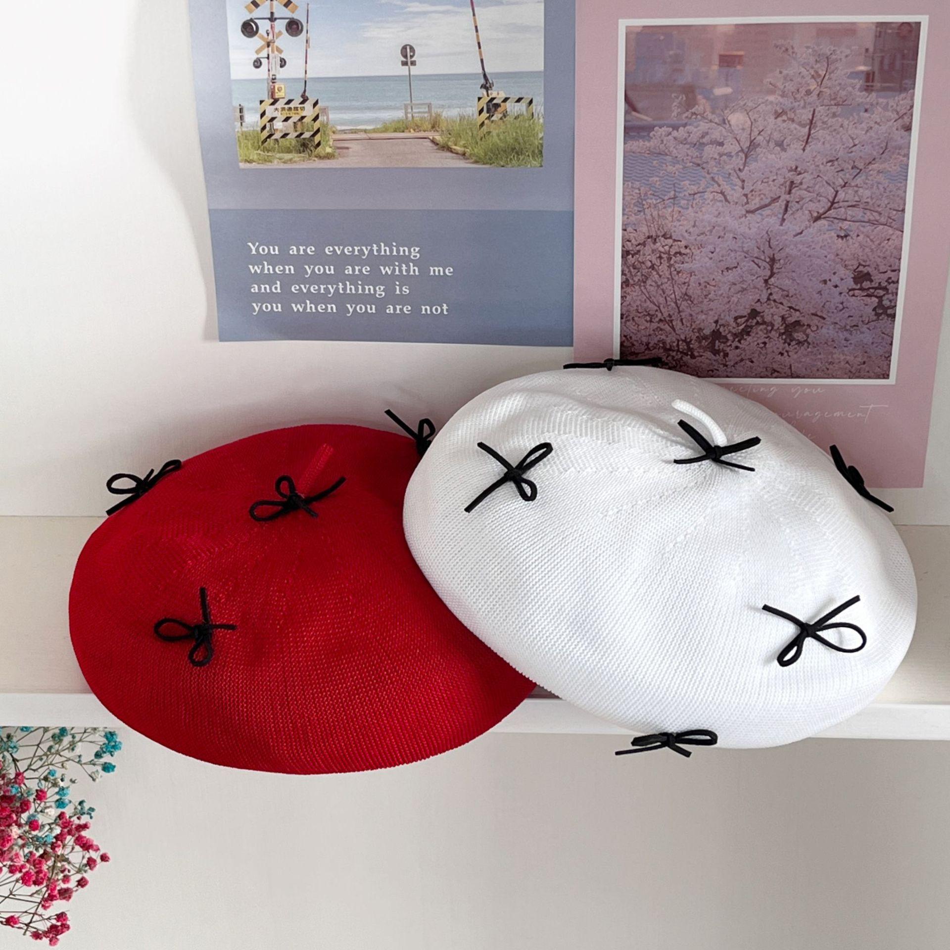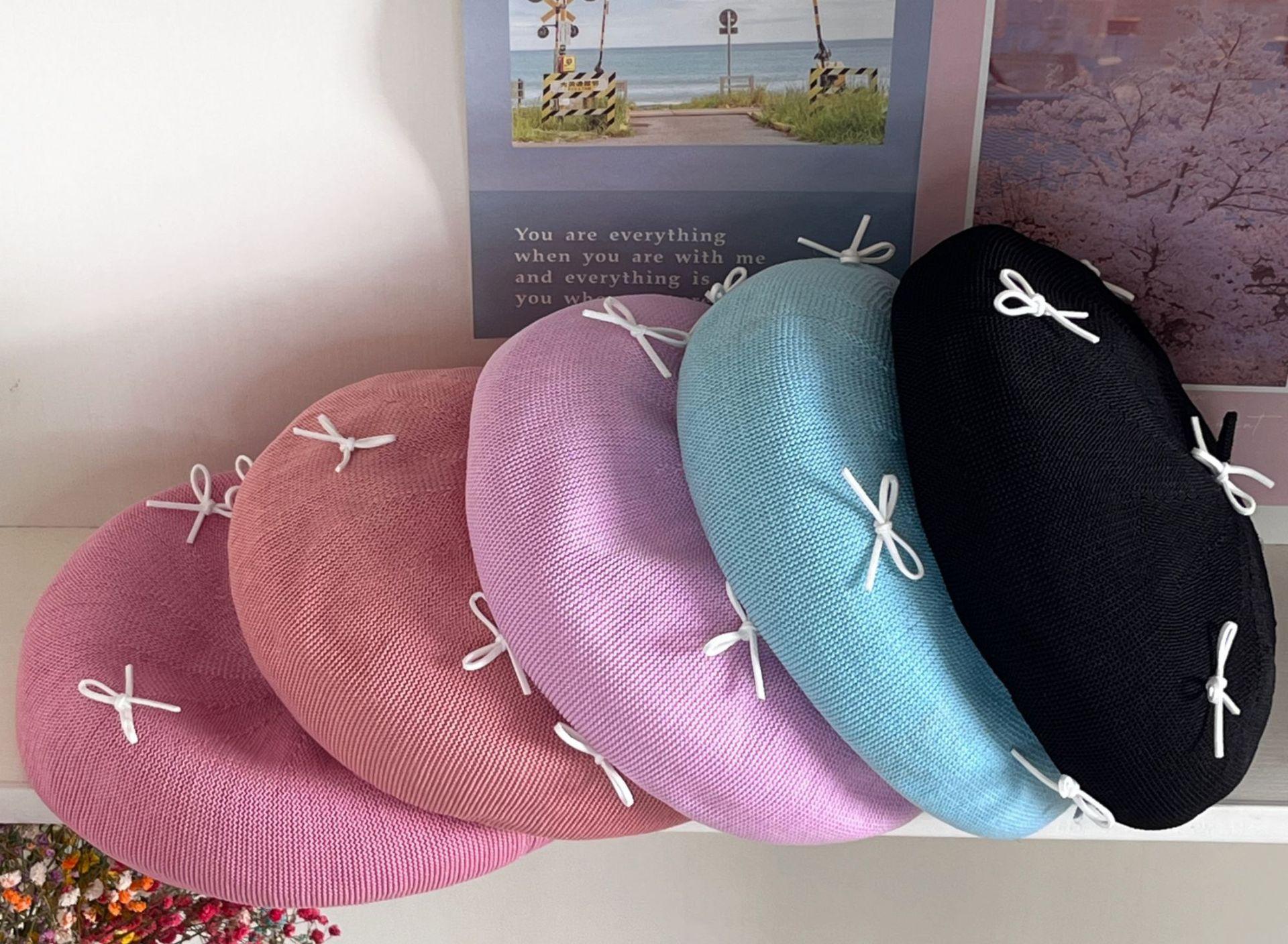 Black Summer beret + white bow, Cream blue summer beret + white bow, Pink purple summer beret + white bow, Goo...