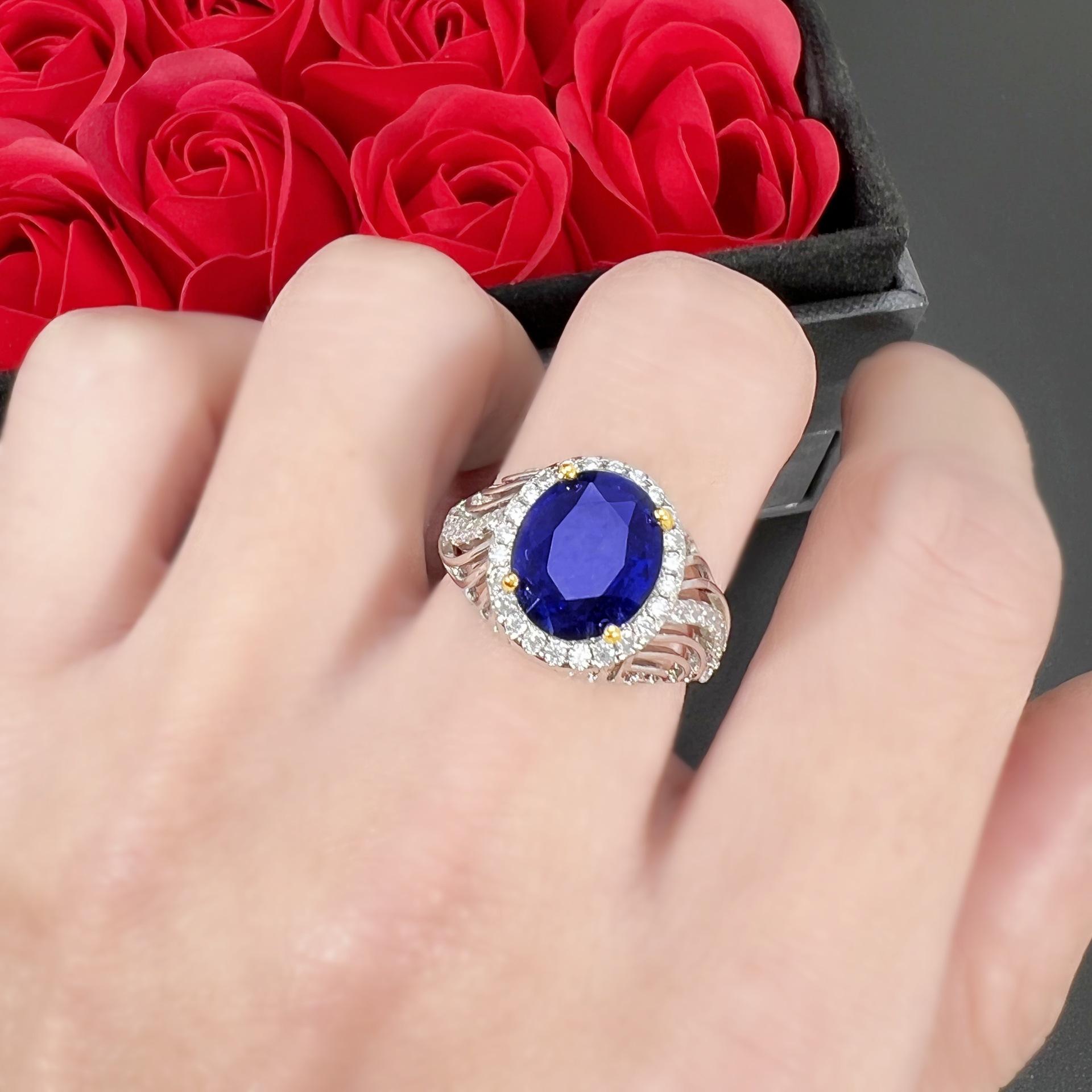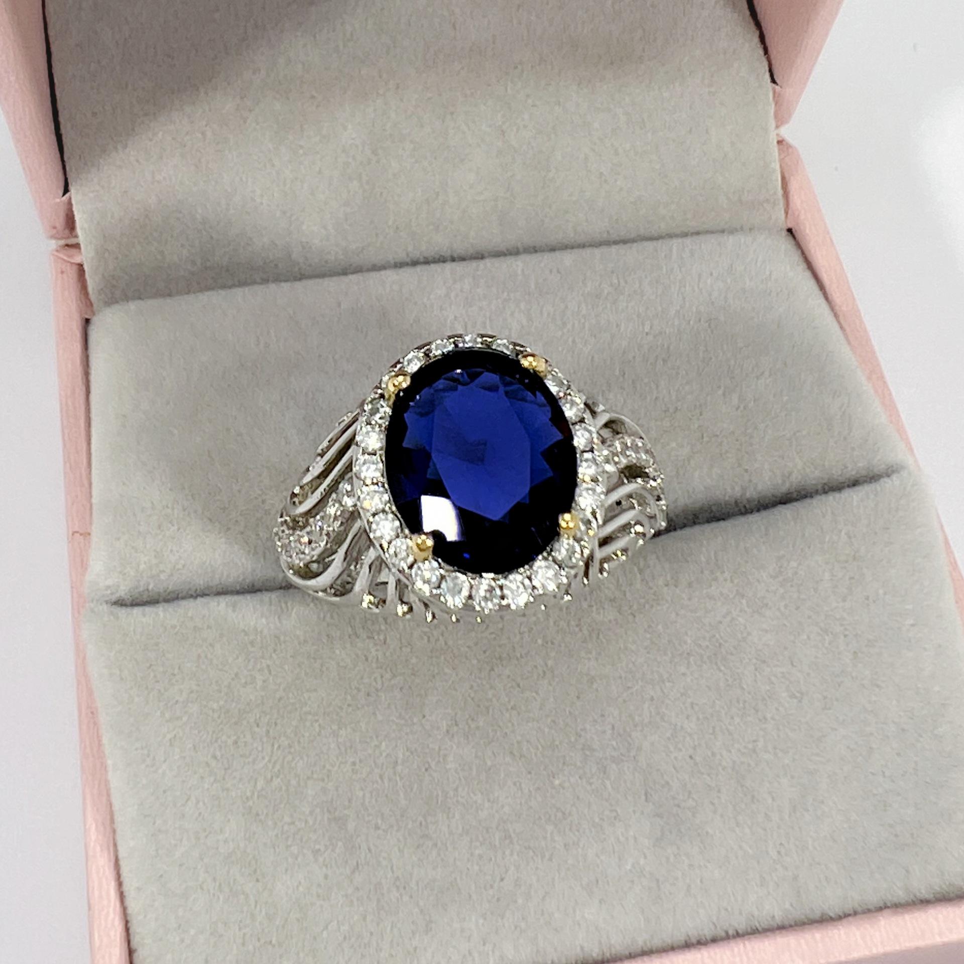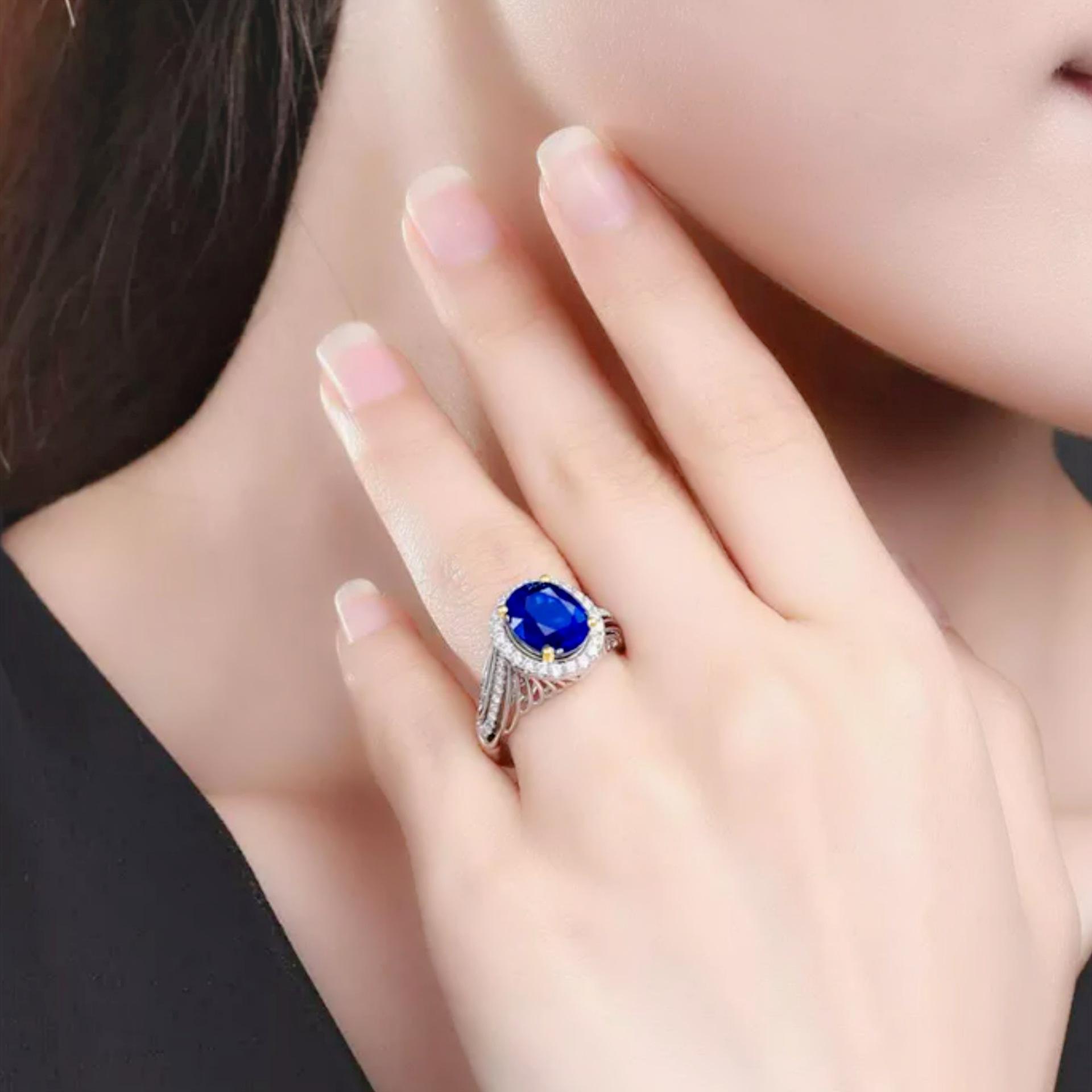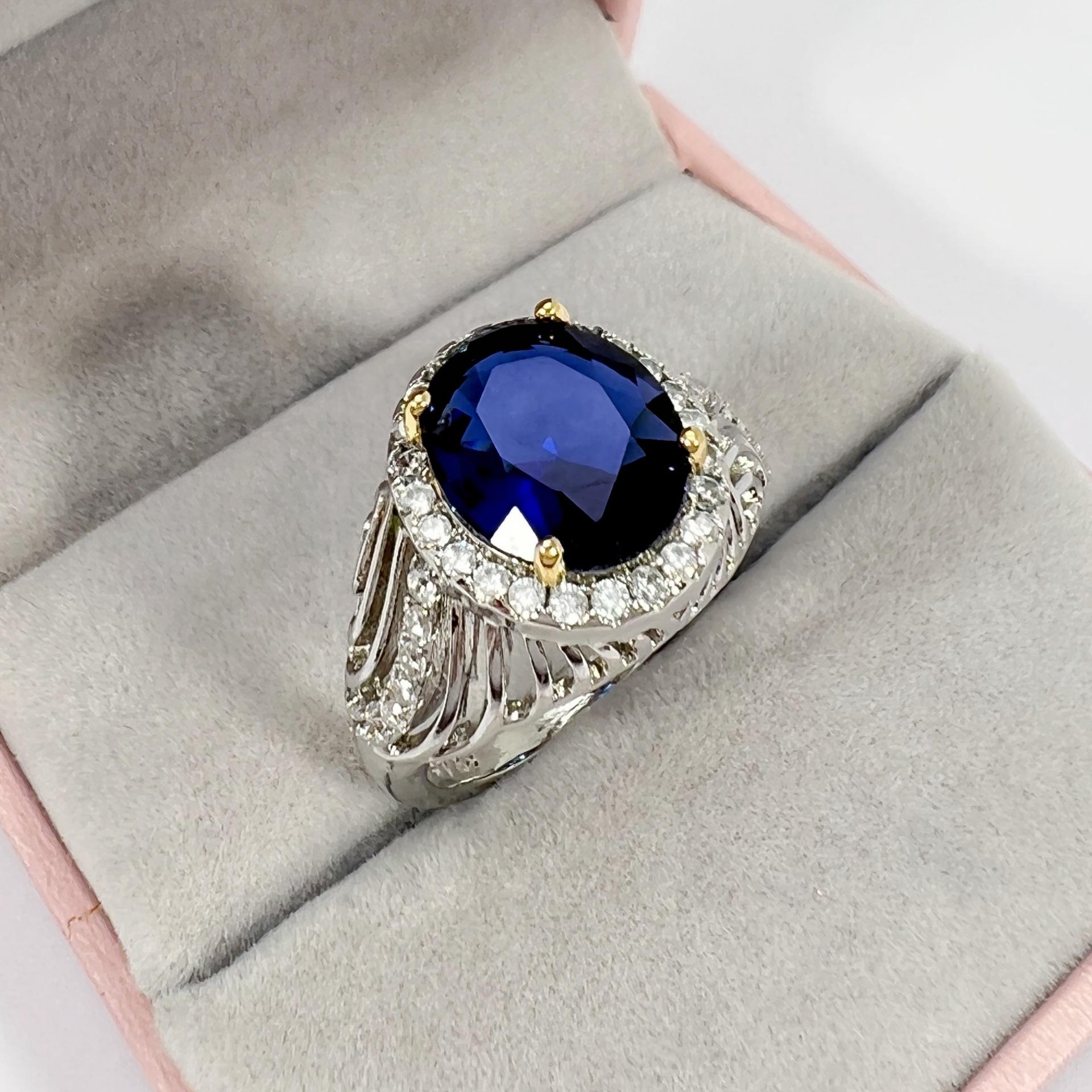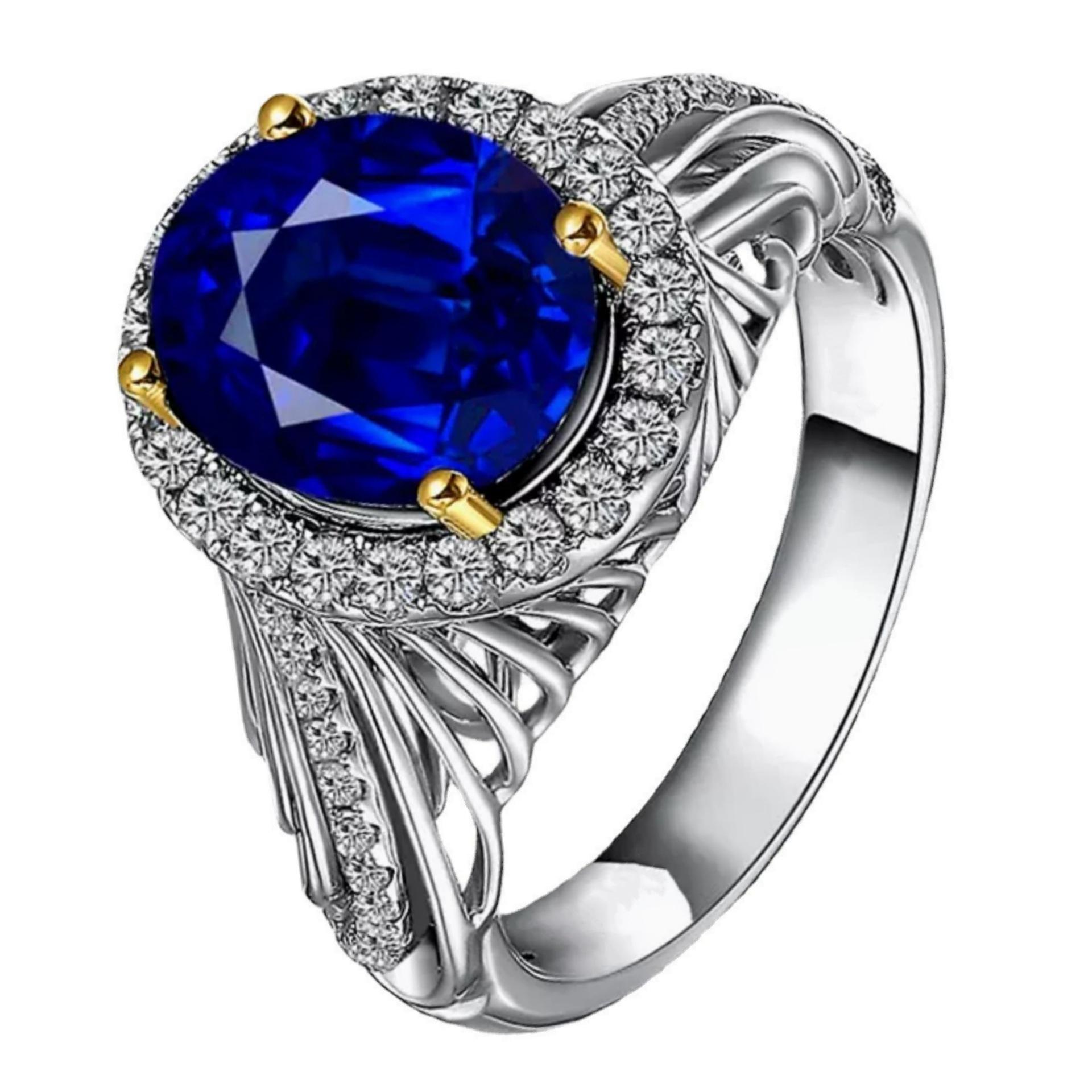 Anillo de Zafiro Natural Imitación Chapado en Dos Colores Chapado en Oro de 18K Lujoso Anillo de Diamantes Azules Panal con Recorte de Diamante
