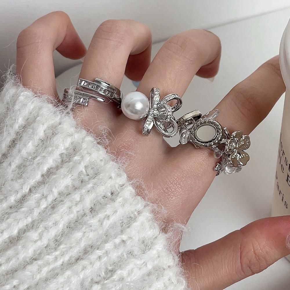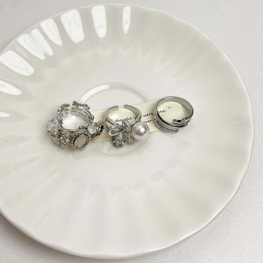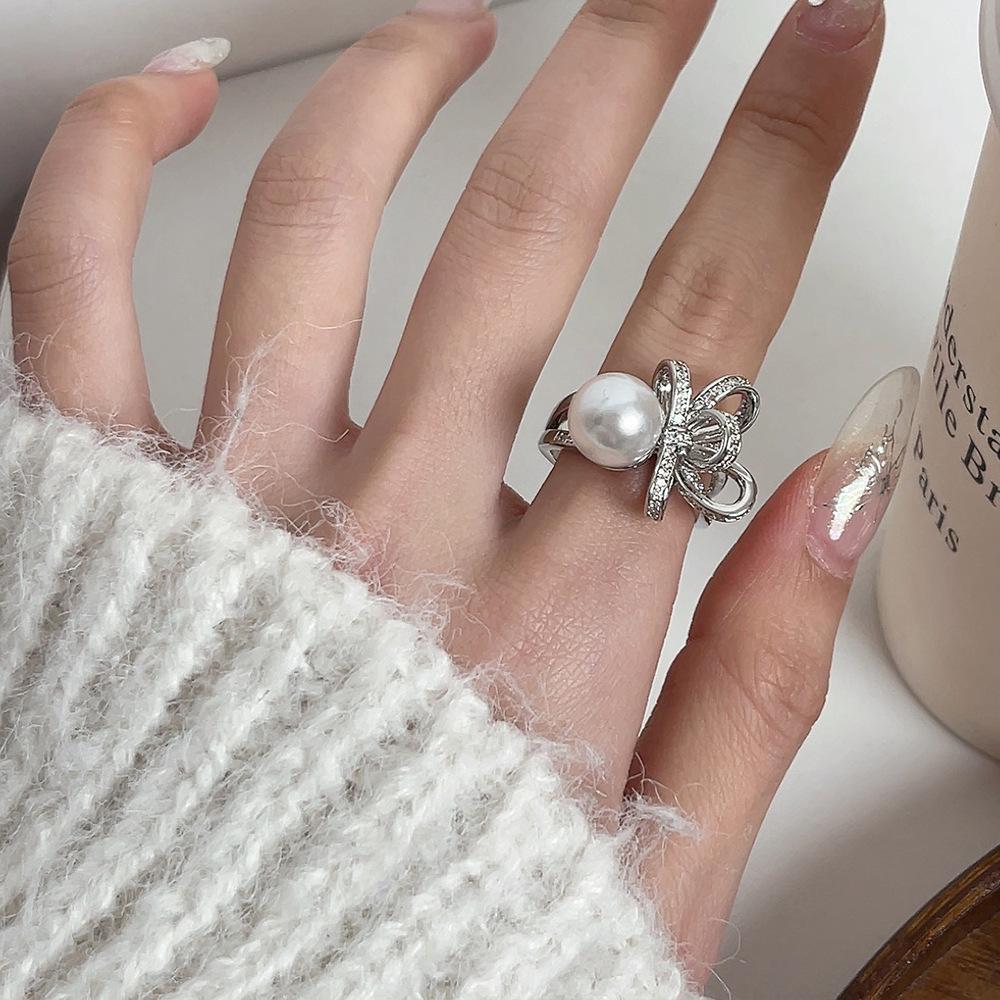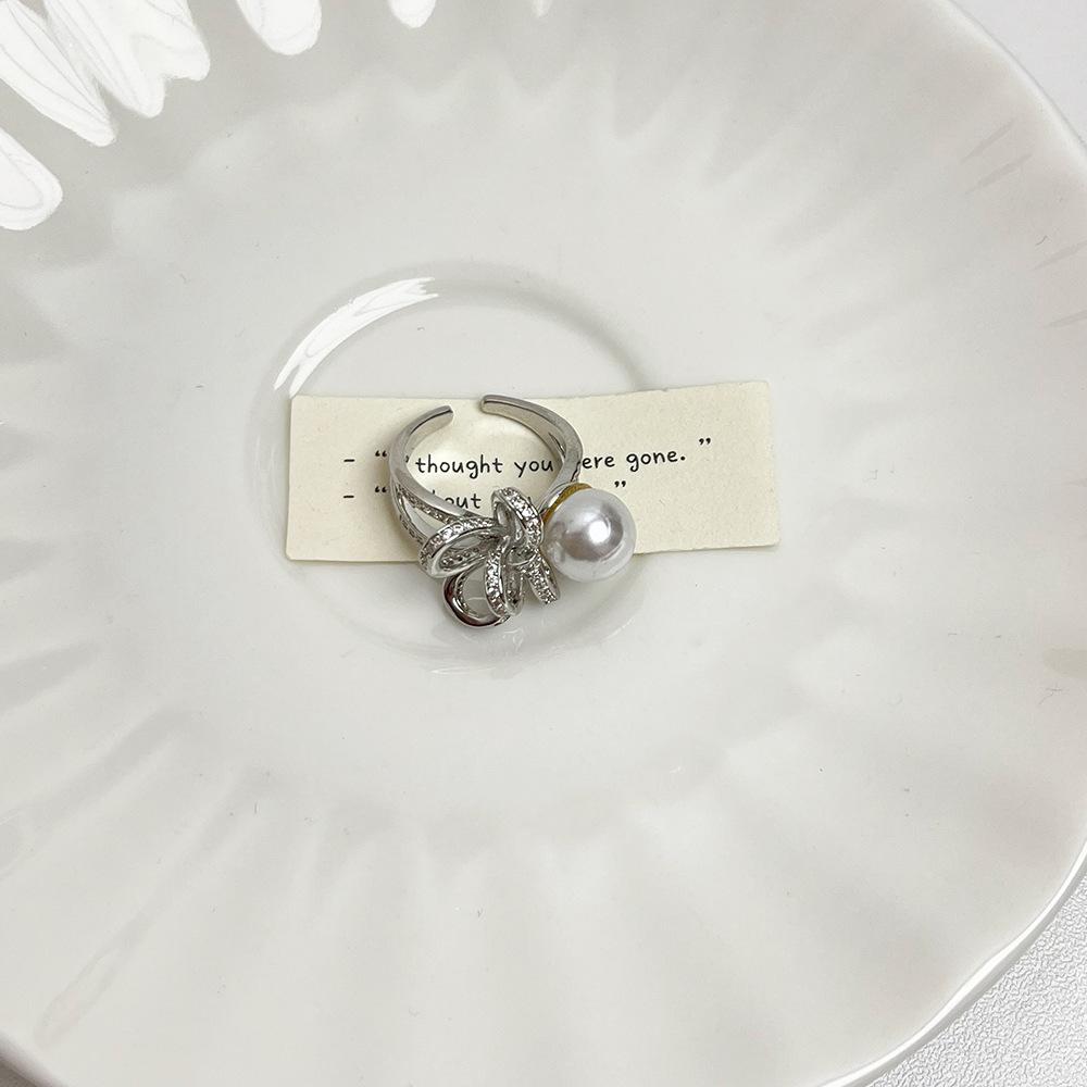 Anillo de perla con lazo de diamantes completo en un diseño abierto elegante y exquisito de lujo con luz que combina con todo.