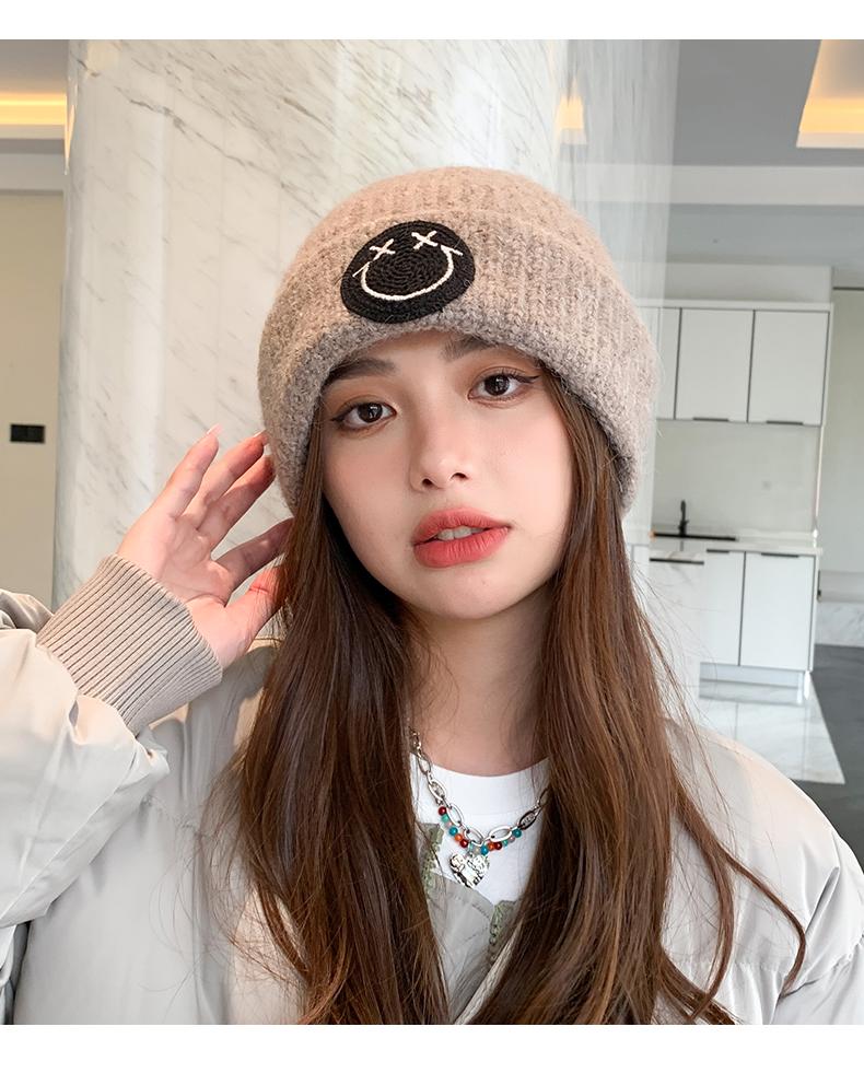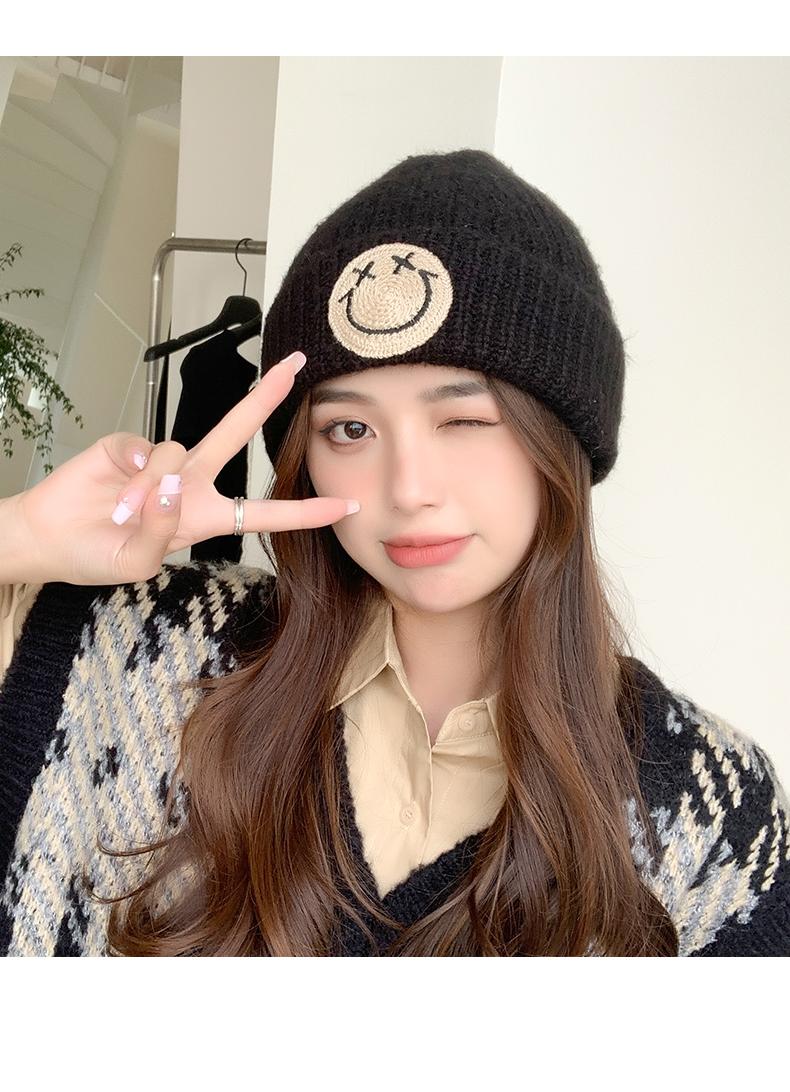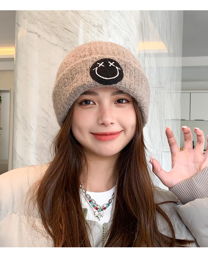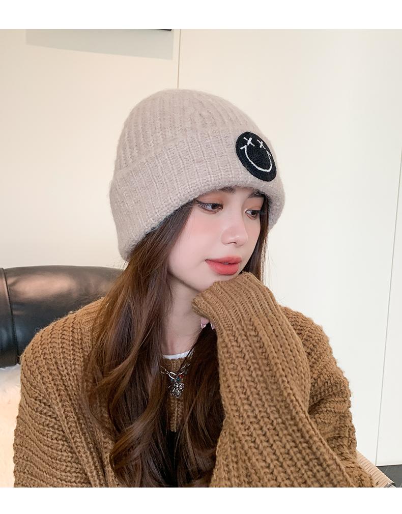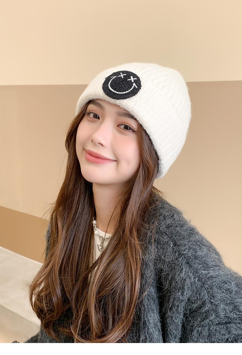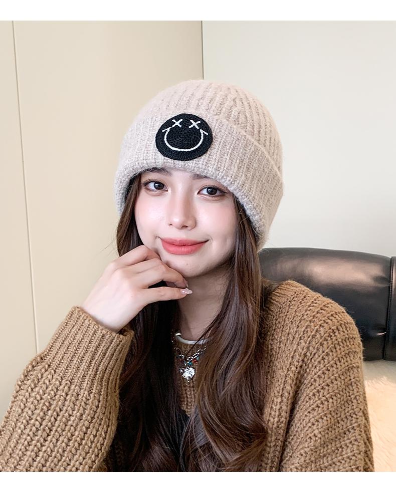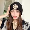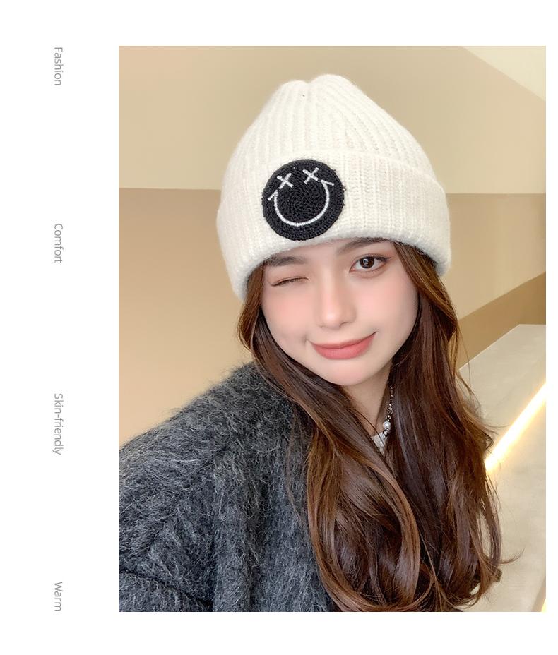 Gorro de lana para mujer, otoño e invierno, con cara sonriente, moda coreana, pequeño, cálido, suelto, con protección para las orejas, gorro de punto frío