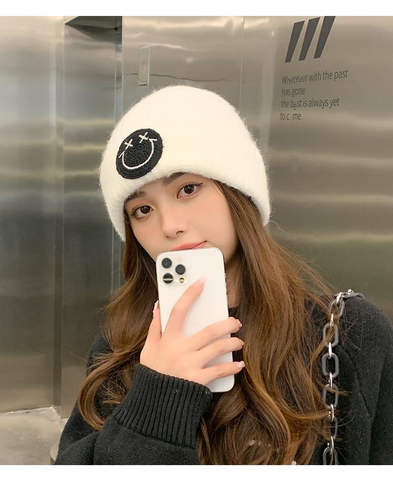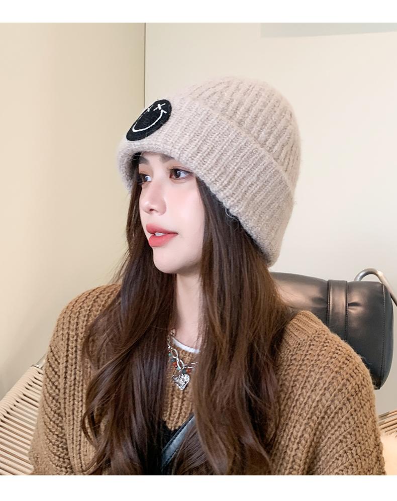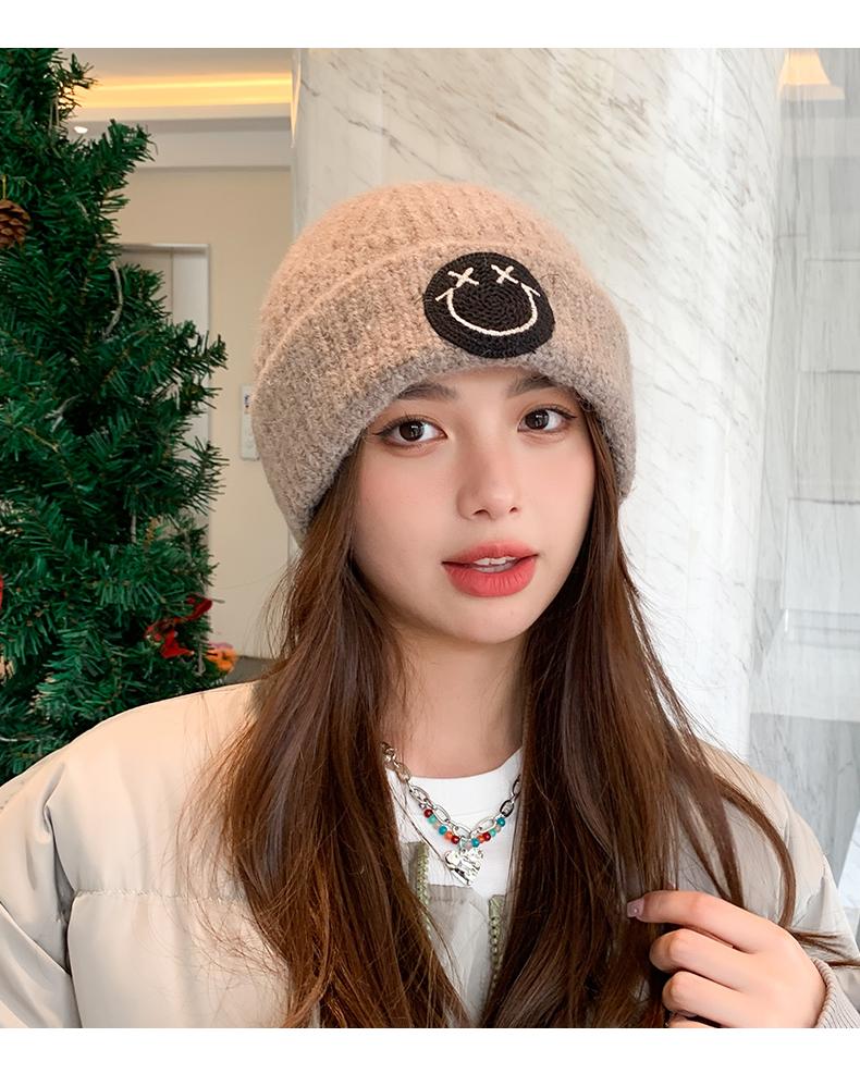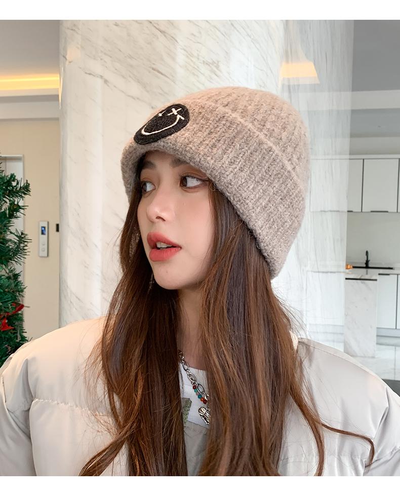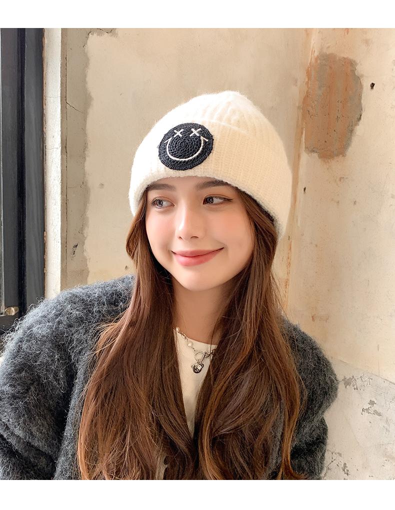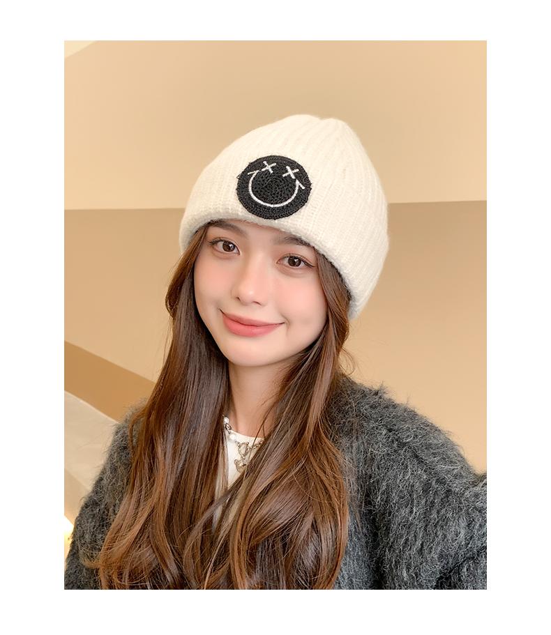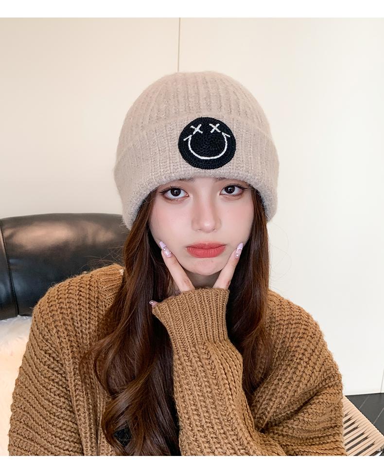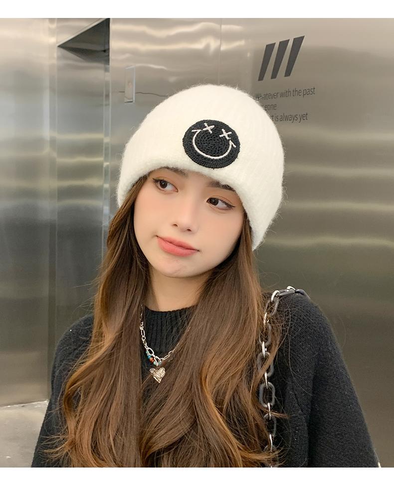Gorro de lana para mujer, otoño e invierno, con cara sonriente, moda coreana, pequeño, cálido, suelto, con protección para las orejas, gorro de punto frío