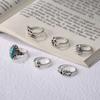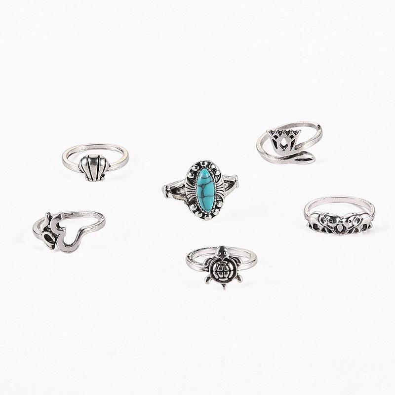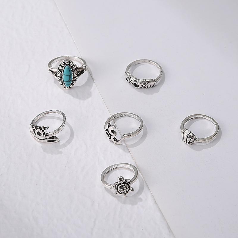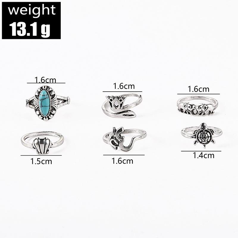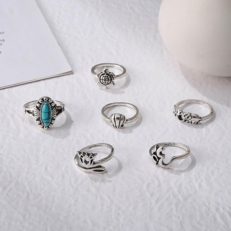 Anillos Transfronterizos Europeos y Americanos Retro Exportación Corona Serpiente Turquesa Elefante Geométrico Juego de 6 Piezas de Anillos para Mujer al Mayoreo