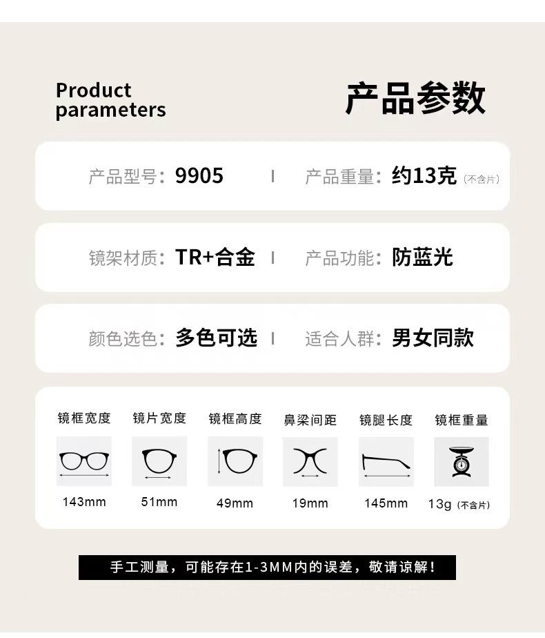 Armazón de gafas al por mayor 9905 Nuevo K-Style Tr90, Armazón de gafas redondo retro de moda, Espejo plano literario moderno