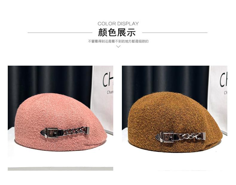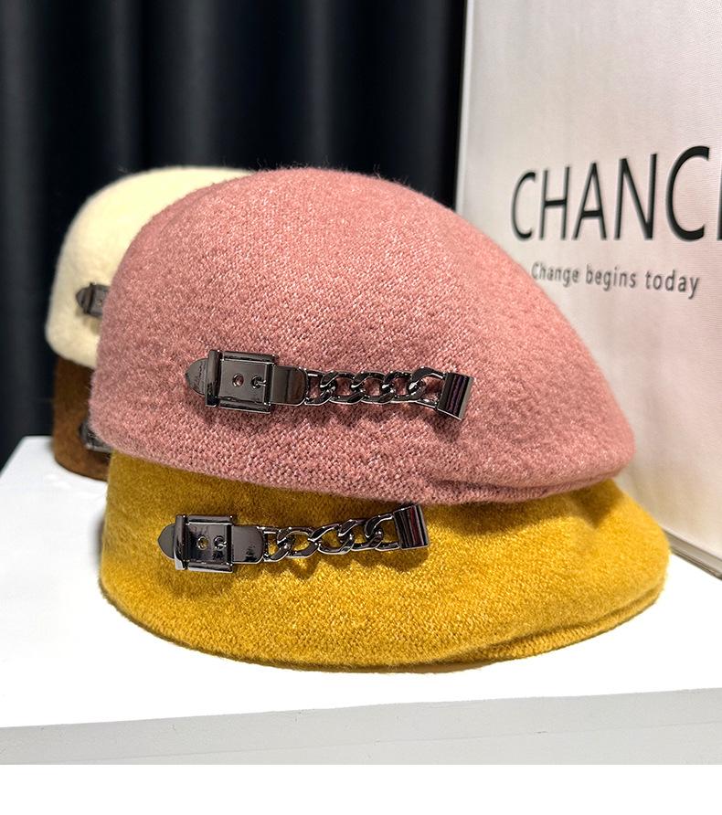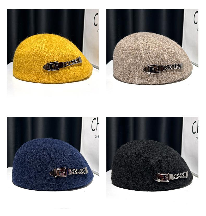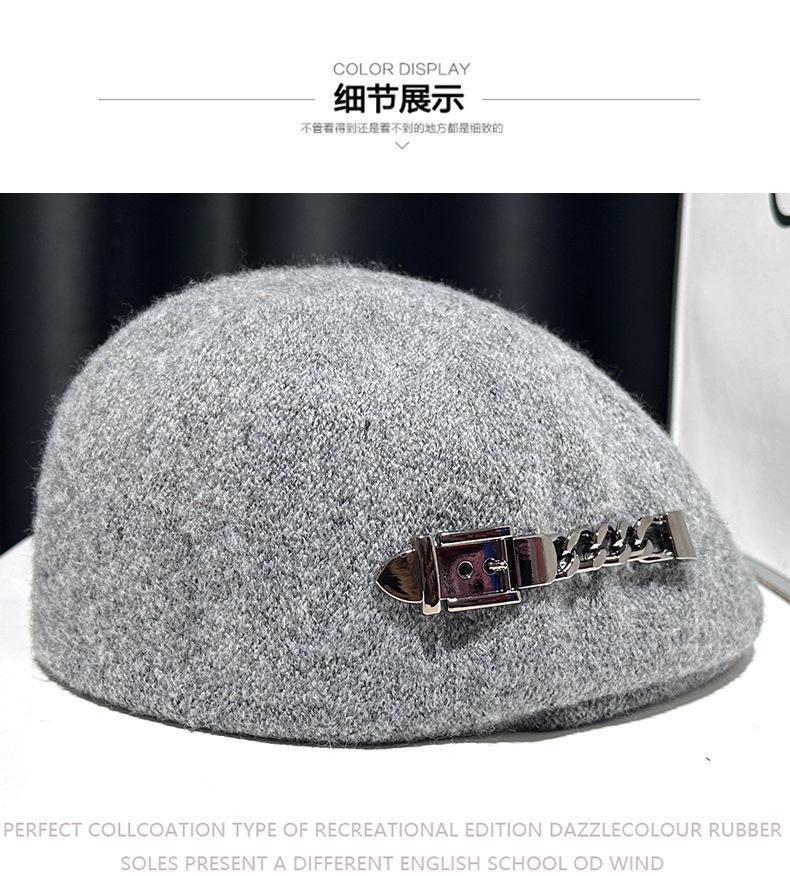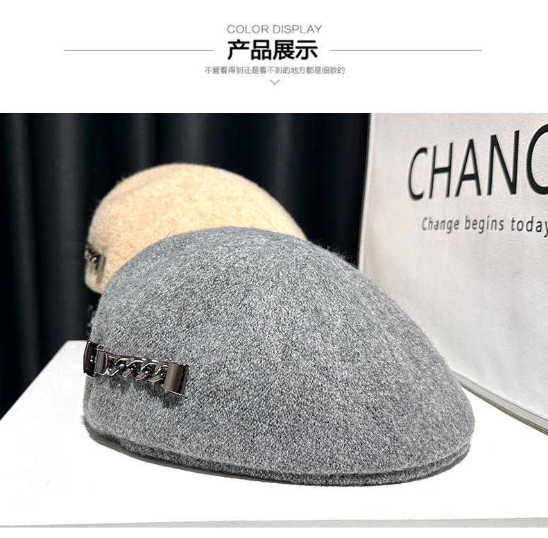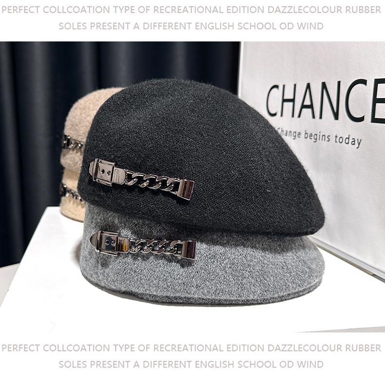 Boina de mezcla de lana para mujer primavera y otoño sombrero negro elegante red de cadena sombrero rojo que hace que la cara se vea pequeña anti-desgaste sombrero hacia adelante