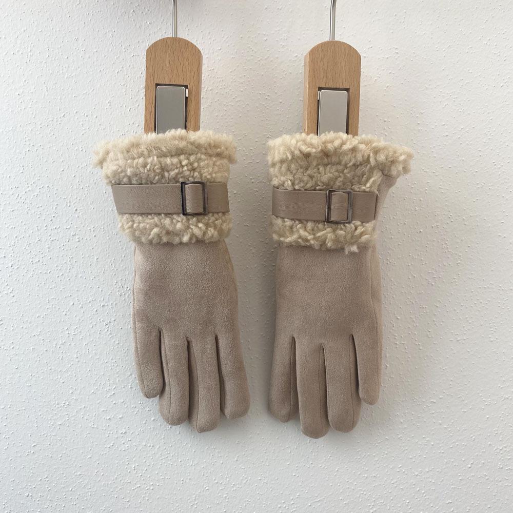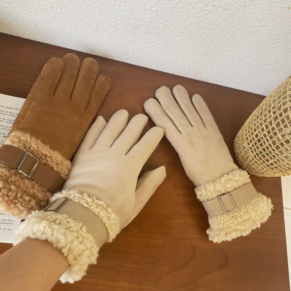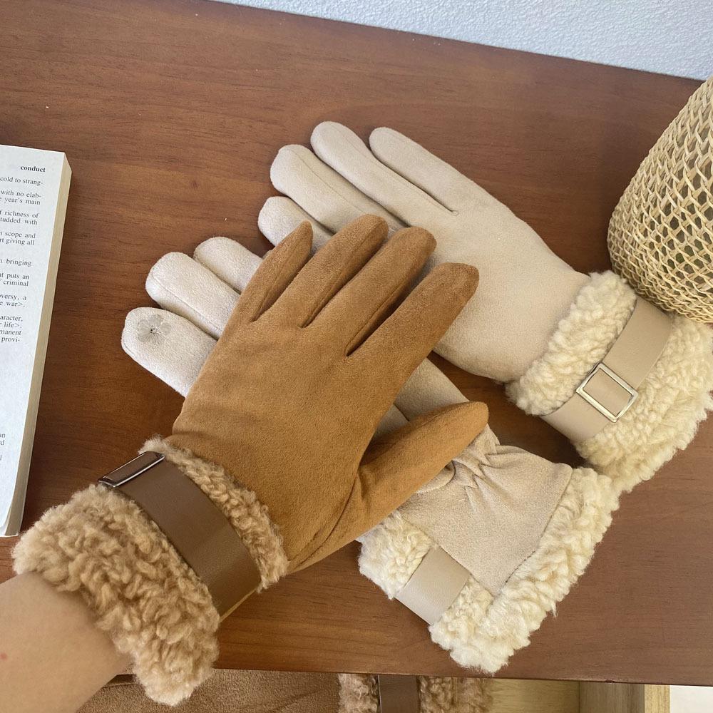 Guantes de gamuza decorativos con hebilla de cuero grueso para mujer, de invierno, de terciopelo, cálidos y resistentes al frío, para ciclismo con pantalla táctil.